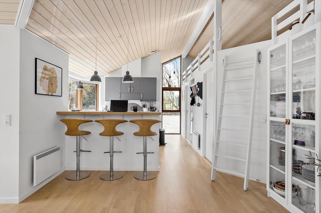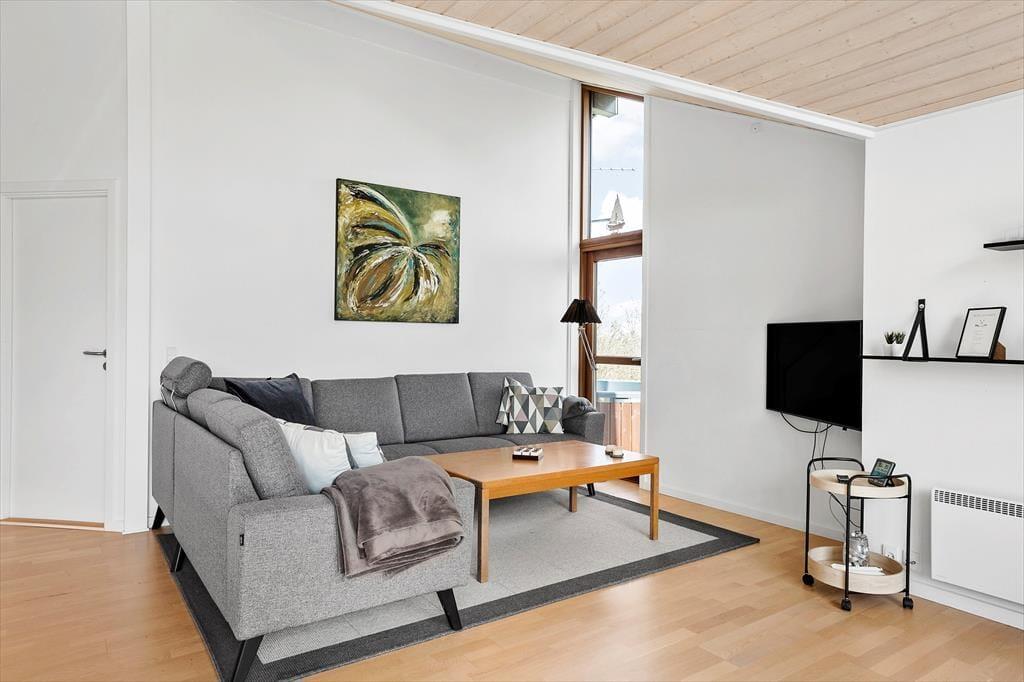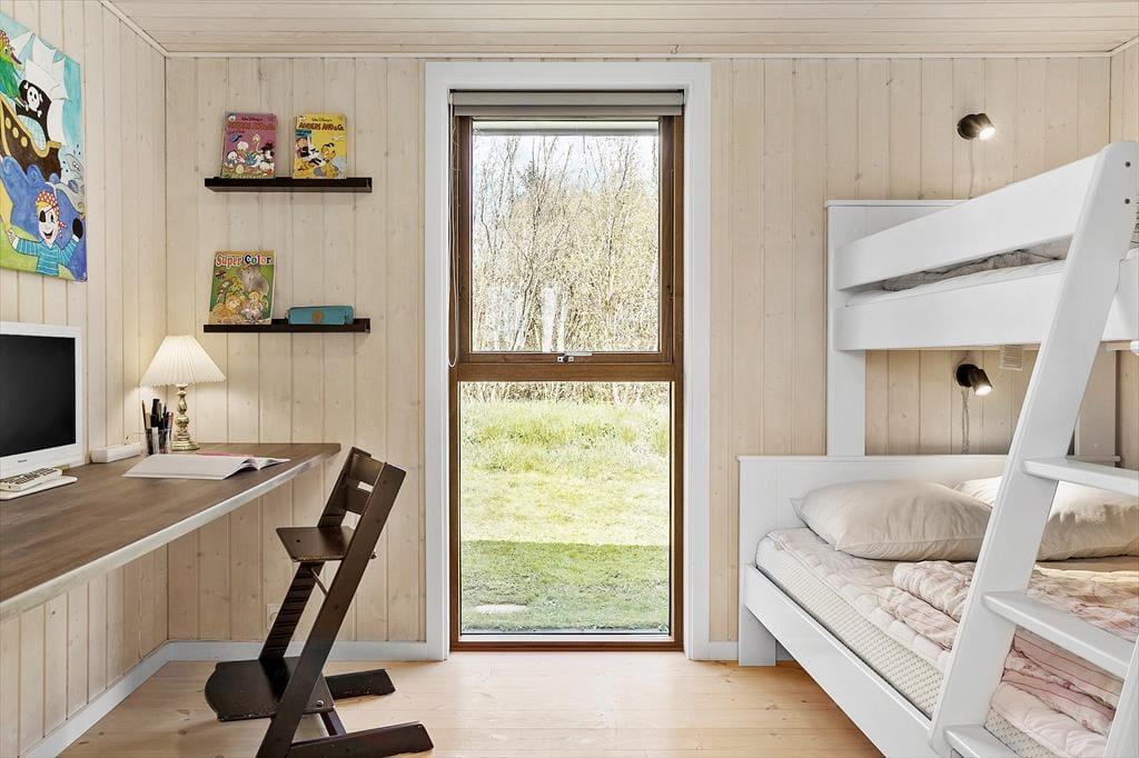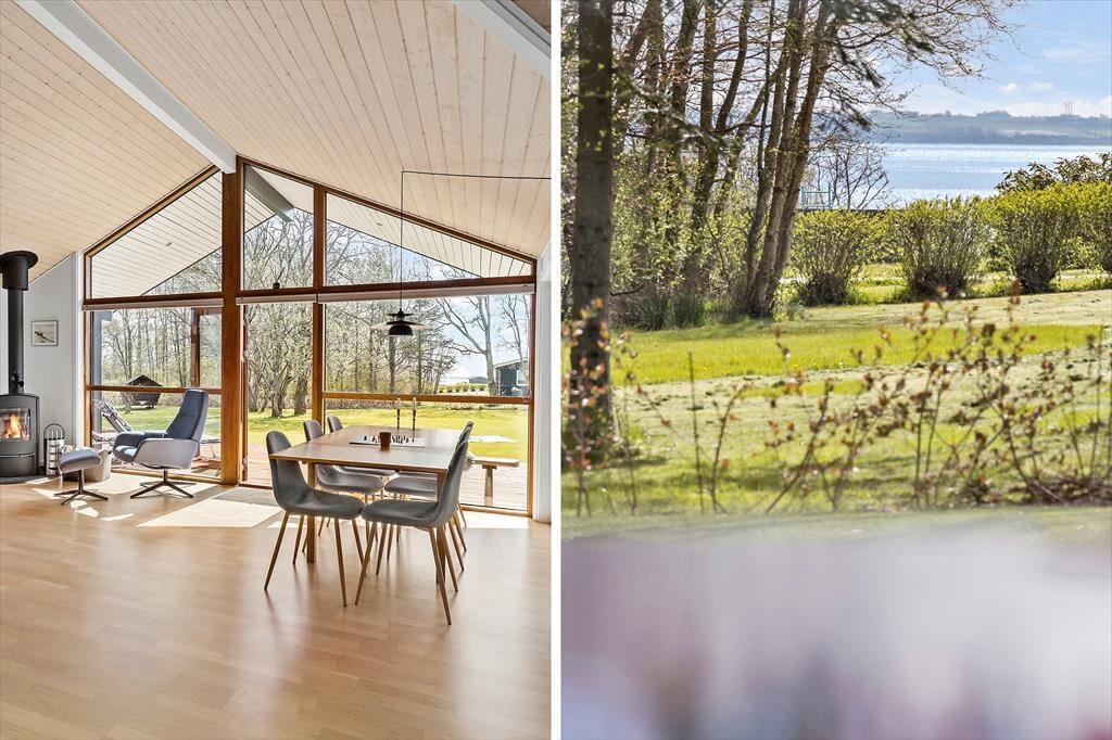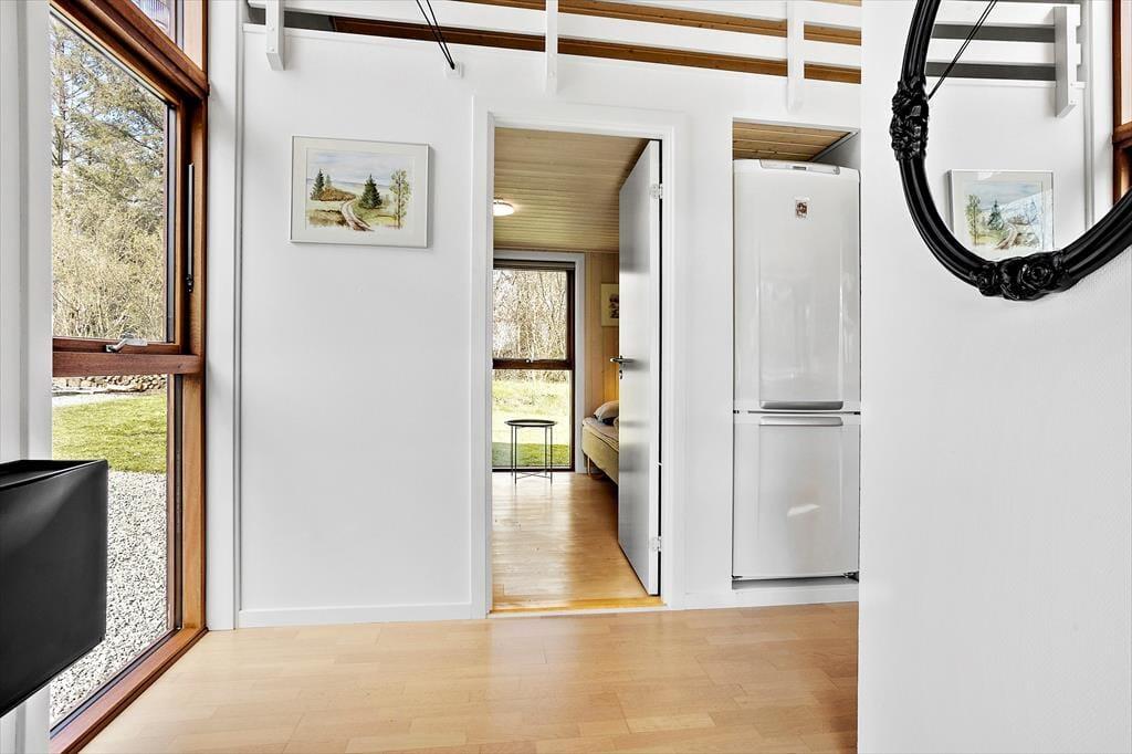 Med sin komfortable indretning og gode atmosfære står sommerhuset klar til at give dig lige det afbræk fra hverdagen, som du har brug for. Der er brændeovn i stuen til eventuelle kølige dage, og når solen skinner udenfor, kan du sætte dig i en solstråle, mens du læser i en lænestol eller spiller brætspil ved spisebordet med børnene. Gennem de store vinduer har du udsigt til høje, flotte løvtræer og den grønne grund. Et veludstyret køkken er integreret med stuen, og derudover byder planløsningen på tre soveværelser og et pænt brusebadeværelse.
