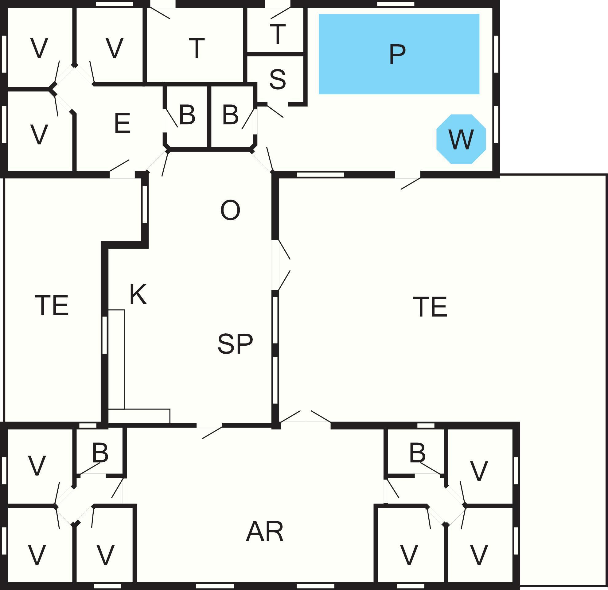 9 Soveværelser: (1DS)+(1DS)+(1DS)+(2S)+(2S)+(2S)+(2S)+(2S)+(2S), barneseng