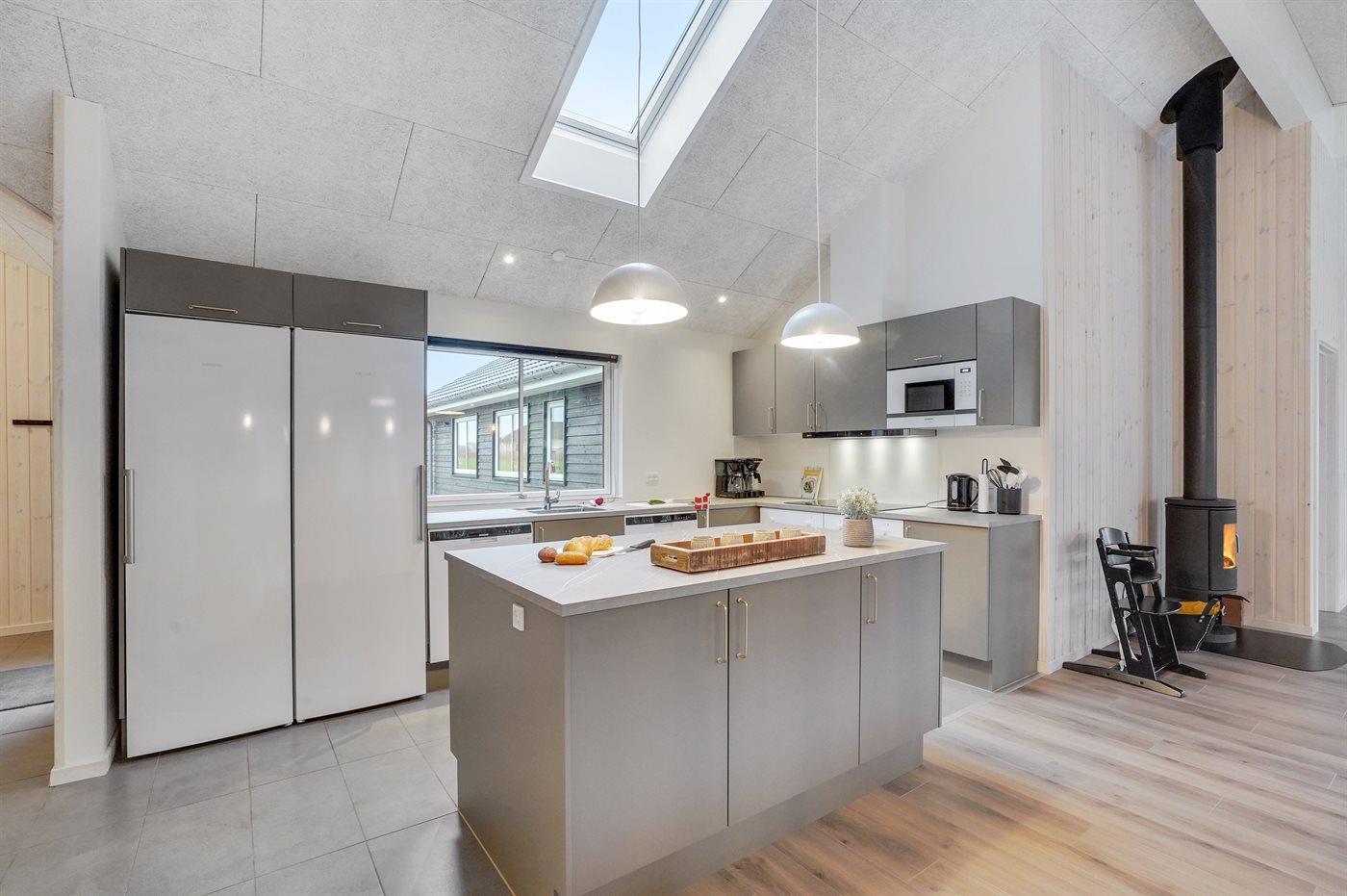 Huset er udstyret med et XL-køkken, således der er god plads til at flere kan samles om madlavningen. Køkkenet er bl.a. udstyret med to opvaskemaskiner, to ovne, to vaske, ekstra komfurplads og køle/fryseskabe. I forlængelse af køkkenet/spisestuen finder I sommerhusets sofaafdeling, hvor aftenerne kan nydes i komfortable møbler med brændeovnens hyggelige buldren i baggrunden.