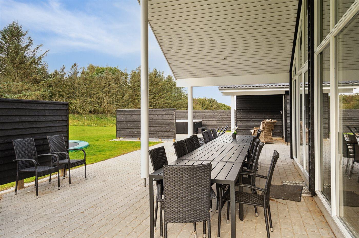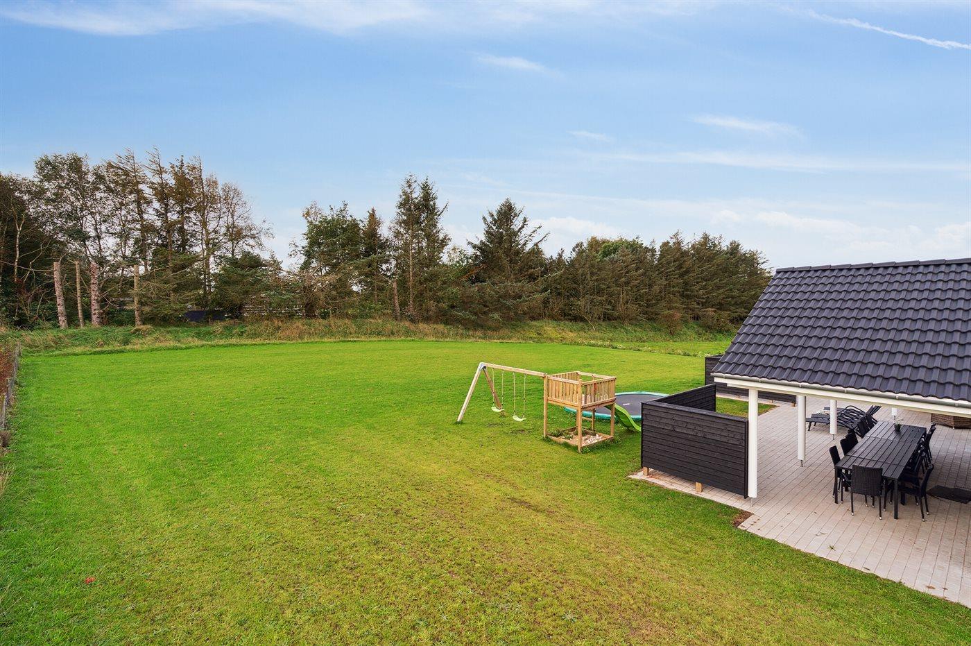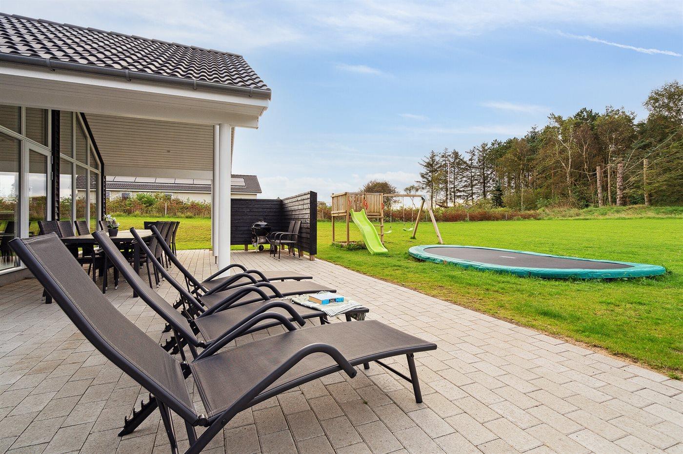 De udendørs faciliteter er som nævnt lige så mangfoldige som de indendørs. På grunden findes der trampolin, sandkasse og gynge. På terrassen, som er delvist overdækket og dermed gør det muligt at sidde ude selvom vejret ikke viser sig fra sin bedste side, finder I både havemøbler og grill.