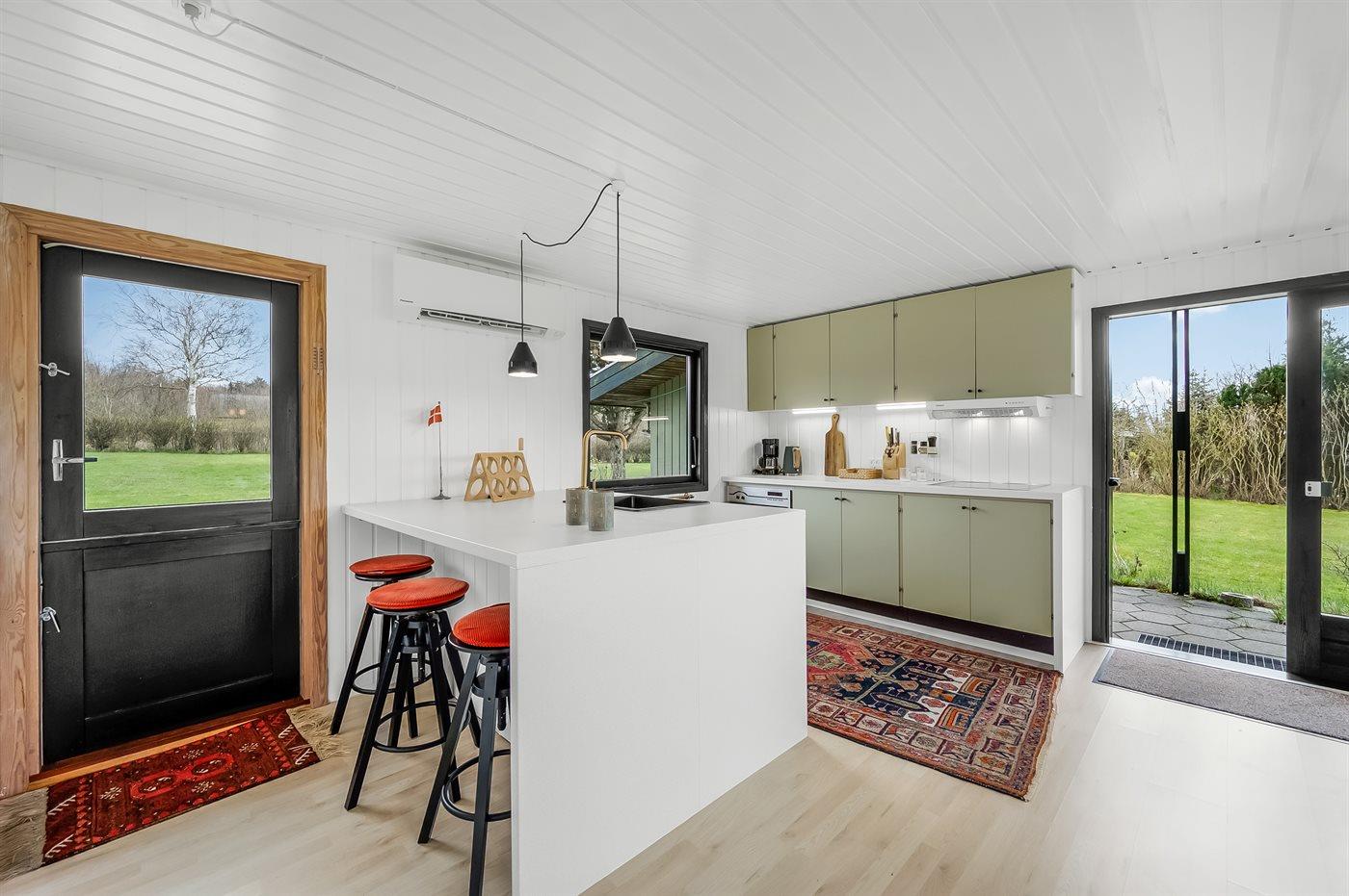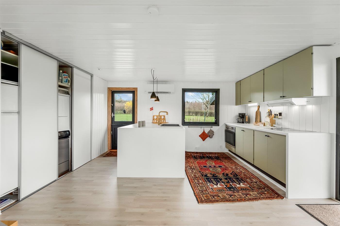 Køkkenet er udstyret med 1 køleskab. Der er 4 keramiske kogeplader, varmluftovn, mikrobølgeovn samt opvaskemaskine.