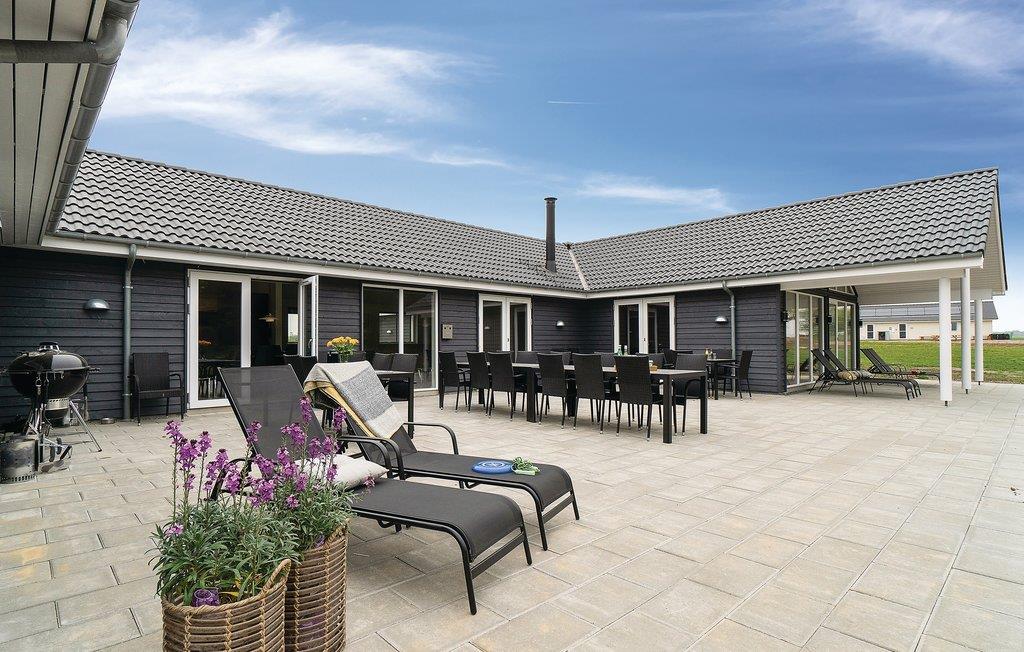 I den hyggelige sofakrog i det centrale fællesrum kan der slappes af foran fjernsynet efter en aktivitetsfyldt dag. I køkken/alrummet er der desuden et langt spisebord med plads til alle og et velindrettet køkken. Her er selvfølgelig dobbelt op på ovne, komfurer og opvaskemaskiner, så det bliver lettere at lave mad til mange mennesker. Huset har i alt 30 sovepladser, som er fordelt på fire soveafdelinger med hver tre soveværelser og et badeværelse og to hemse med plads til i alt seks overnattende gæster (bedst til børn). I alt har sommerhuset fem badeværelser. På den store og delvist overdækkede terrasse kan I grille og nyde den danske sol.