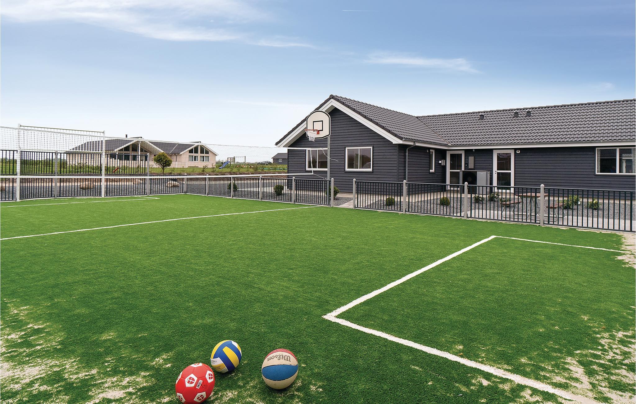 Stor luksuriøs feriebolig med pool, sauna, aktivitetsrum og adgang til multibane og legeplads tæt ved vandet.