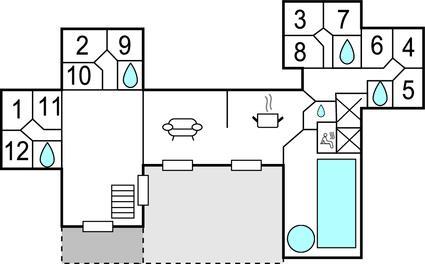 I den hyggelige sofakrog i det centrale fællesrum kan der slappes af foran fjernsynet efter en aktivitetsfyldt dag. Der er projektor og lærred, så I kan nemt skabe biografstemning. I køkken/alrummet findes desuden et langt spisebord med plads til alle samt et velindrettet køkken. Her er selvfølgelig dobbelt op på ovne, komfurer og opvaskemaskiner, så det bliver lettere at lave mad til mange mennesker. Huset har i alt 30 sovepladser, som er fordelt på fire soveafdelinger med hver tre soveværelser, et badeværelse og to hemse med plads til i alt seks personer (bedst til børn). Der er i alt fem badeværelser i feriehuset. På den store og delvist overdækkede terrasse kan I grille og nyde den danske sol. Her findes også en sandkasse og en trampolin.
