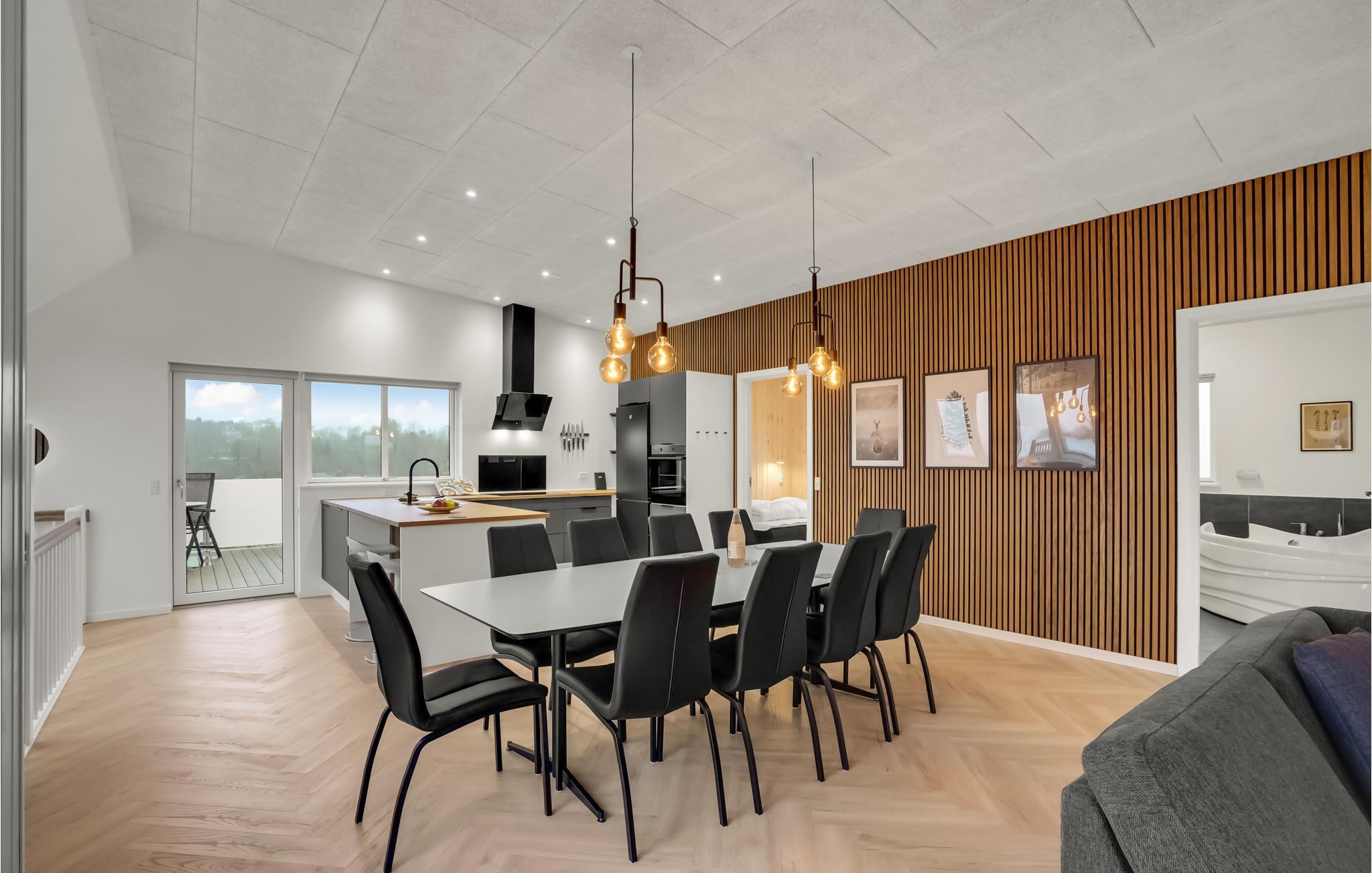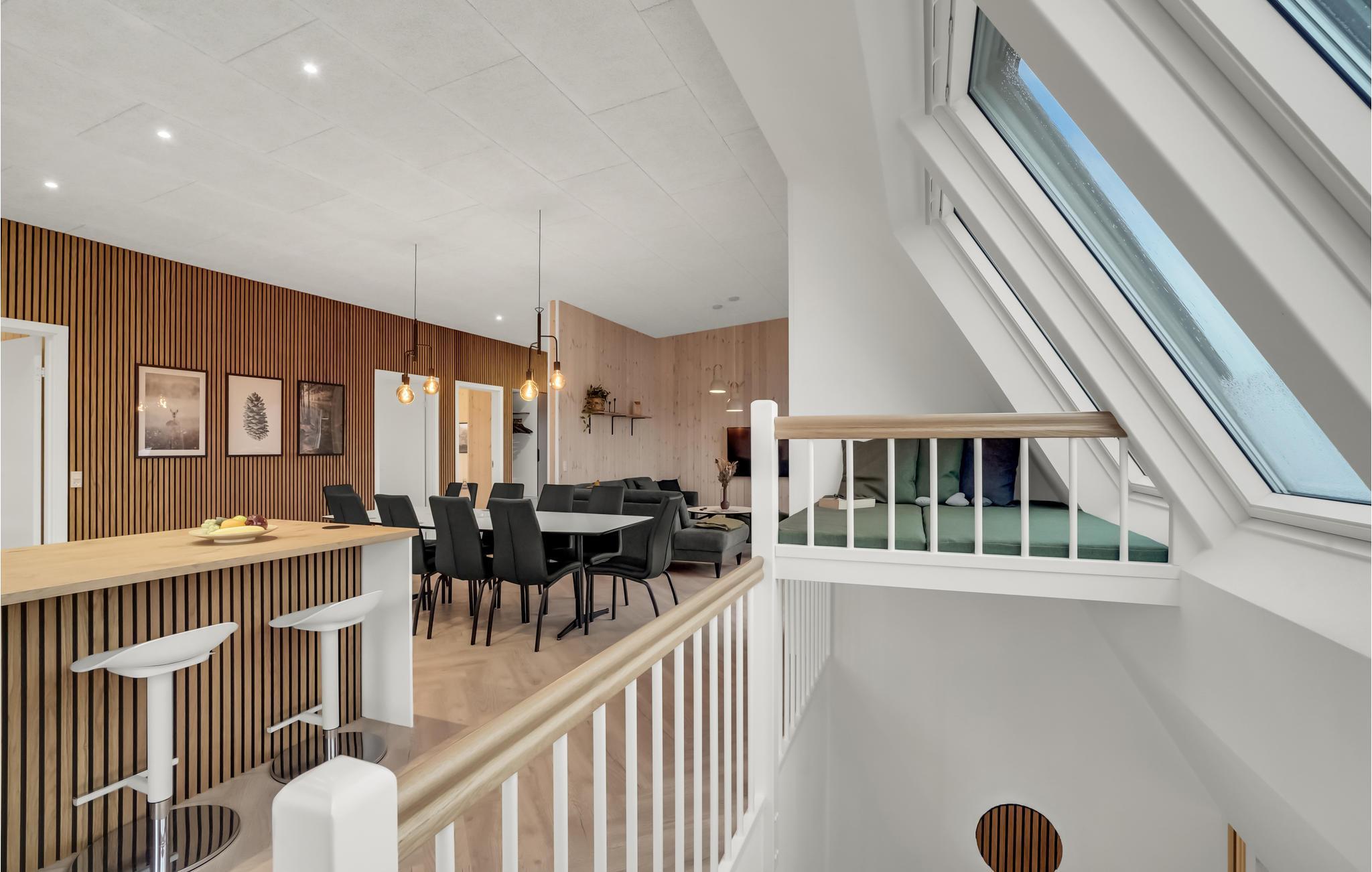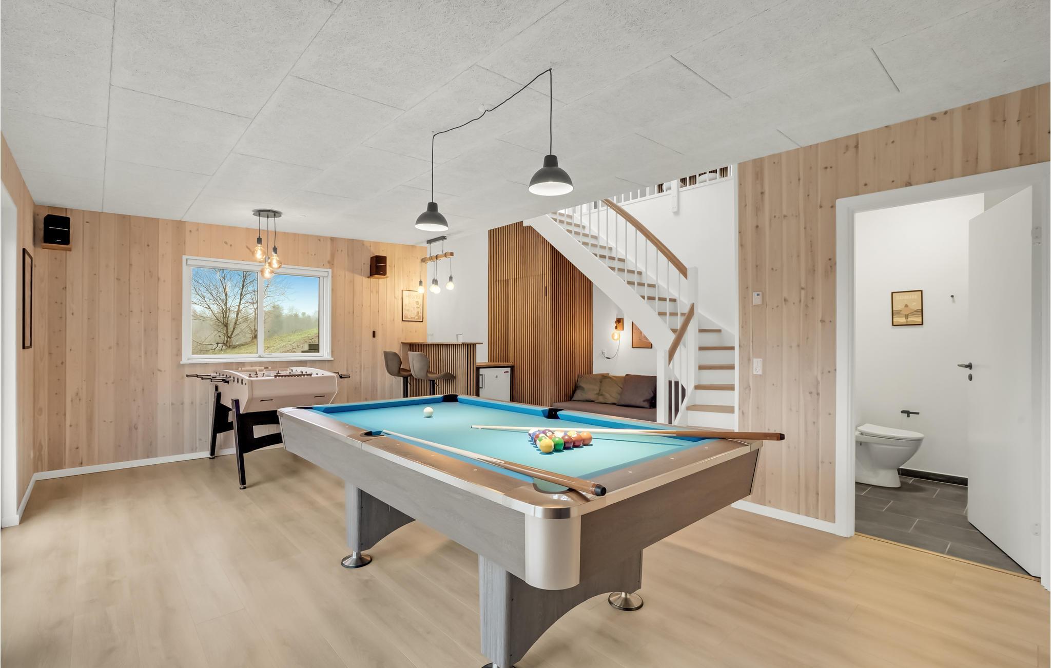 Dette fremragende feriehus byder velkommen til jeres store familie i to etager. Fordelingen af soveværelserne gør det nemt for en stor familie eller flere familier at bevare privatlivet og stadig hygge sig sammen. Der er tænkt på alt i dette hus, og komfortniveauet er fremragende. I kommer ind i huset på øverste etage. I den moderne og rummelige stue. Her kan I nyde tiden sammen, mens I laver mad, spiser, leger og slapper af i sofaen. Forkæl jer selv med afslappende wellness på badeværelset, hvor I kan svede jeres hverdagsstress ud i saunaen eller slappe af i spabadet. I vil opleve sjov og underholdning i det store aktivitetsrum i underetagen, her venter jer bl.a. bordtennis, billard eller bordfodbold. Den lille bar lægger op til sociale aftener.