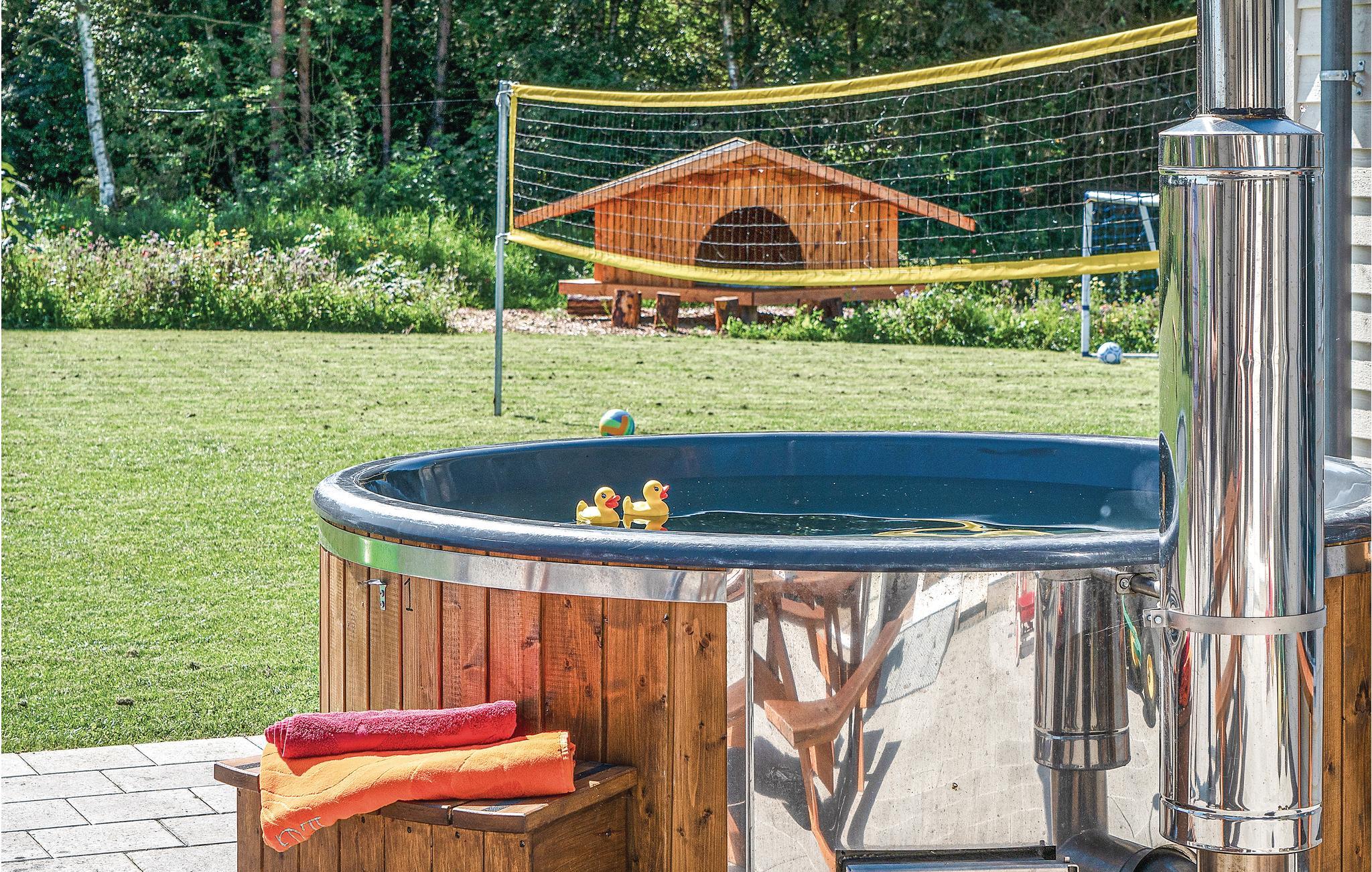 Tilbring mange skønne timer udendørs på den 3.000 m² store, ugenerte hjørnegrund, hvor I er velkomne til at plukke en buket markblomster og frugt fra de mange frugttræer. Hyg jer og overnat i shelteren, bag snobrød ved bålstedet og benyt jer af fiskerensepladsen, hvis I har heldet med jer på fisketuren. Børnene kan boltre sig på legepladsen med legeborg, trampolin, gynger, rutsjebane, vippe, sandkasse og trehjulede cykler. I har også mulighed for at dyste i volleyball, fodbold, rundbold og kroket. Nyd en øl på eftermiddagsbænken og udsigten over det kuperede landskab. Glæd jer også til en afslappende tur i det brændefyrede vildmarksbad med efterfølgende bad i koldtvandskarret. Det er ren terapi for krop og sjæl, hvor I samtidig kan nyde en enestående stjernehimmel uden lokal lysforurening.
