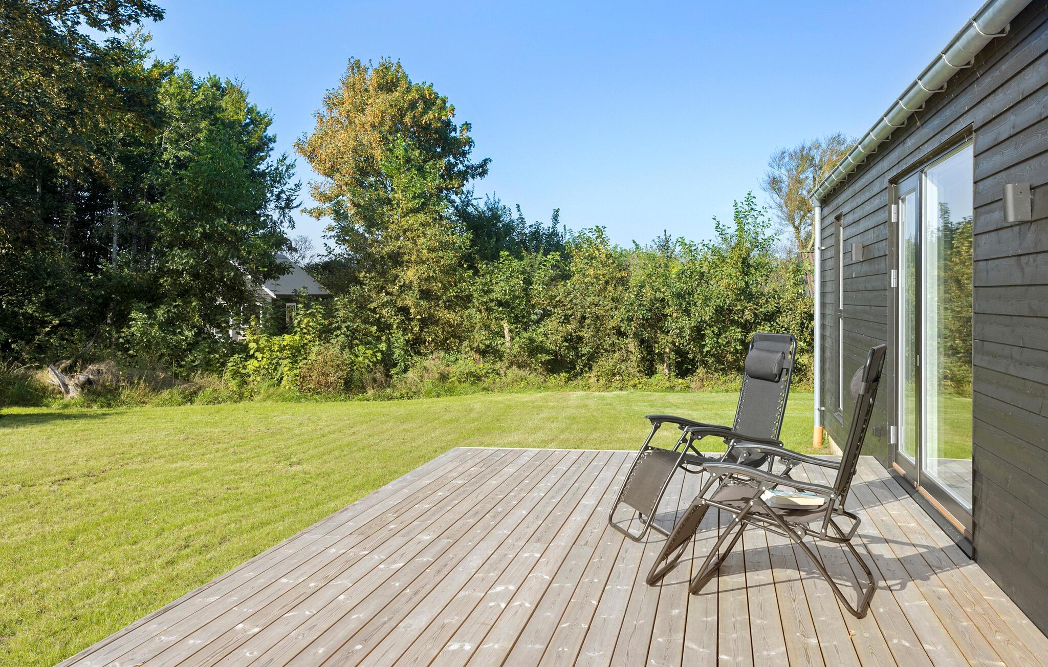 Moderne og rummeligt træhus nær fjord og strand med stor terrasse til afslapning og familiehygge.