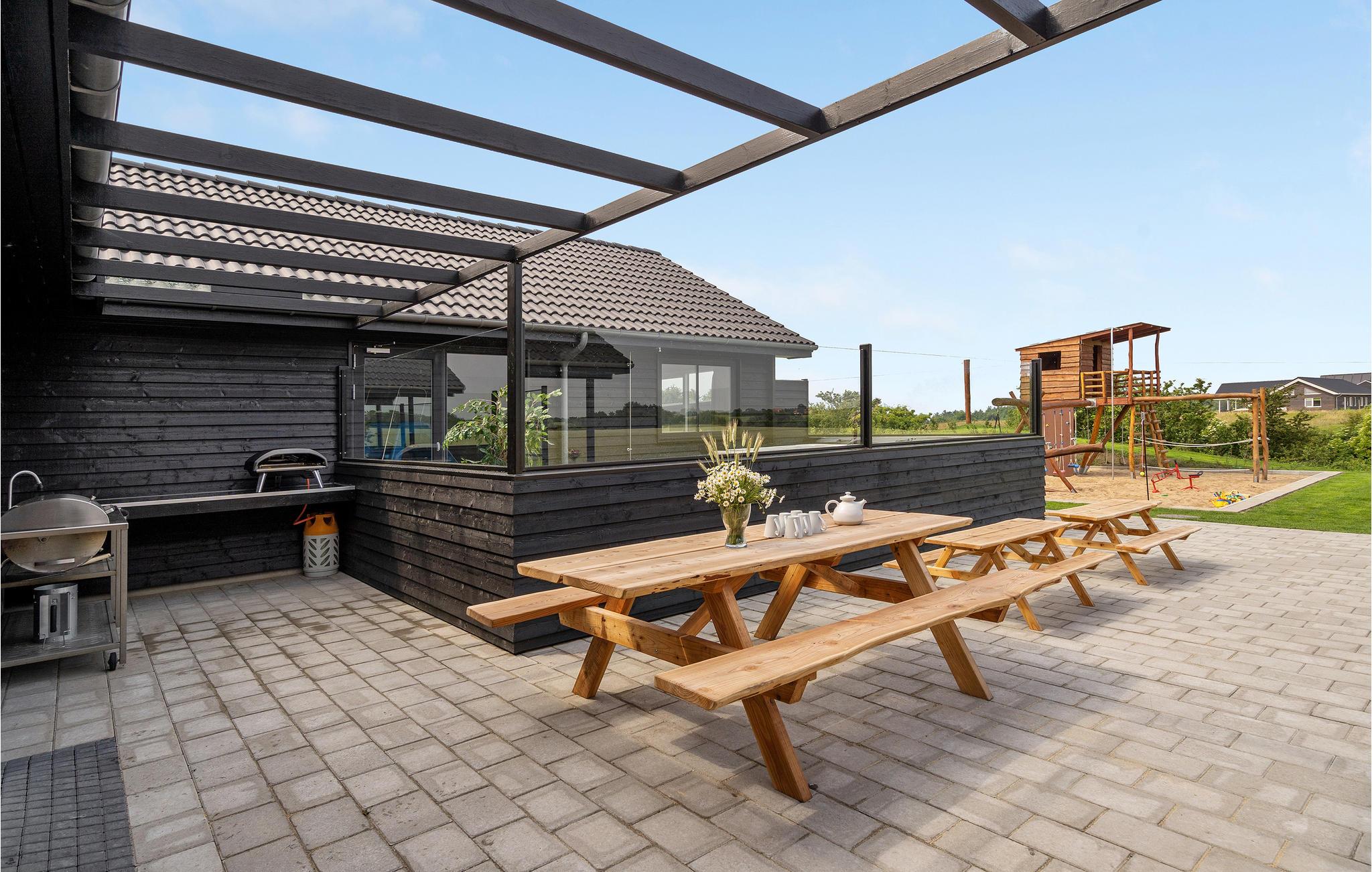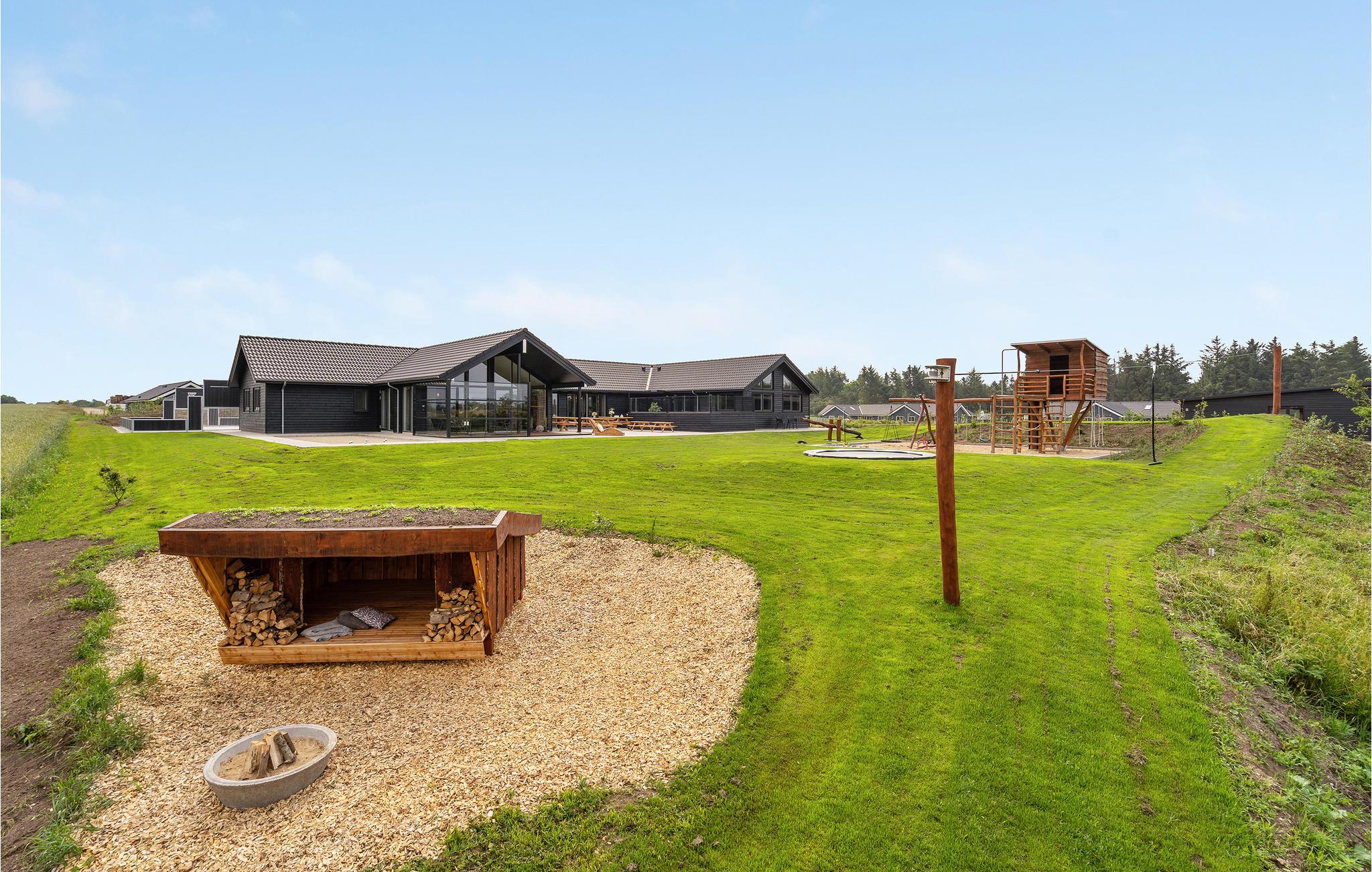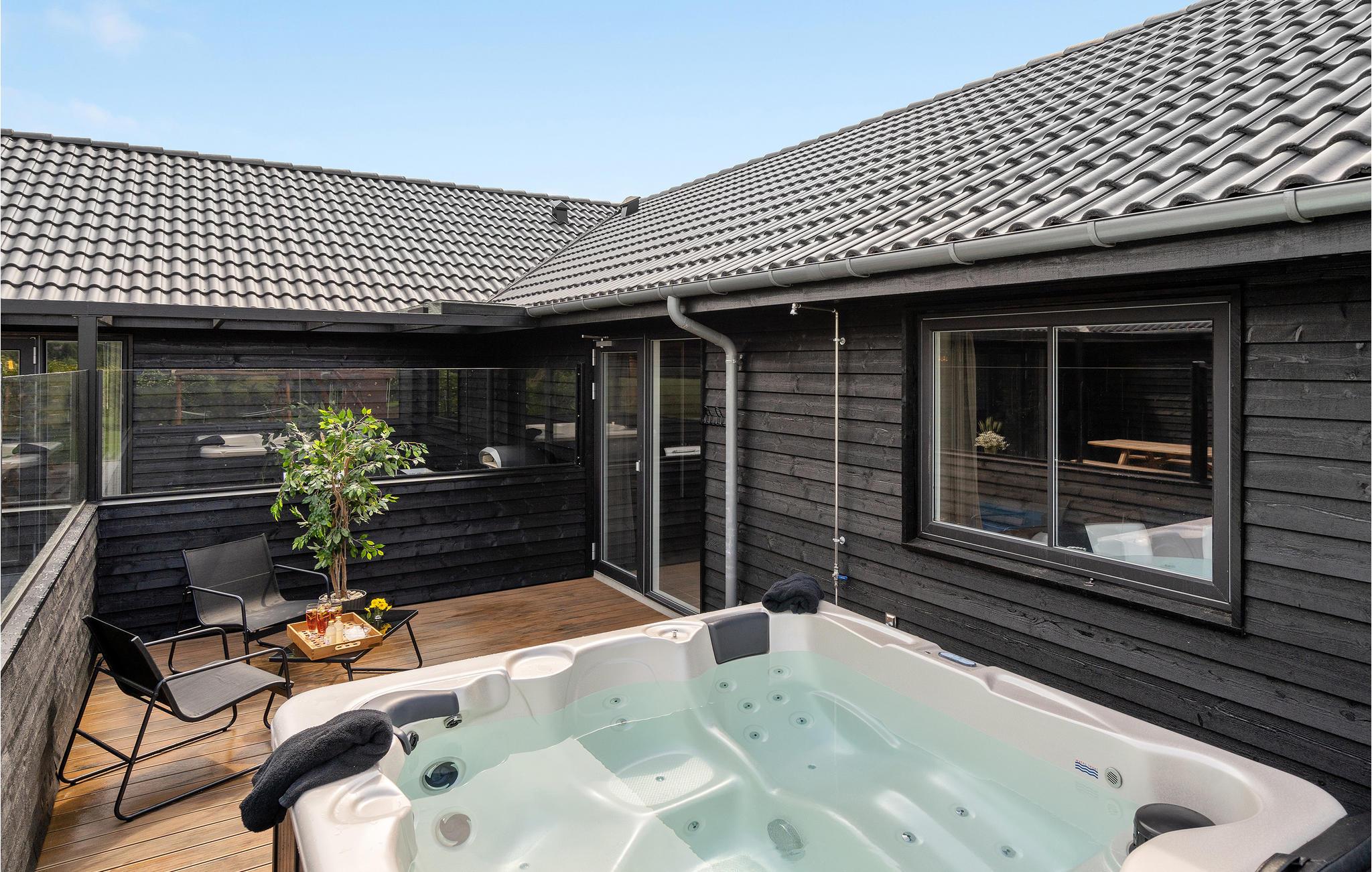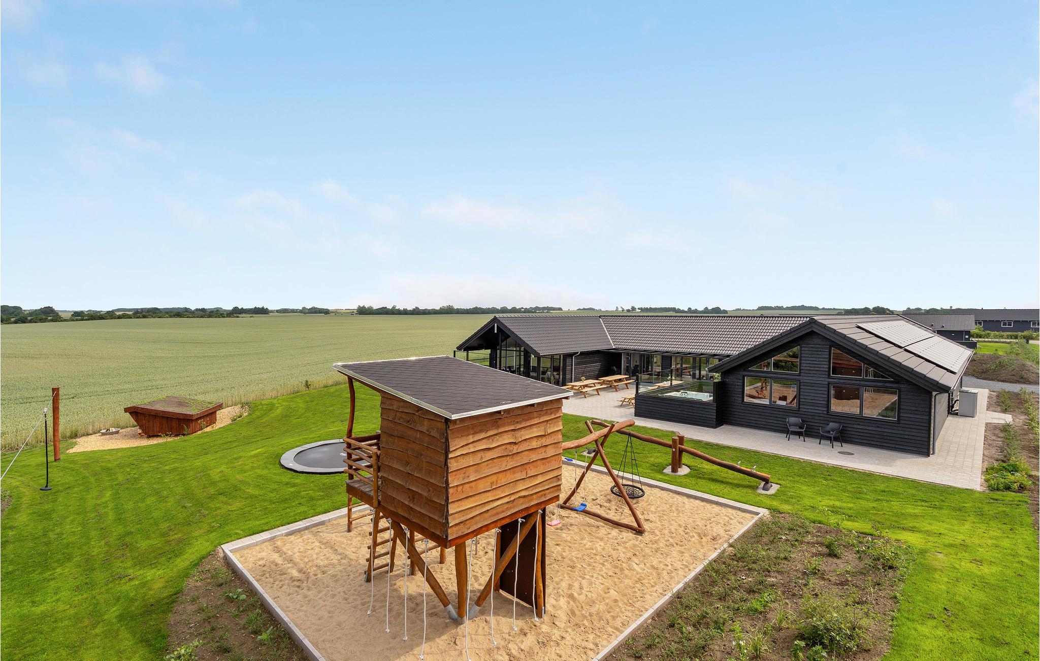 Moderne og rummeligt feriehus i Hostrup med pool, spabad og legeplads, perfekt til familier og grupper.