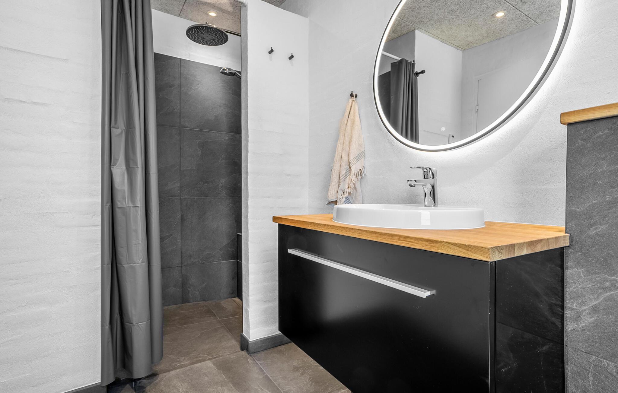 Den store terrasse tilbyder afslapning på flere niveauer. Grill og spis på det øverste, overdækkede område, snak i loungen, slap af på terrassen og forkæl jer selv med afslappende øjeblikke i spabadet.