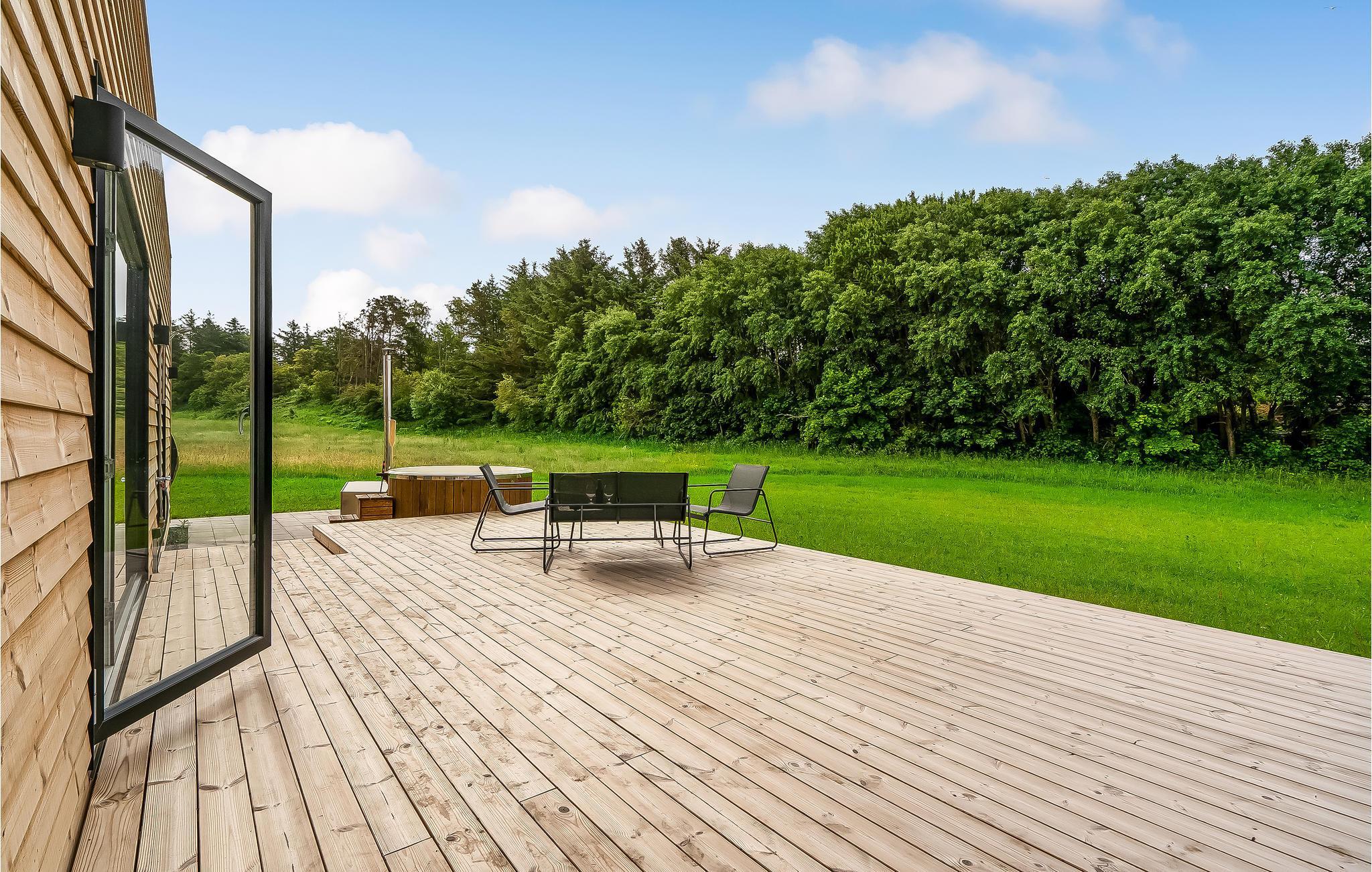 Der er lagt op til skønne stunder på den åbne terrasse, hvor I også kan slappe af i det finske træbad, mens I nyder en fantastisk udsigt. Der er også grill tilgængelig her.