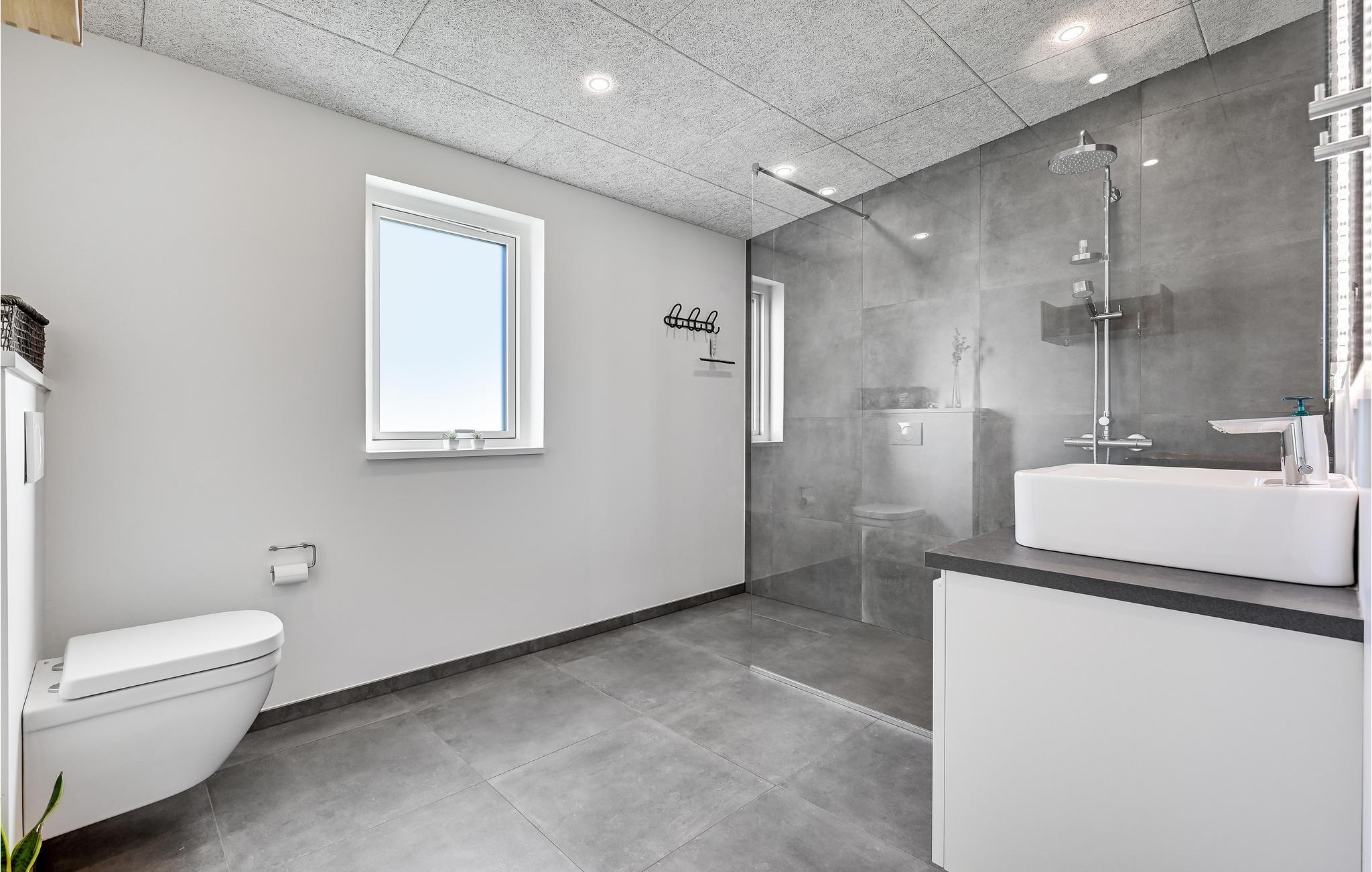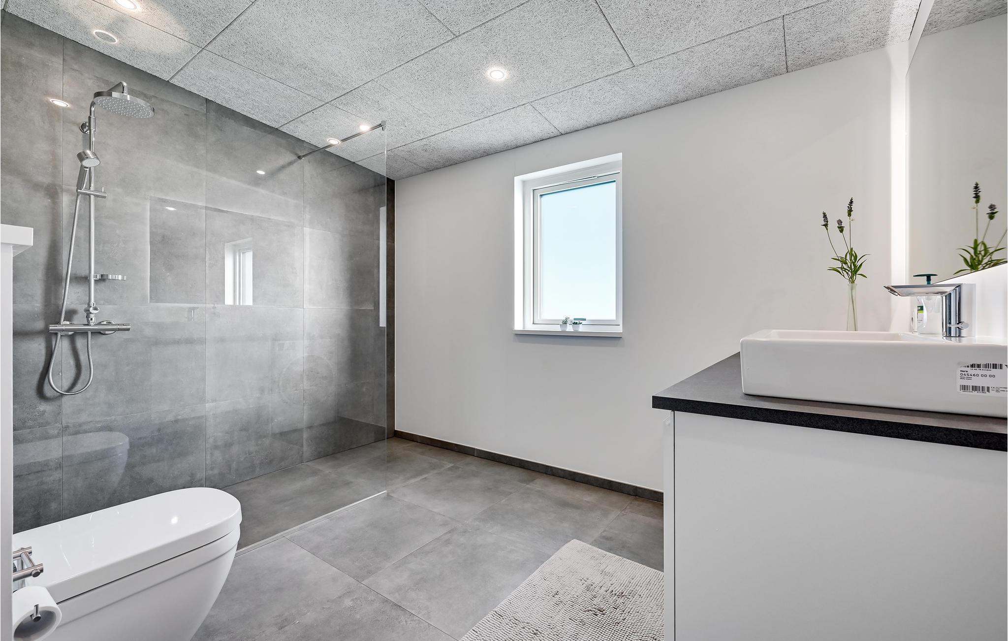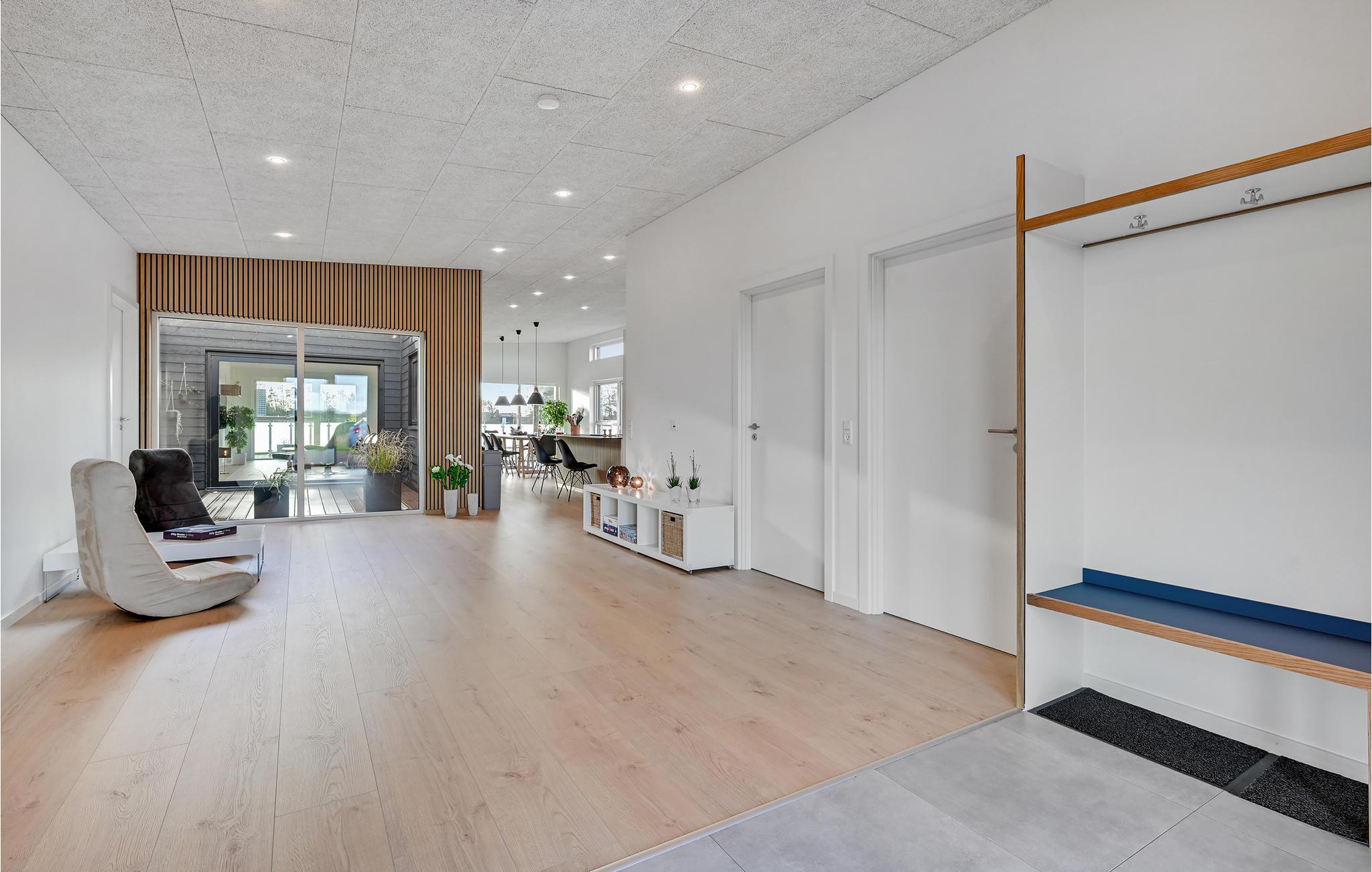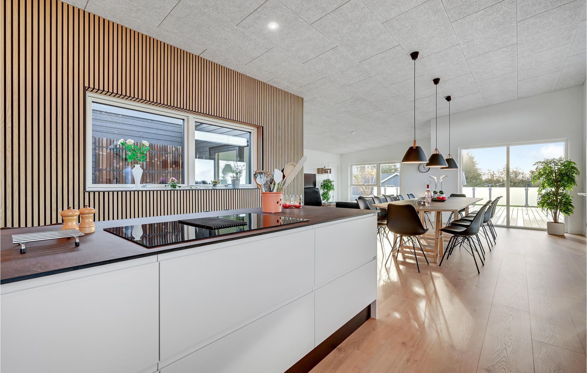 Feriehuset af høj kvalitet er udstyret med alle de faciliteter, du måtte ønske dig til en ferie. Indvendigt venter en lys og moderne atmosfære med møbler i elegant, skandinavisk stil. Hjertet i huset er det åbne opholds- og køkkenområde, hvor du kan samle familie eller venner. Tilbring afslappede aftener og se tv, hyggelige måltider eller spændende spilaftener sammen. Dejligt dagslys falder gennem de store vinduer. Huset er indrettet i 2 fløje hver med værelser og 1 badeværelse med opholdsrummet/køkken i midten, så det er også et ideelt til en ferie for flere familier, som også gerne vil have privatliv.