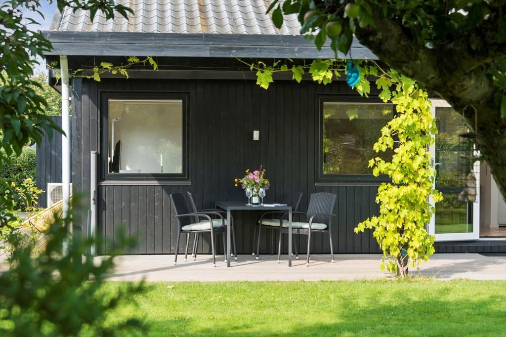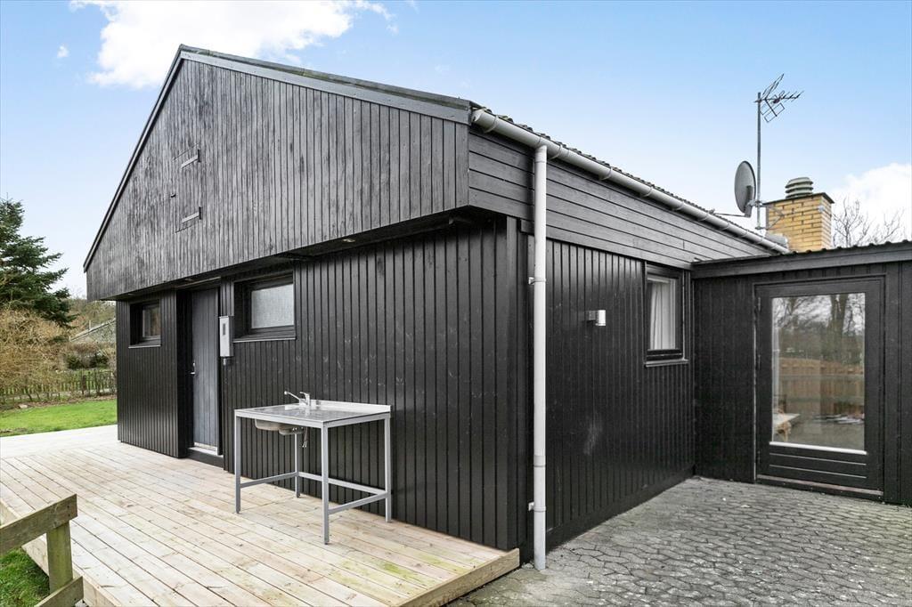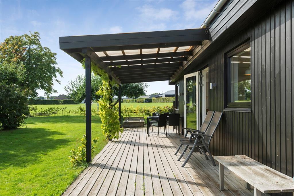 Stor nyanlagt træterrasse, der omkranser hele sommerhuset. Udfor køkkenet er terrassen desuden overdækket.