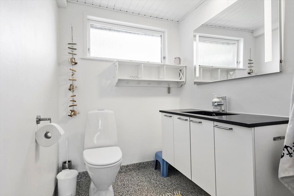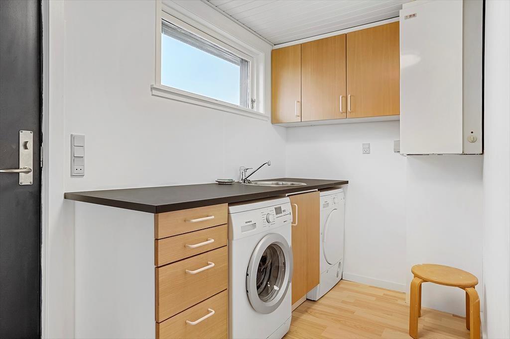 Rummeligt badeværelse og bryggers med vaskemaskine og tørretumbler. Høj stol, barneseng og babybadekar forefindes. Obl. rengøring.