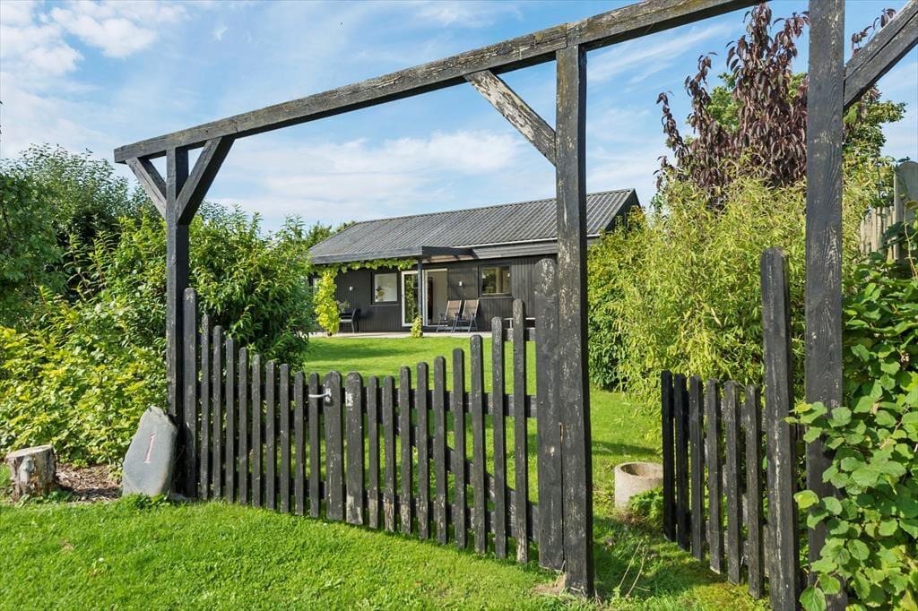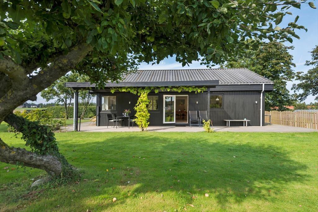 Udendørs køkkenbord med varmt og koldt vand. I haven er der sandkasse til de små feriegæster. Sommerhuset ligger med udsigt over marker.
