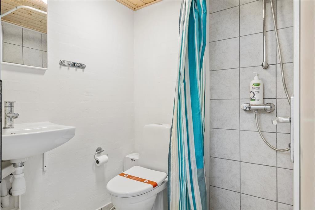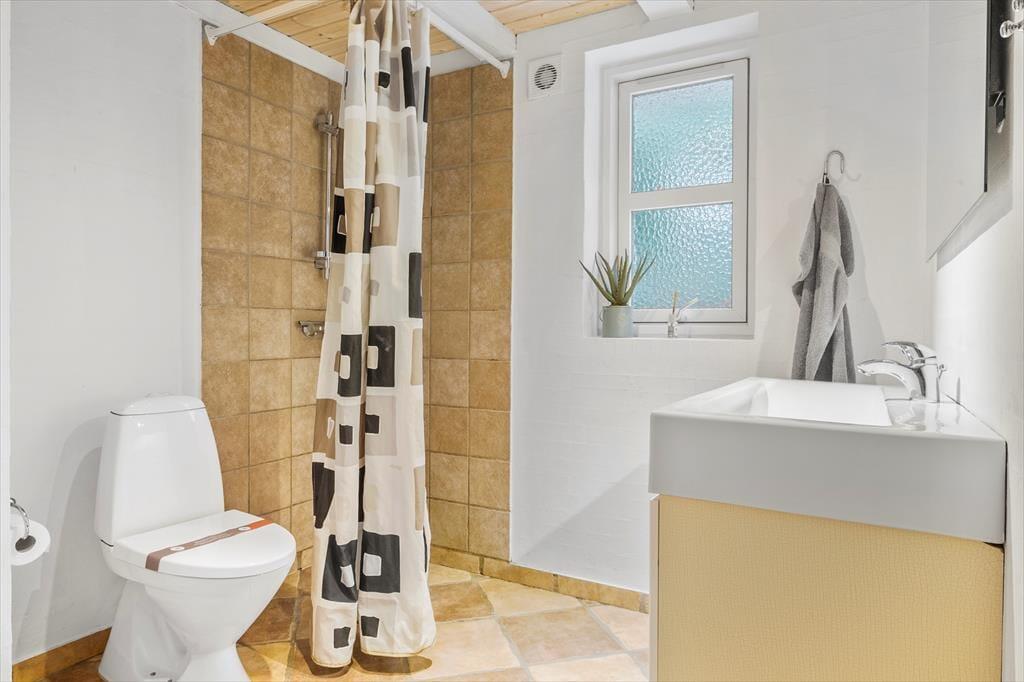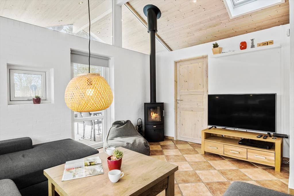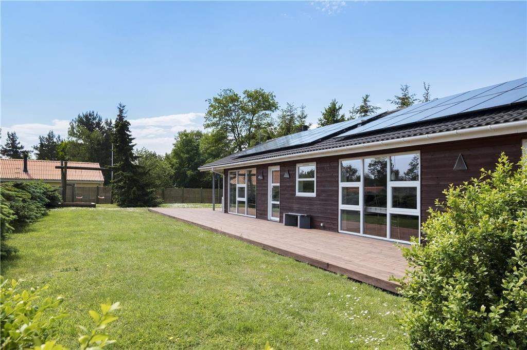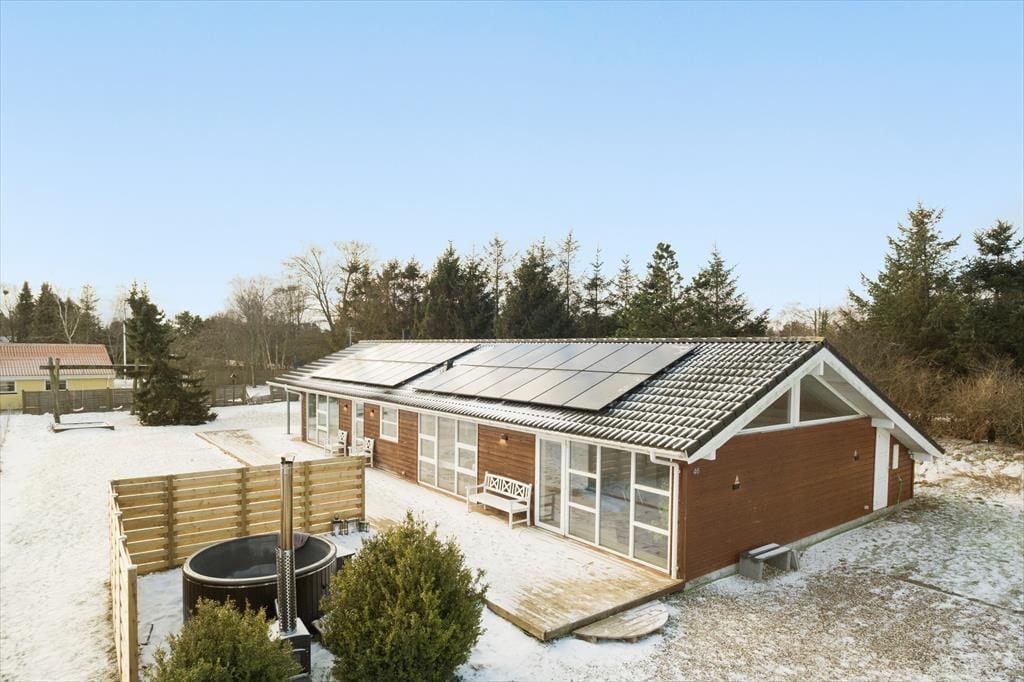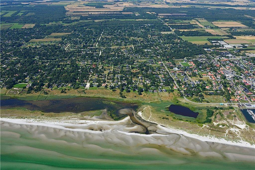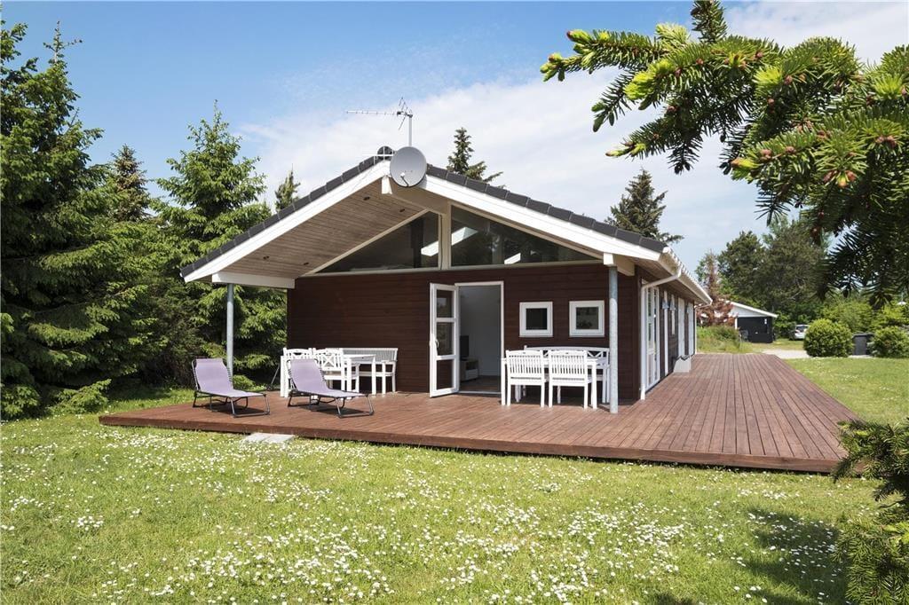 Huset ligger på en pæn havegrund i et nydeligt sommerhuskvarter på den "rigtige" side af vejen, som man siger her i området. Det betyder, at huset ligger på vandsiden og med kun ca. 450 meter til hav og strand. Til de små feriegæster er der i haven et sjovt gyngestativ og en sandkasse. Huset har store terrasser på den ene langside af huset og mod sydvest, så der er rigelig med sol hele dagen. Frem med grillen og på med pølserne - det her bliver godt! Det er også her vildmarksbadet befinder sig.