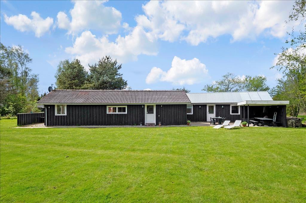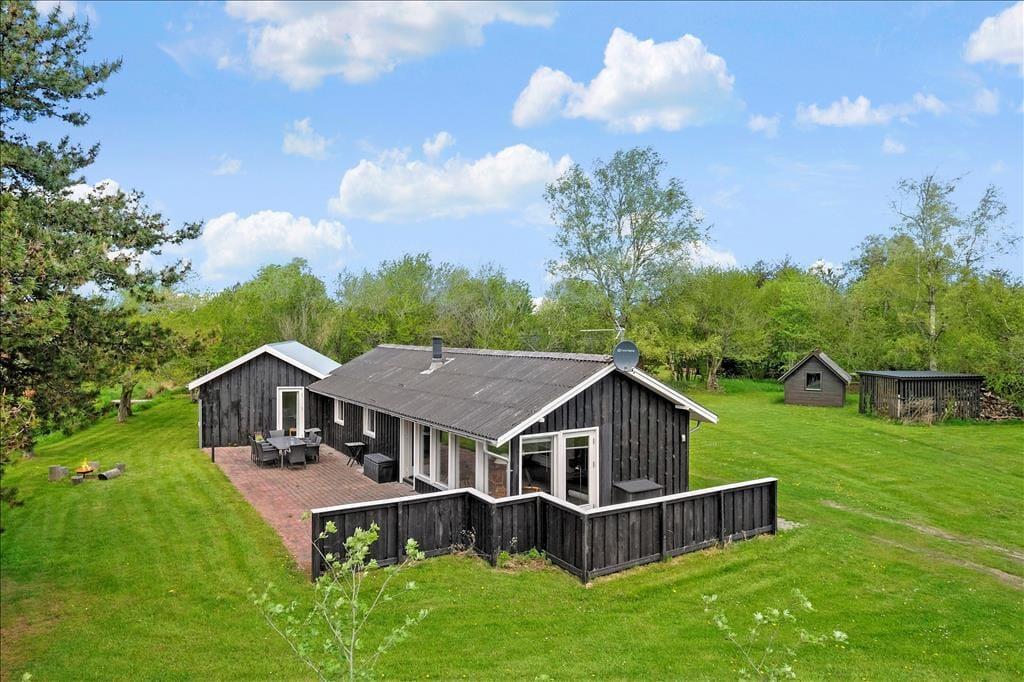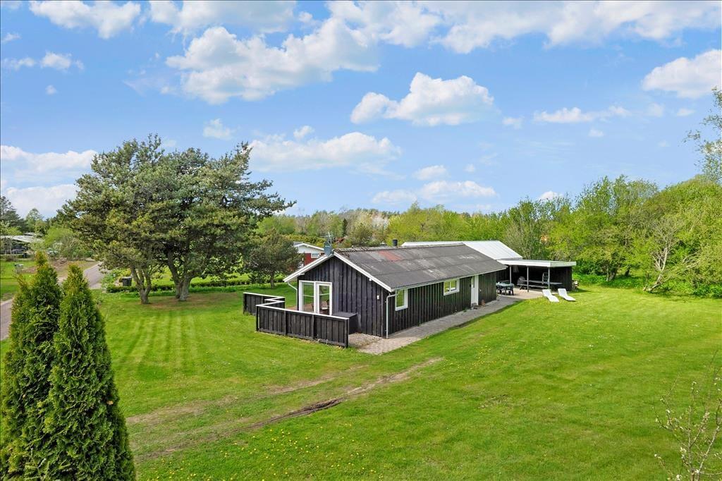Huset er beliggende på en stor flad grund hvor der er rig mulighed for leg og boldspil. Der snor sig en lille bæk på grunden hvor børnene kan fange småfisk og frøer. Udover den store terrasse, der er rundt om huset finder man en vidunderlige oase med overdækning mellem hus og anneks - her er der lagt op til skønne grillaftner uafhængigt af vind og vejr - kort og godt ægte danske sommerhus idyl.
