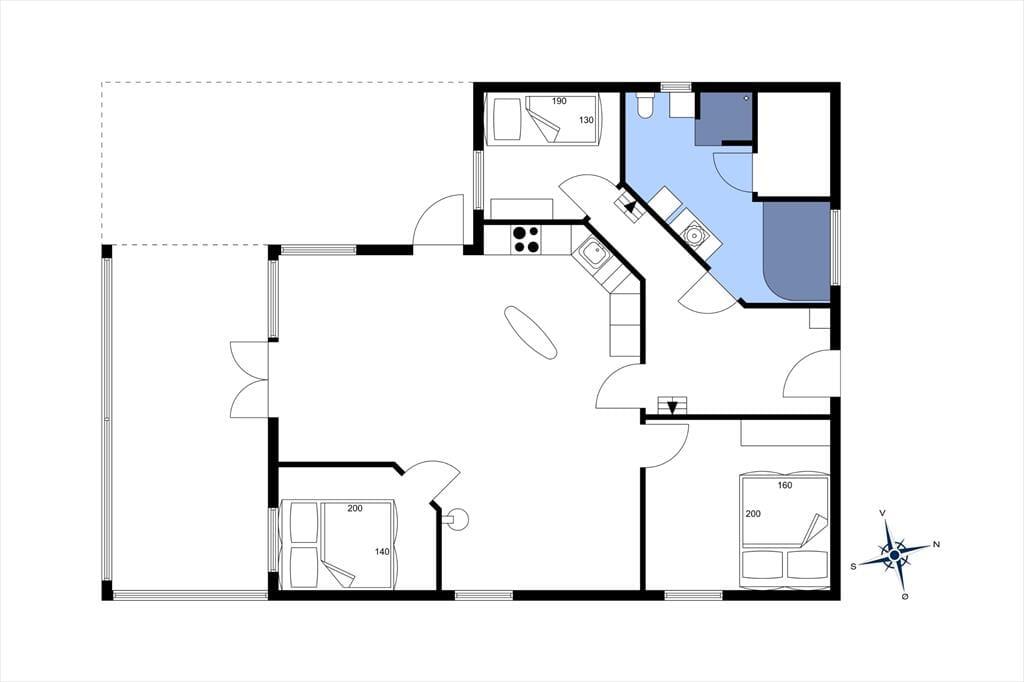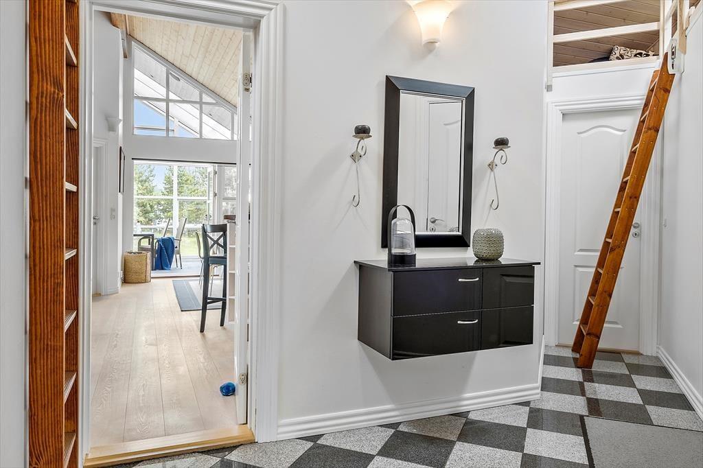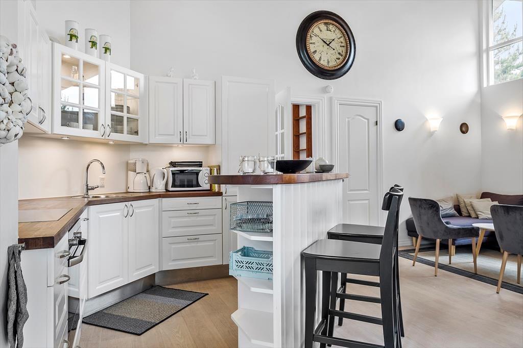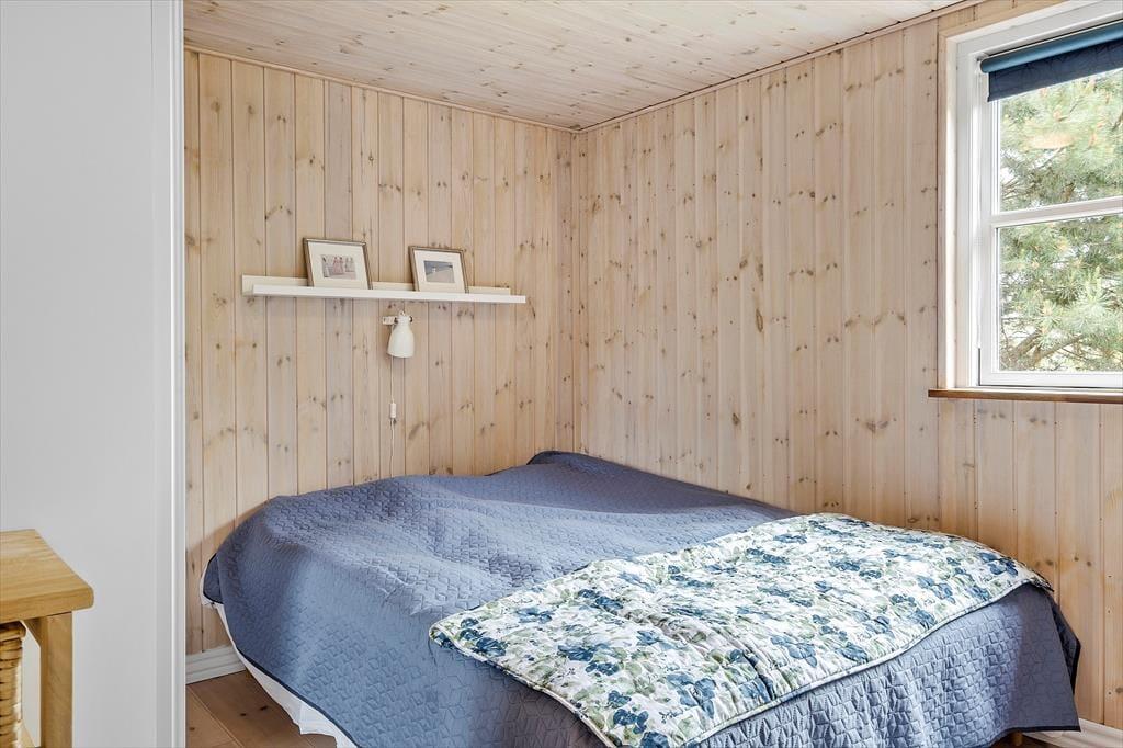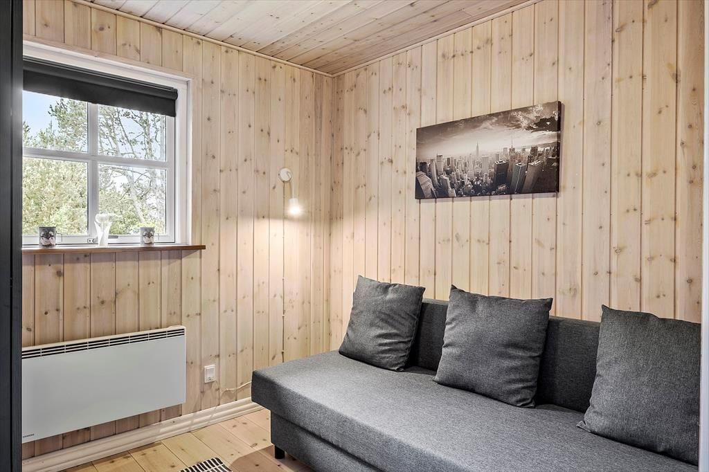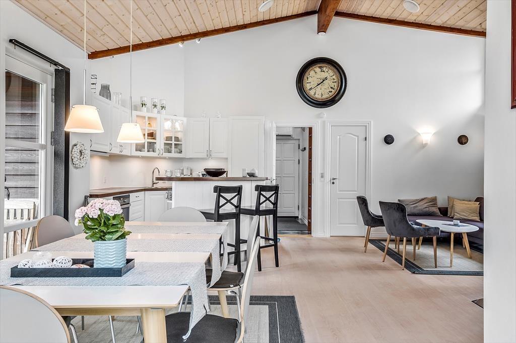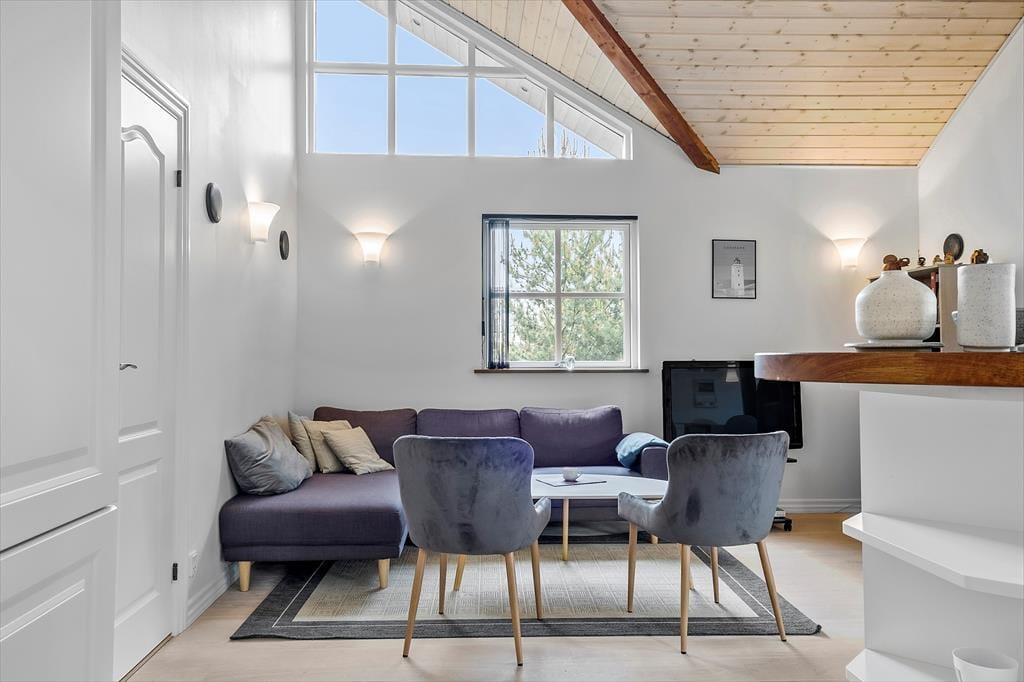 Dagslyset strømmer indenfor i stuen, som er udstyret med vinduer vendt mod tre verdenshjørner – inklusiv store trekantende vinduespartier øverst i gavlene. Det skaber en lys og indbydende atmosfære, som understreges af stuens enkle indretning med diskrete farvetoner og smagfuldt møbeldesign. I det ene hjørne af opholdsstuen er der god plads til at kræse om maden i den veludstyrede køkkenafdeling, hvor I også kan slå jer ned for at hyggesnakke på de høje barstole ved disken. Brændeovnen kan I tænde op i, når det er køligt udenfor, og hvis I virkelig trænger til at få varmen på en kold efterårsdag, er det herligt med et spabad og en saunatur på det lækre badeværelse. Når det er sengetid, kan I gå til ro på sommerhusets tre soveværelser, hvoraf to er indrettet med dobbeltseng og et med en dobbelt sovesofa.