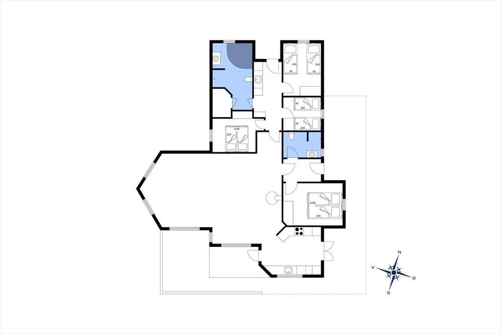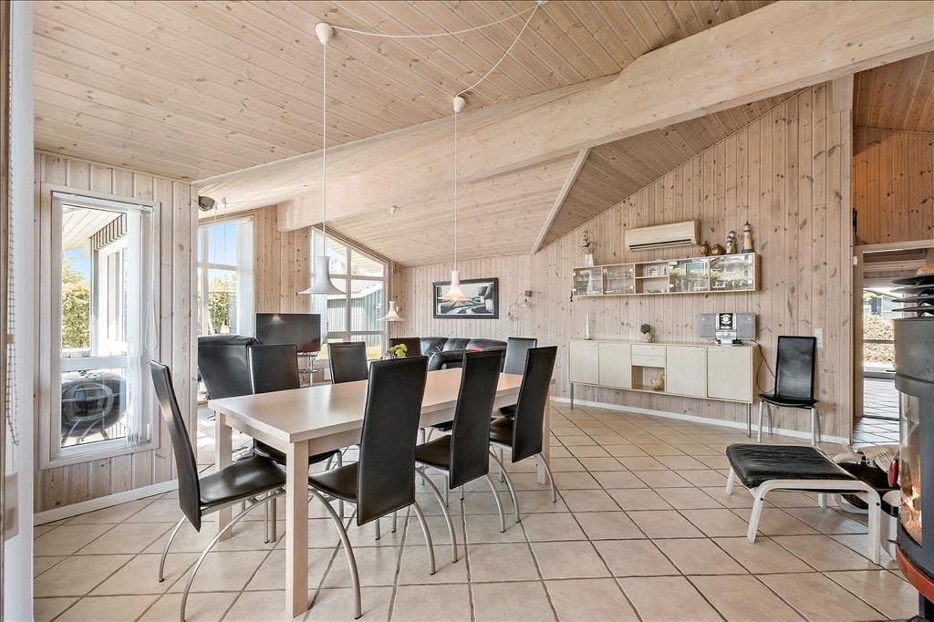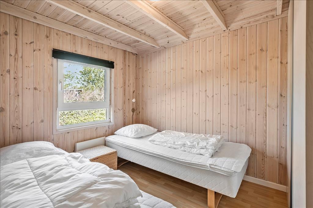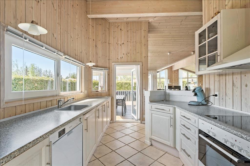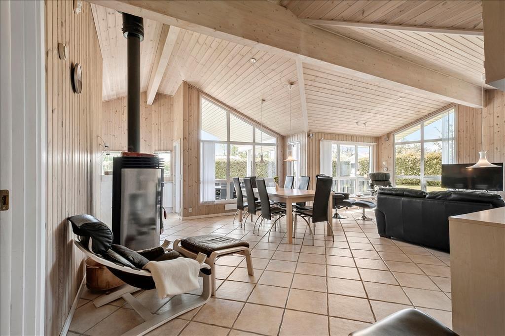 Med en formfuldendt planløsning og hele 130 m2 inden døre kan sommerhuset snildt rumme otte feriegæster. Soveværelser er der fire af, hvoraf to er indrettet med dobbeltseng og de to andre med hver især to enkeltsenge, og så er der også en rummelig entré og to badeværelser i huset. I entréen står der både en vaskemaskine og tørretumbler, mens begge badeværelser er udstyret med en bruseniche – og på lækker vis er der sauna og spabad på det største af badeværelserne, når der virkelig skal slappes af. Under gulvfliserne er der indlagt gulvvarme – ikke bare her, men også i opholdsafdelingen, der består af køkken og stue i åben forbindelse. Brændeovnen og varmepumpen sørger også for en passende temperatur selv på kølige dage, og de store vinduespartier giver et godt indfaldslys, som kan nydes, uanset om I laver mad i køkkenet, sidder samlet omkring spisebordet eller slapper af i sofaafdelingen.