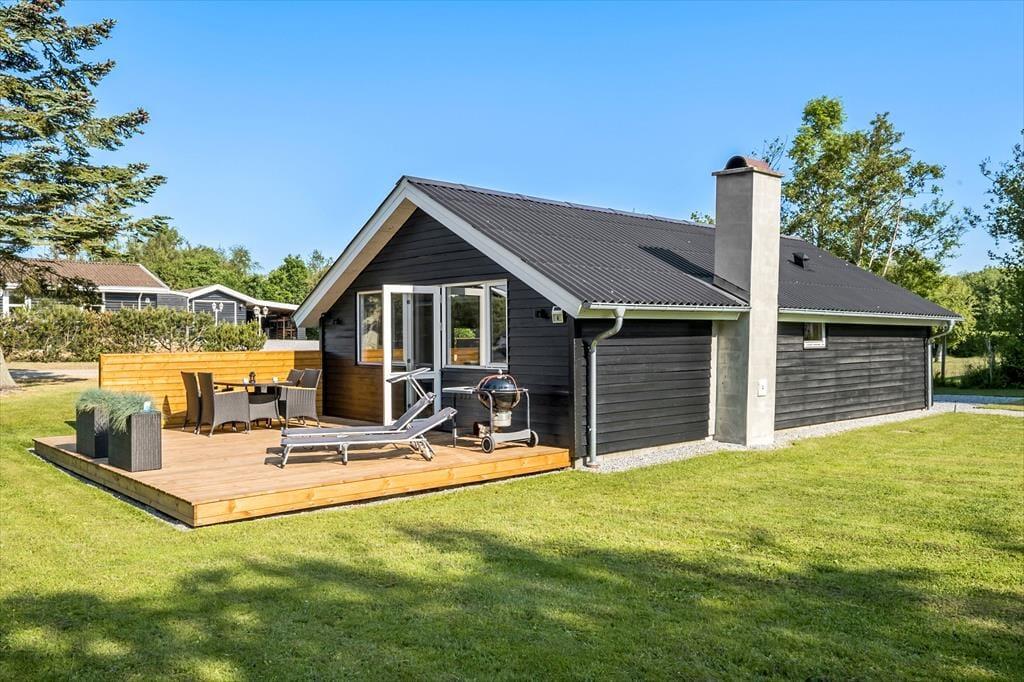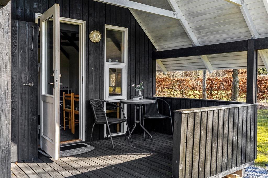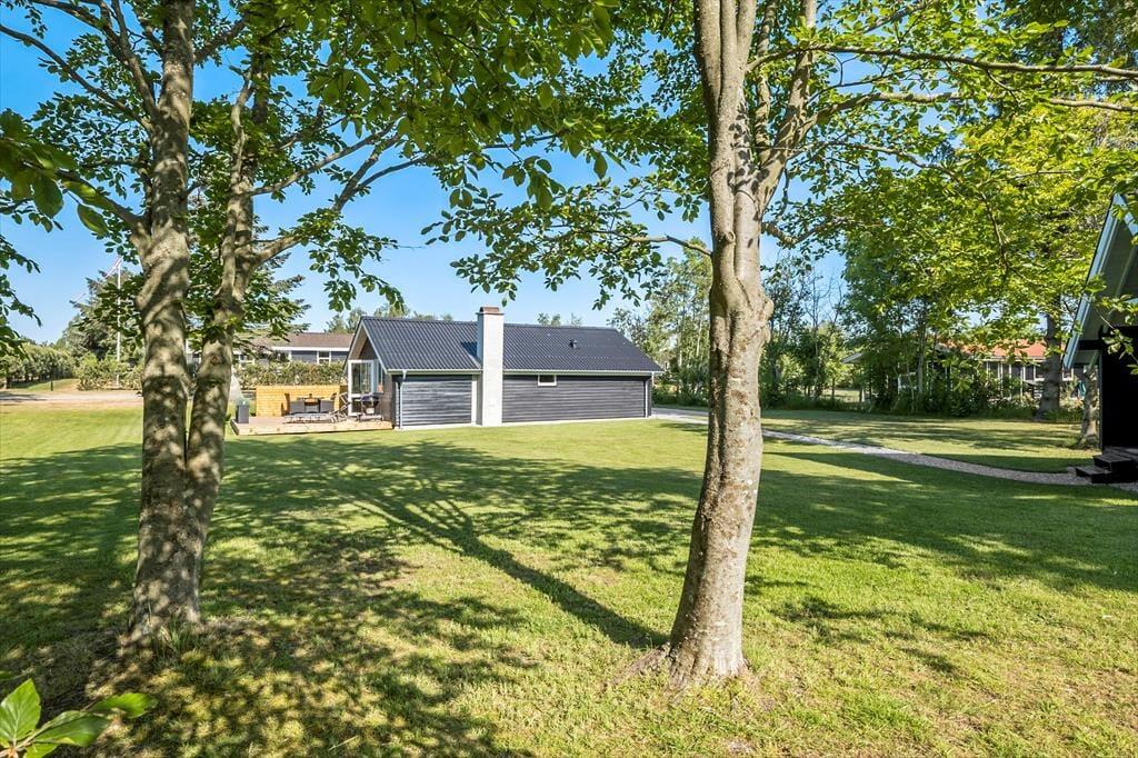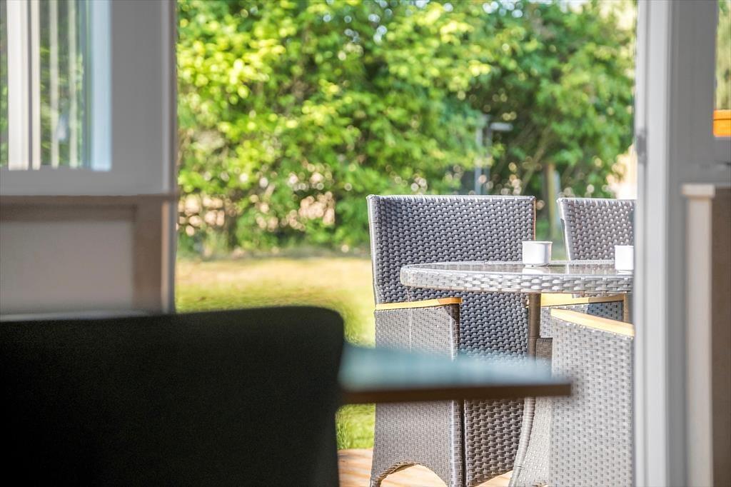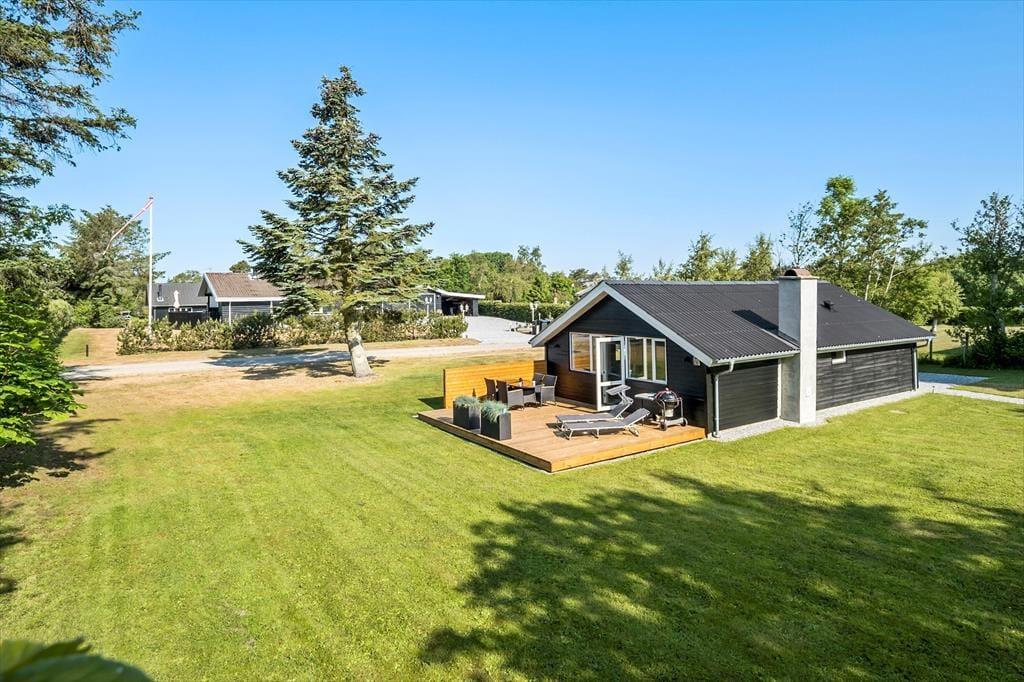 På sydsiden af sommerhuset ligger en dejlig træterrasse, der skærmes af et læhegn ud mod vejen. Her kan I fordybe jer i spændende romaner eller podcasts, når I slapper af i liggestolene, og I har også rig mulighed for at grille og efterfølgende nyde de sommerlige lækkerier samlet omkring havebordet. På den 1300 m2 store grund giver græsplænen jer plads til leg og boldspil, og bilen kan holde i den grusbelagte indkørsel.
