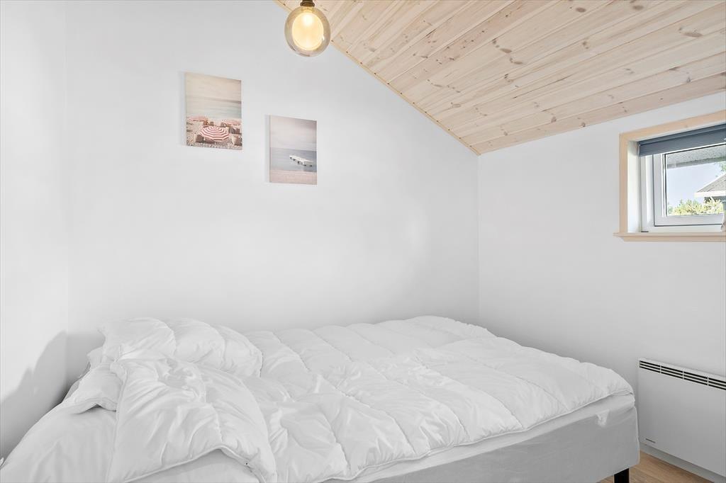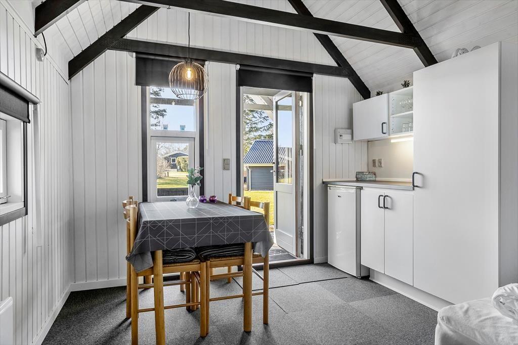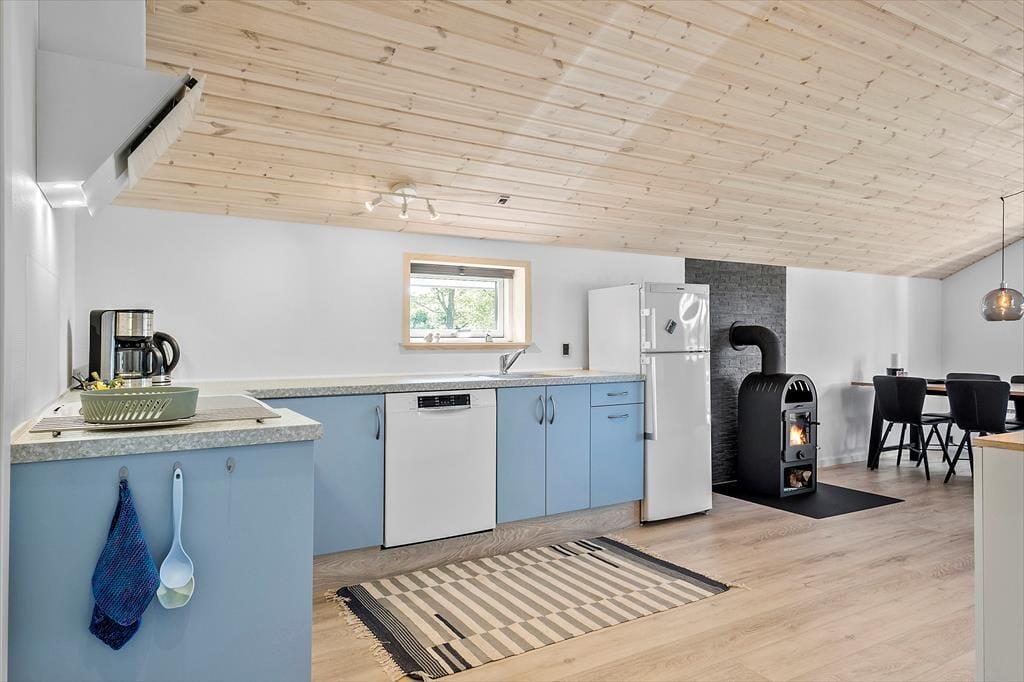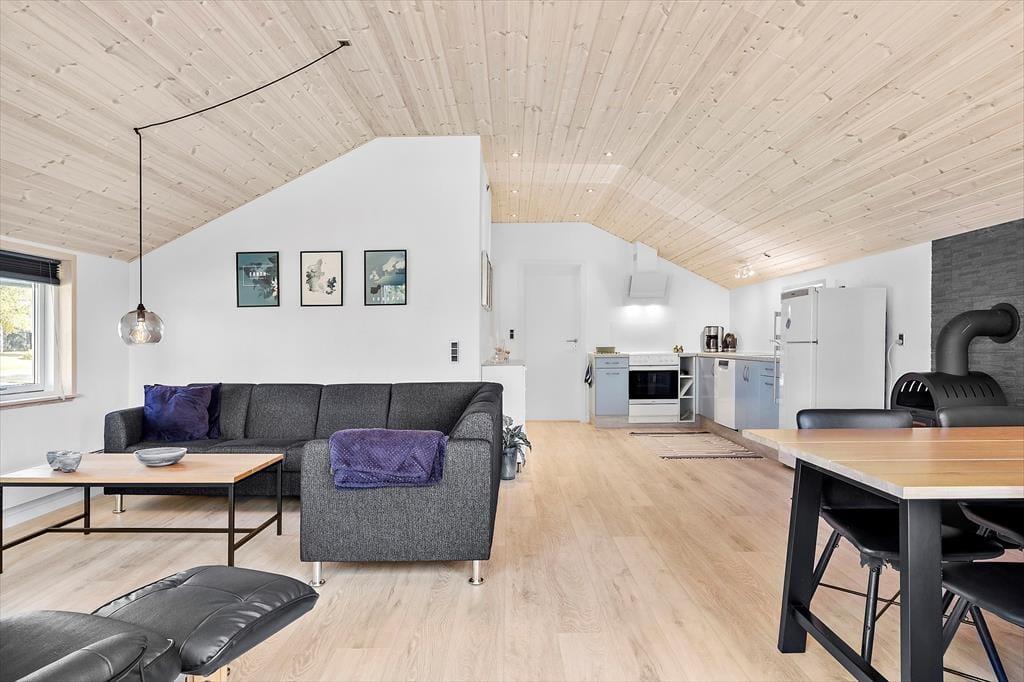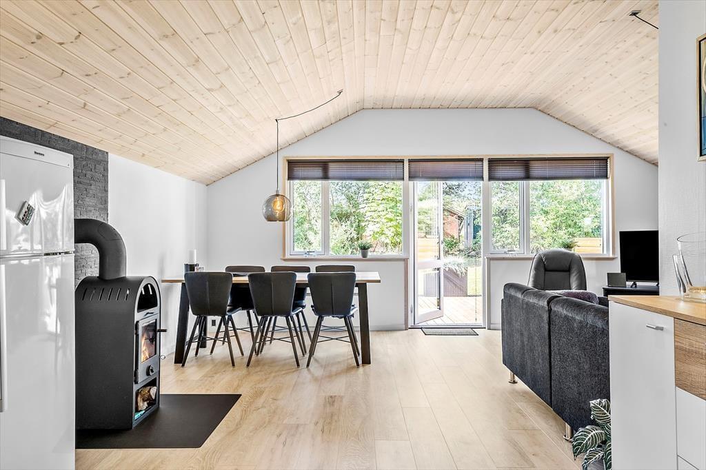 Efter den omfattende modernisering har husets indre en enkel og stilfuld fremtoning. Køkken og stue ligge samlet, så det er nemt at smutte hen for at hente mere kaffe, når I slapper af i sofaen – måske endda med en film på fladskærms-tv’et. Brændeovnen står klar til at sprede varme på kølige årstider, og på sommerlige dage kan I åbne terrassedøren, så ude og inde smelter sammen. Sommerhusets soveværelser er begge udstyret med gode dobbeltsenge, og planløsningen byder endelig på et rummeligt badeværelse med bruseniche, vaskemaskine og gulvvarme.