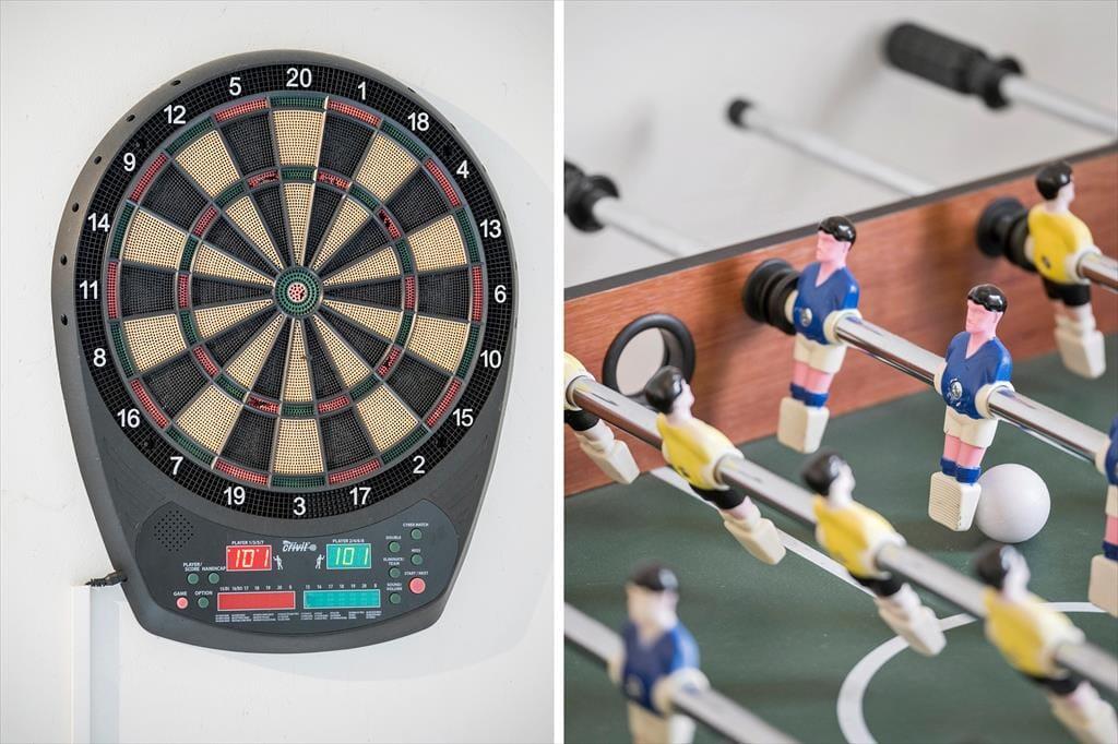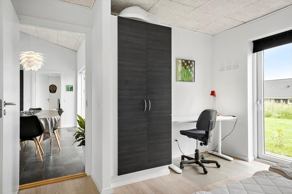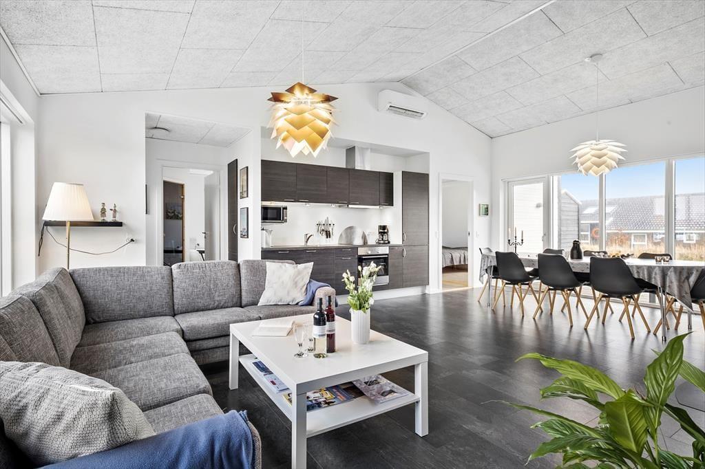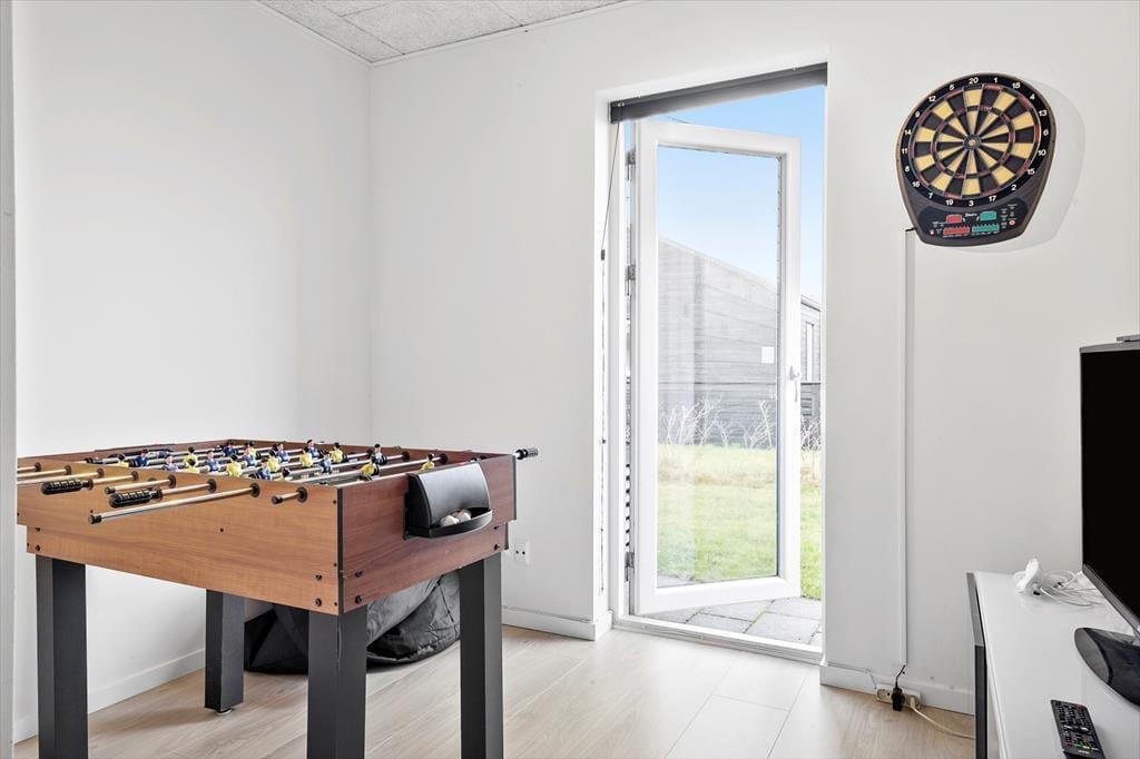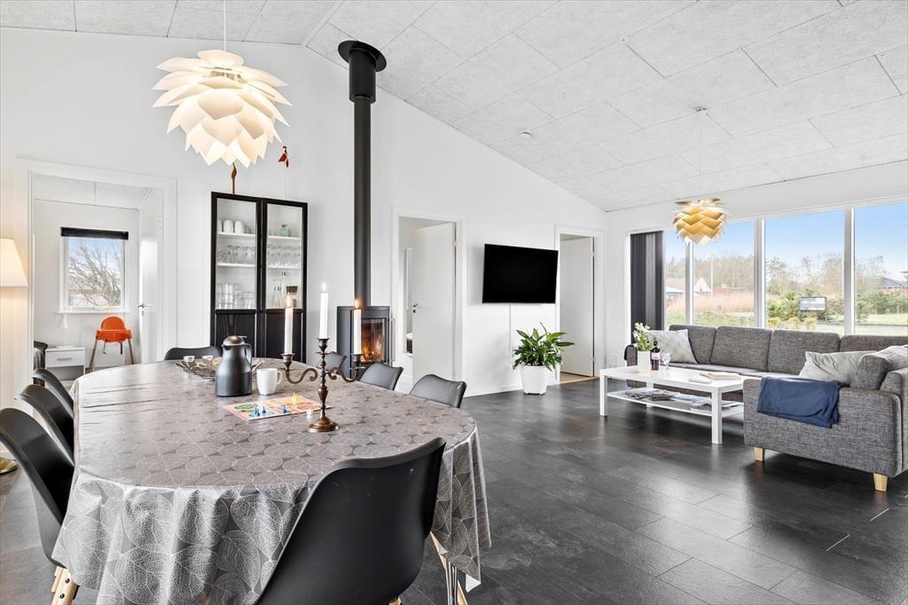 Det 120 m2 store sommerhus er opført i 2013, og inde bag den mørke træfacade venter en lys og indbydende feriebolig med mange lækre detaljer. I stuen er der både brændeovn og varmepumpe samt et flot gennemstrømmende lysindfald – såvel som akustikplader i loftet, der for øvrigt går helt til kip. Et moderne køkken er integreret i rummet, så I kan lave mad, mens I fortsætter hyggesnakken med resten af familien. I aktivitetsrummet er der mulighed for at spille dart, bordfodbold og game, og hvis I er mere til wellness, kan I benytte jer af spabadet og saunaen, der ligger som del af det største af de to badeværelser. Soveværelserne byder alle på komfortable senge og indbygningsskabe, og to af værelserne har endda egen havedør, så I nemt kan komme ud, så snart solen skinner.