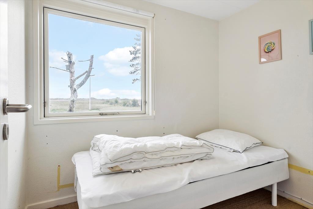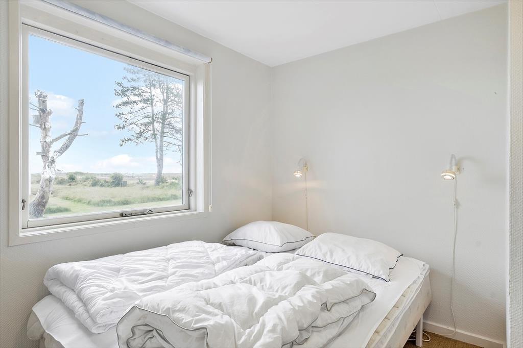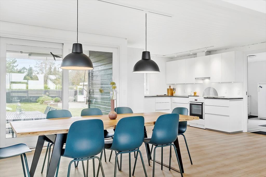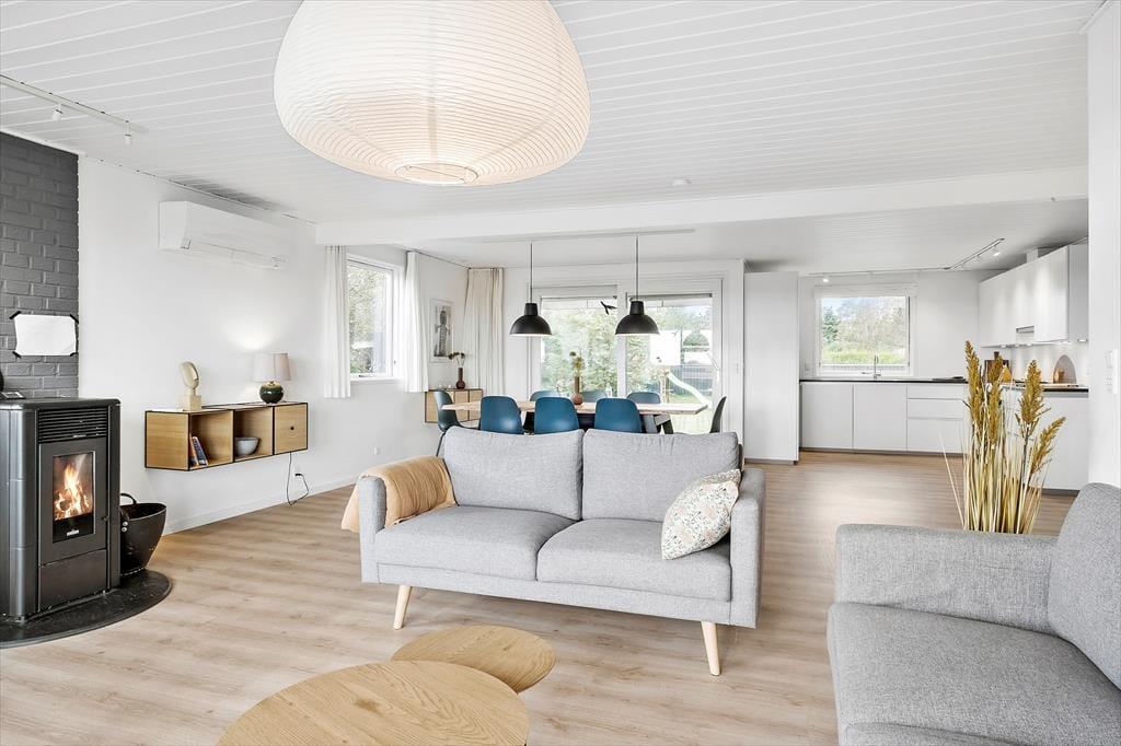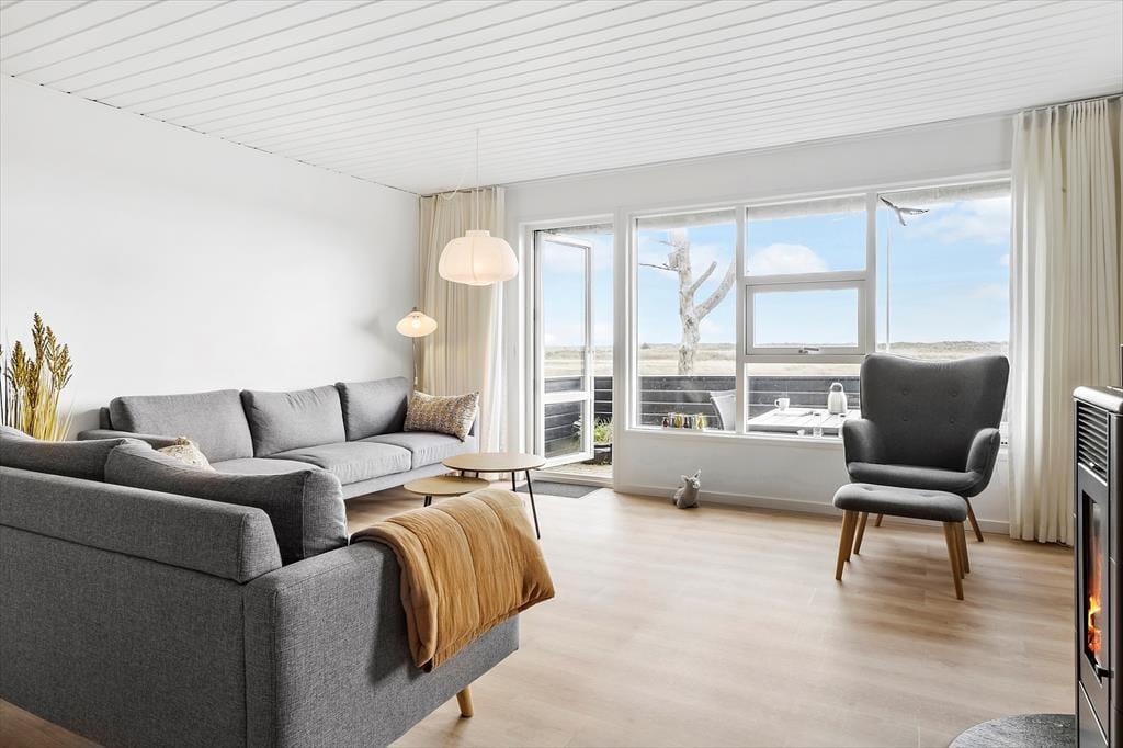 Efter en vellykket renovering i 2015 har sommerhuset et lyst og velfungerende indre, og planløsningen passer fint til syv personer. Rummene er rare at være i, så I kan straks sænke tempoet og gøre klar til en ferie i ro og mag. I stuen er der indfaldslys fra tre verdenshjørner, og særligt gennem det store østvendte vinduesparti er udsigten noget helt særligt, for her kan I skue ud over strandengen, der strækker sig mod Kattegat. Stuen har både brændeovn og varmepumpe, og der er fladskærms-tv med Chromecast, hvis I har lyst til en rolig stund i sofaen. Et moderne køkken er integreret i rummet, og derudover råder I over et brusebadeværelse og fire soveværelser – hvoraf det ene er placeret i husets anneks.