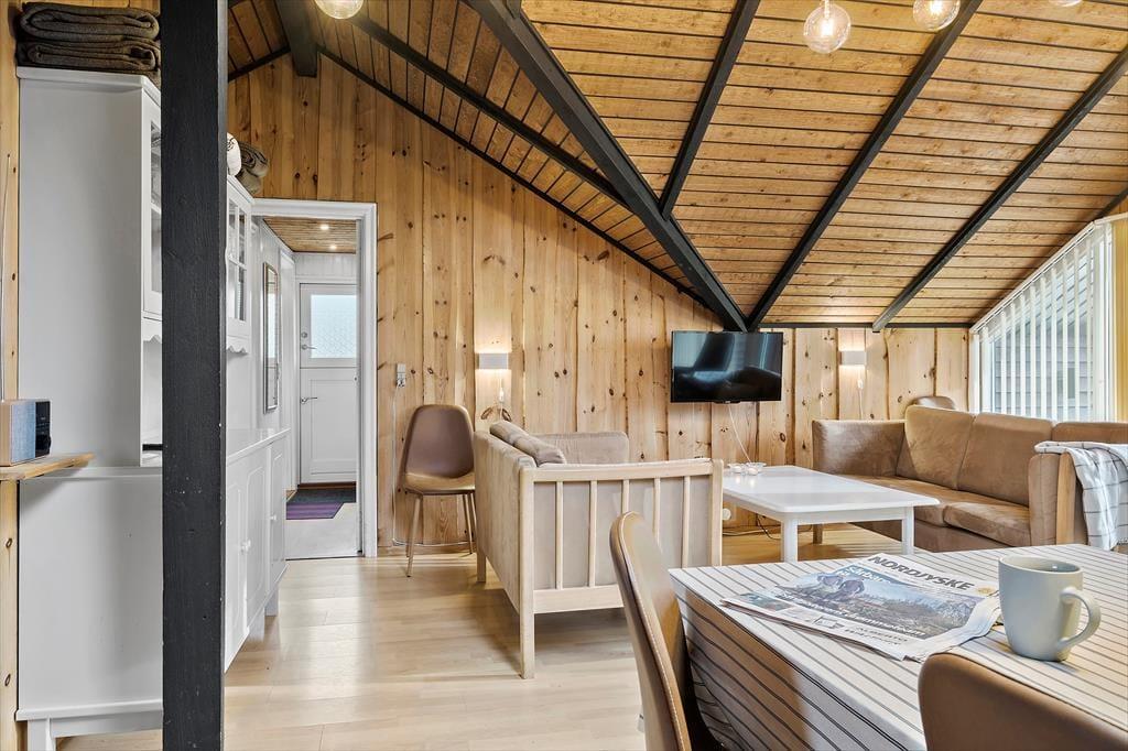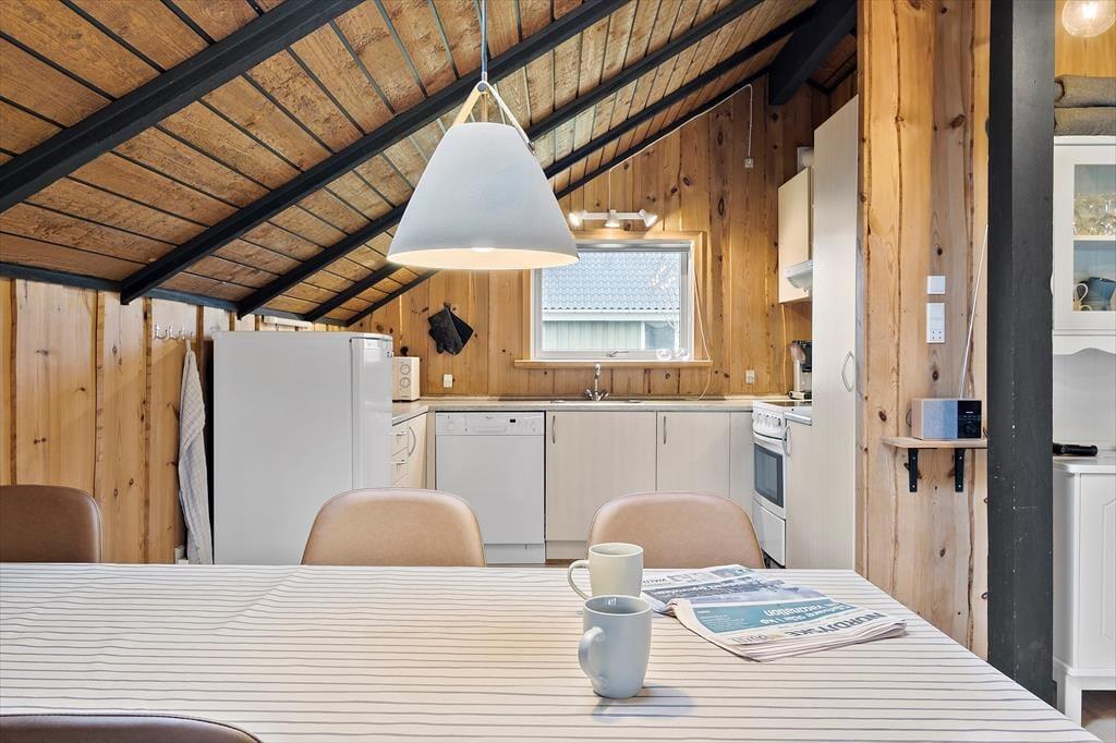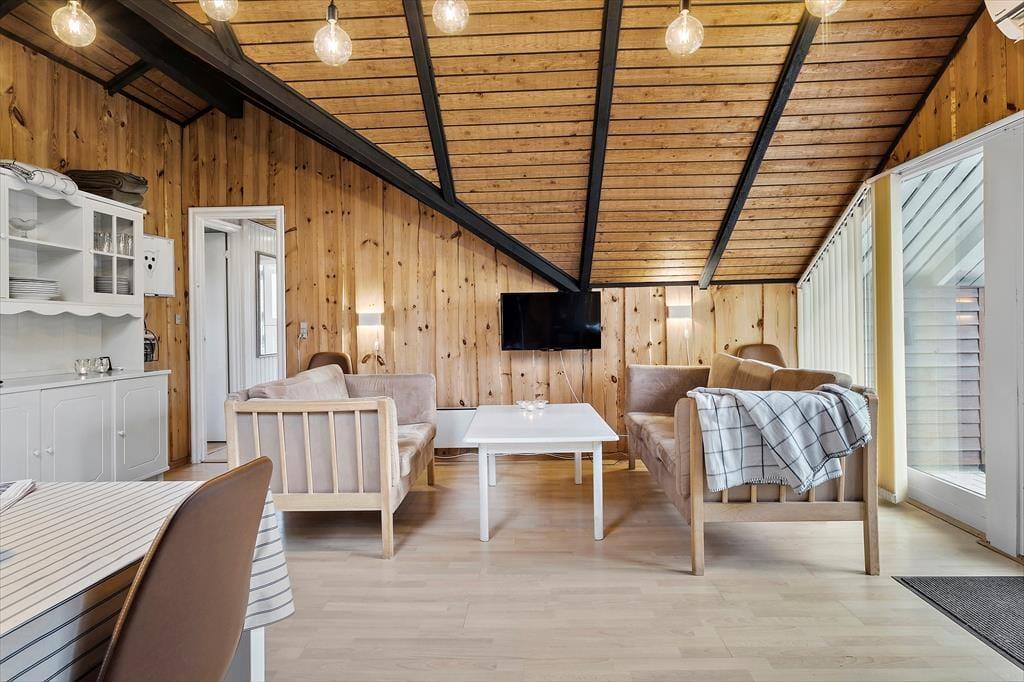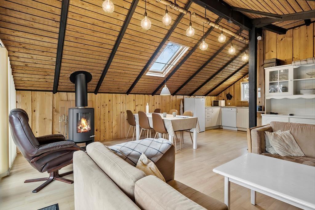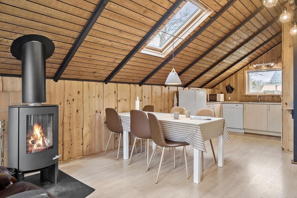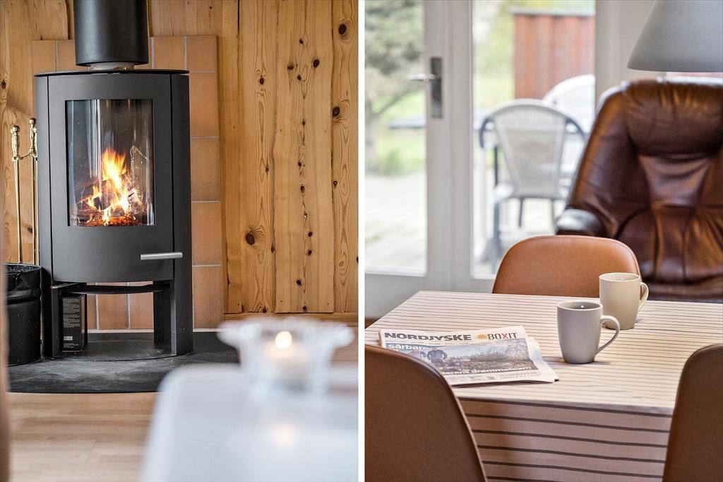 Med to gode soveværelser, et brusebadeværelse og en hyggelig stue passer planløsningen godt til fire personer, og en hund er også velkommen inden døre. Køkkenet er integreret med stuen, så I kan nemt smutte hen for at hente mere kaffe eller fylde skålen med snacks op, når I spiller kort ved spisebordet eller slapper af i sofaen med bøger eller en god film. Brændeovnen står klar til at sprede både varme og hyggestemning, og med loft til kip, rustik træbeklædning og god belysning er der i det hele taget bare en skøn atmosfære inden døre.