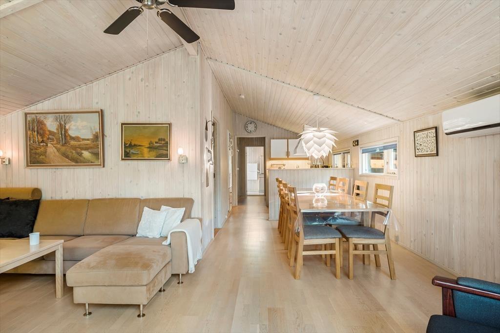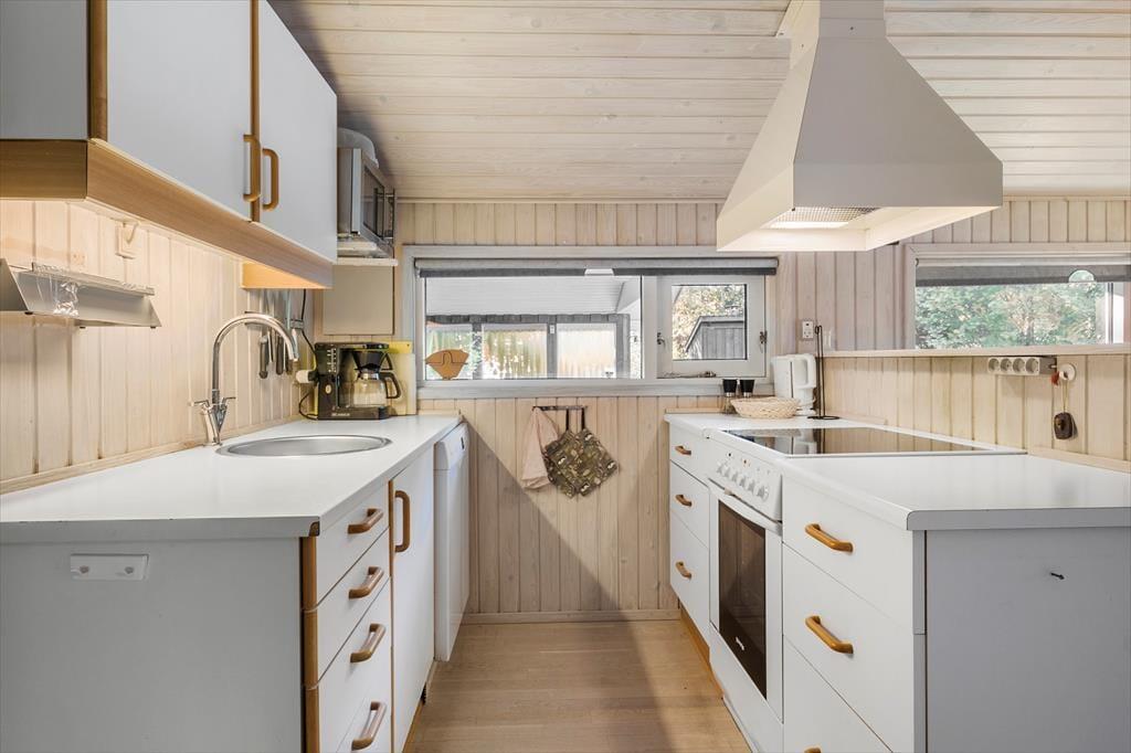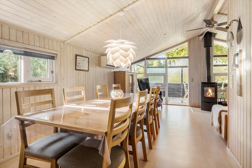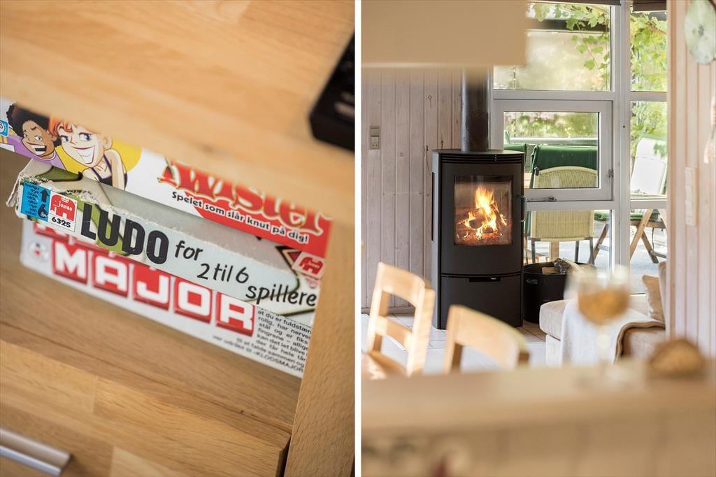 Træhuset emmer af sommerhushygge fra det øjeblik, du træder ind. Indretningen er lys og venlig, og rummene er veludnyttede, så du har masser af plads til at slappe af. I opholdsrummet er køkkenet åbent forbundet med stuen, hvor bløde sofaer og spisebordet samler familien til hyggelige stunder. Her kan du tænde op i brændeovnen på en kølig aften, mens I spiller brætspil eller ser en god film på tv'et. De gode soveværelser giver dig en dejlig base at trække dig tilbage til efter en dag med oplevelser i det fri.