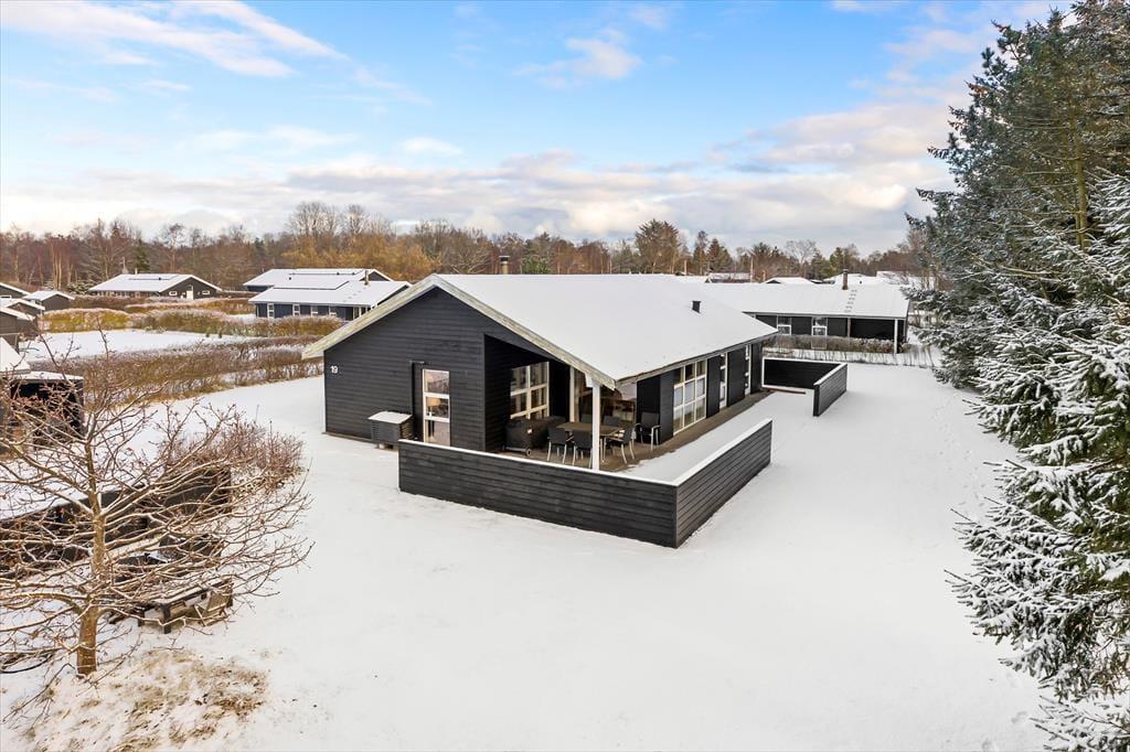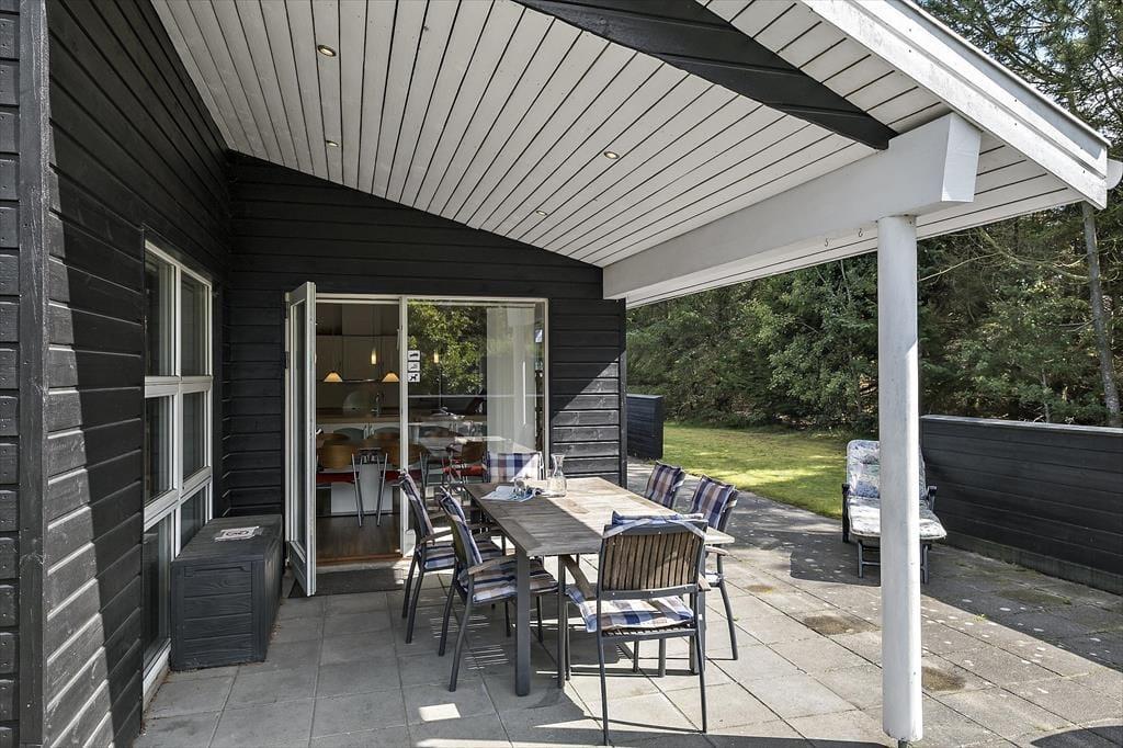 Sommerhusets overdækkede terrasse er den perfekte ramme for at nyde livet udendørs – uanset om du vil have morgenkaffen i solen eller slappe af med et godt glas vin om aftenen. Terrassen er udstyret med komfortable havemøbler, og her kan du virkelig mærke, hvordan feriestemningen breder sig, mens du sidder i ro og mag og nyder den friske luft. På de varmere dage kan du tage en dukkert i den fælles pool, som ligger i en separat bygning, eller lade dig forkæle i saunaen, der er en perfekt afslutning på en lang dag med ferieaktiviteter. Den store græsplæne indbyder til leg og afslapning, og der er rig mulighed for at nyde den stille natur omkring sommerhuset.