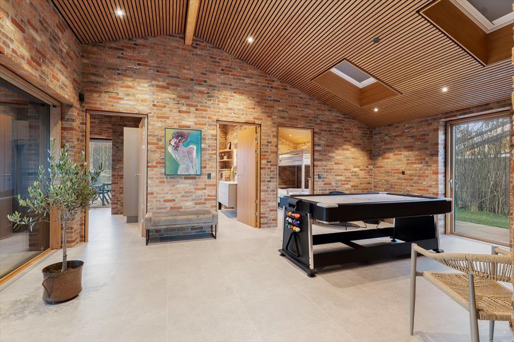 Inden døre mødes I af den der særlige fornemmelse, hvor alt er lyst, indbydende og gennemtænkt – og hvor feriestemningen hurtigt sænker sig. Her er der god plads til, at flere generationer eller en stor venneflok kan være sammen uden at være oven i hinanden, og samtidig er der rig mulighed for at finde små, rolige hjørner til en stille stund med en kop kaffe. Som prikken over i’et er der lagt op til ren forkælelse i gæstehuset, hvor både sauna og spa indbyder til wellness efter en dag ved vandet. Det er den slags komfort, der gør, at feriedagene føles ekstra lange på den gode måde – og at aftenerne bliver til afslappede timer, hvor man helt glemmer kalenderen derhjemme. Feriedagene kan byde på masser af sjov og samvær inden døre, idet huset råder over et skønt aktivitetsrum med et multibord, der nemt kan skifte mellem pool/billard, airhockey og bordtennis. Her er der lagt op til hyggelige turneringer og grin på tværs af alder, mens værelserne samtidig giver god plads til leg, afslapning og små pauser i eget tempo.