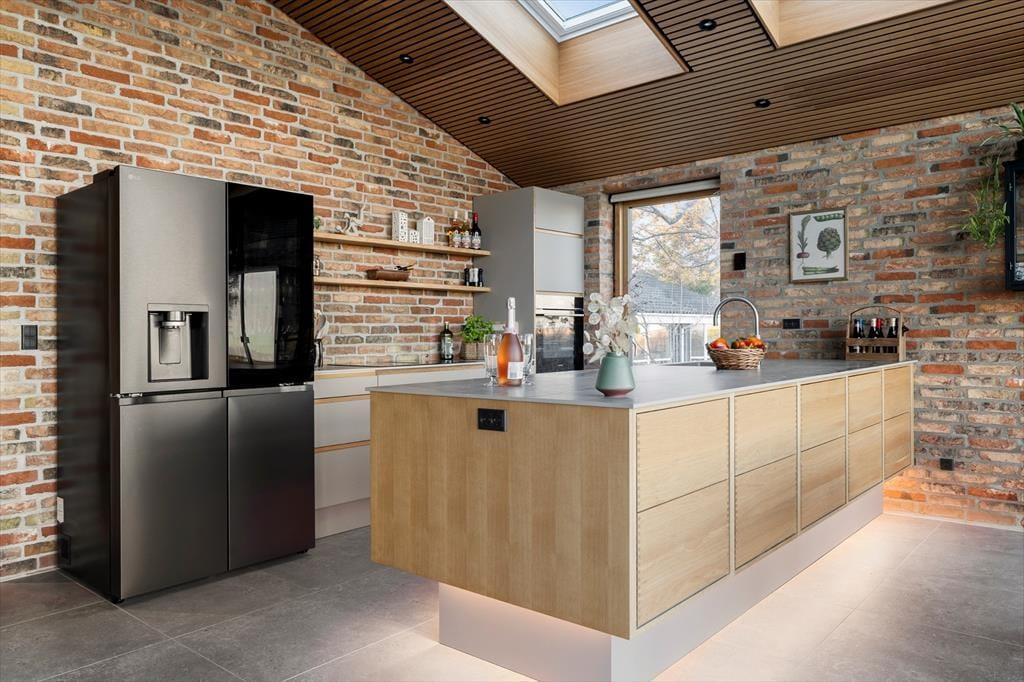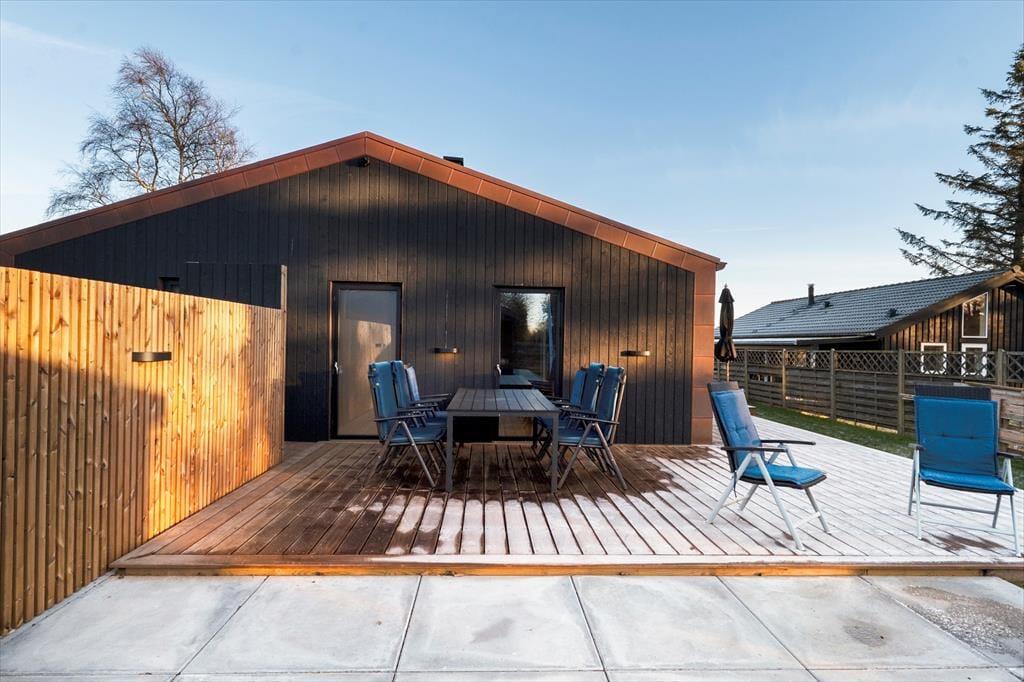 Udelivet får helt perfekte rammer her, for en stor træterrasse omkranser huset og fortsætter ud i et flot flisebelagt terrasseområde, der binder hovedhus og gæstehus sammen. Det gør det nemt at lade ferien flyde frit mellem fælles hygge og små pauser i solen – uanset om I samles til morgenmad under åben himmel eller finder hver jeres favoritplads med læ og varme. Når mørket falder på, venter endnu et højdepunkt: udespaen, der nærmest kalder på stjerneklare aftener med ro i kroppen og salt i luften. Og med en udebruser lige ved hånden kan du skylle sand og havvand af, inden du glider ned i det varme vand – eller tage en frisk skyller, når du kommer tilbage fra stranden. Her er det let at mærke, at ferien foregår udendørs så meget som muligt, præcis som den bør ved Kattegat.