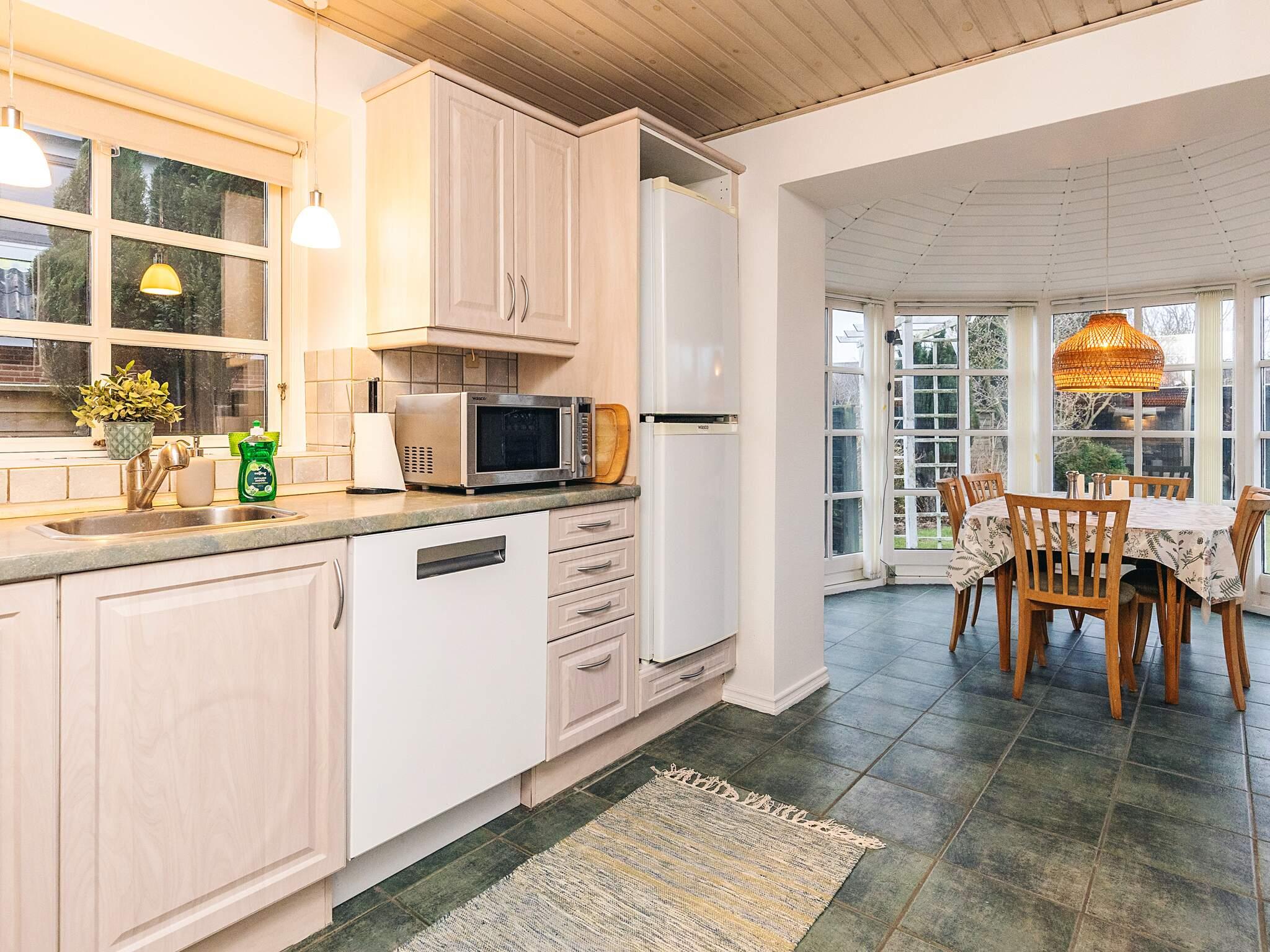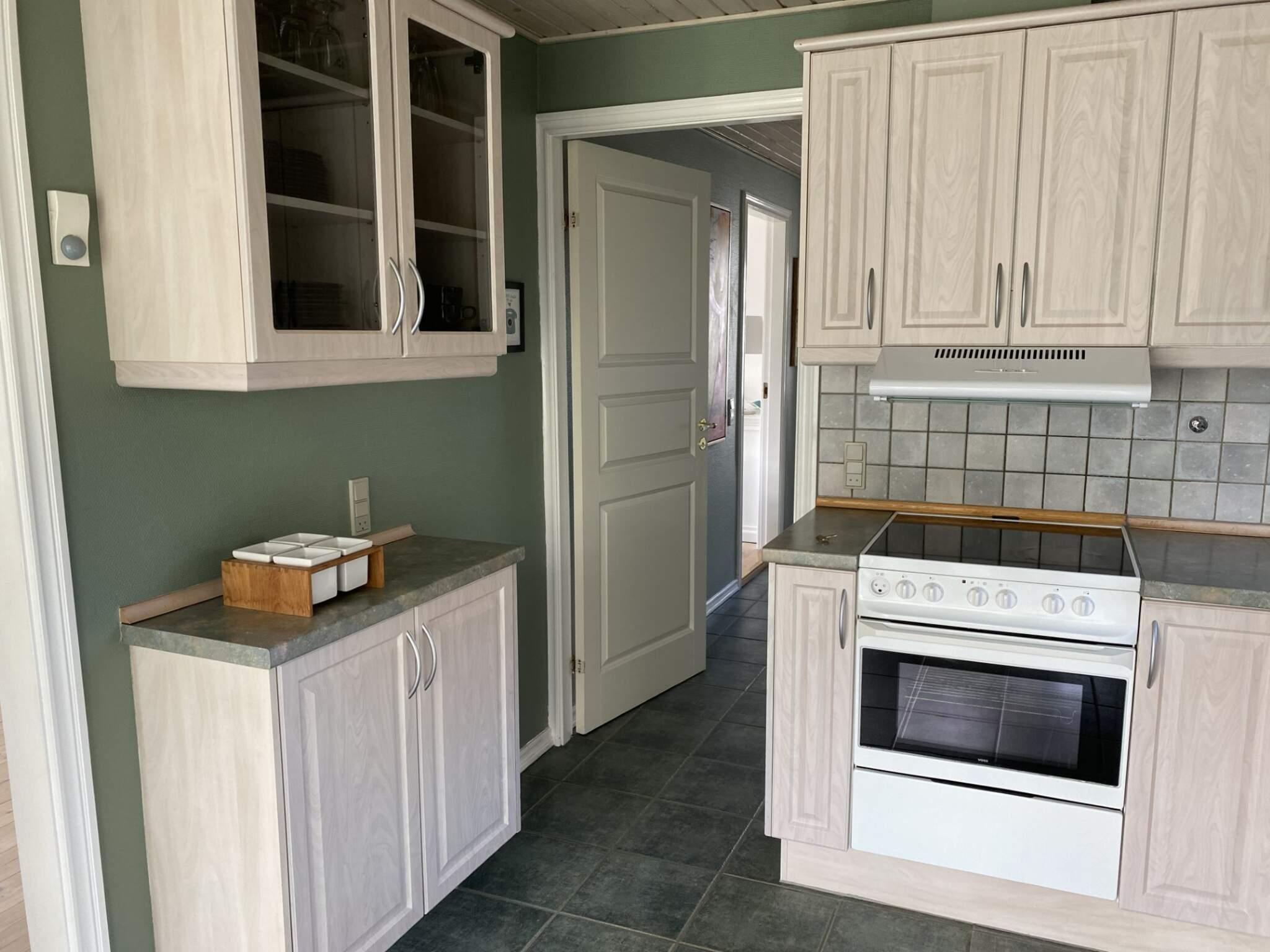 Et dejligt funktionelt køkken - med alt man skal bruge til god madlavning. Køkkenet ligger i forlængelse af en dejlig buet spisestue med glasparti mod haven.
