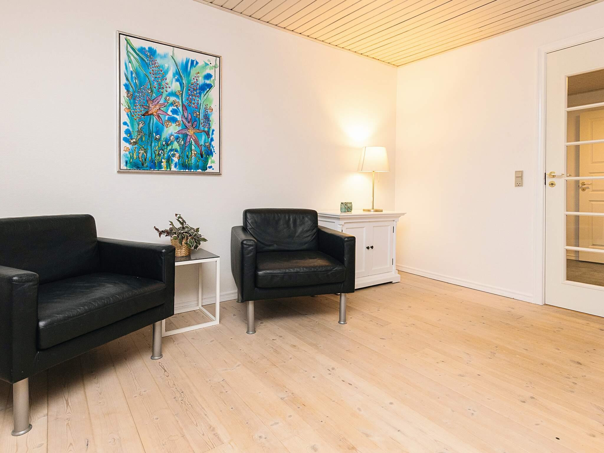 På første sal venter der tre gode værelse samt en lys og åben repos, der bruges som ekstra opholdsrum. Et skønt loungesæt er placeret med dejligt kig ned til havet.
