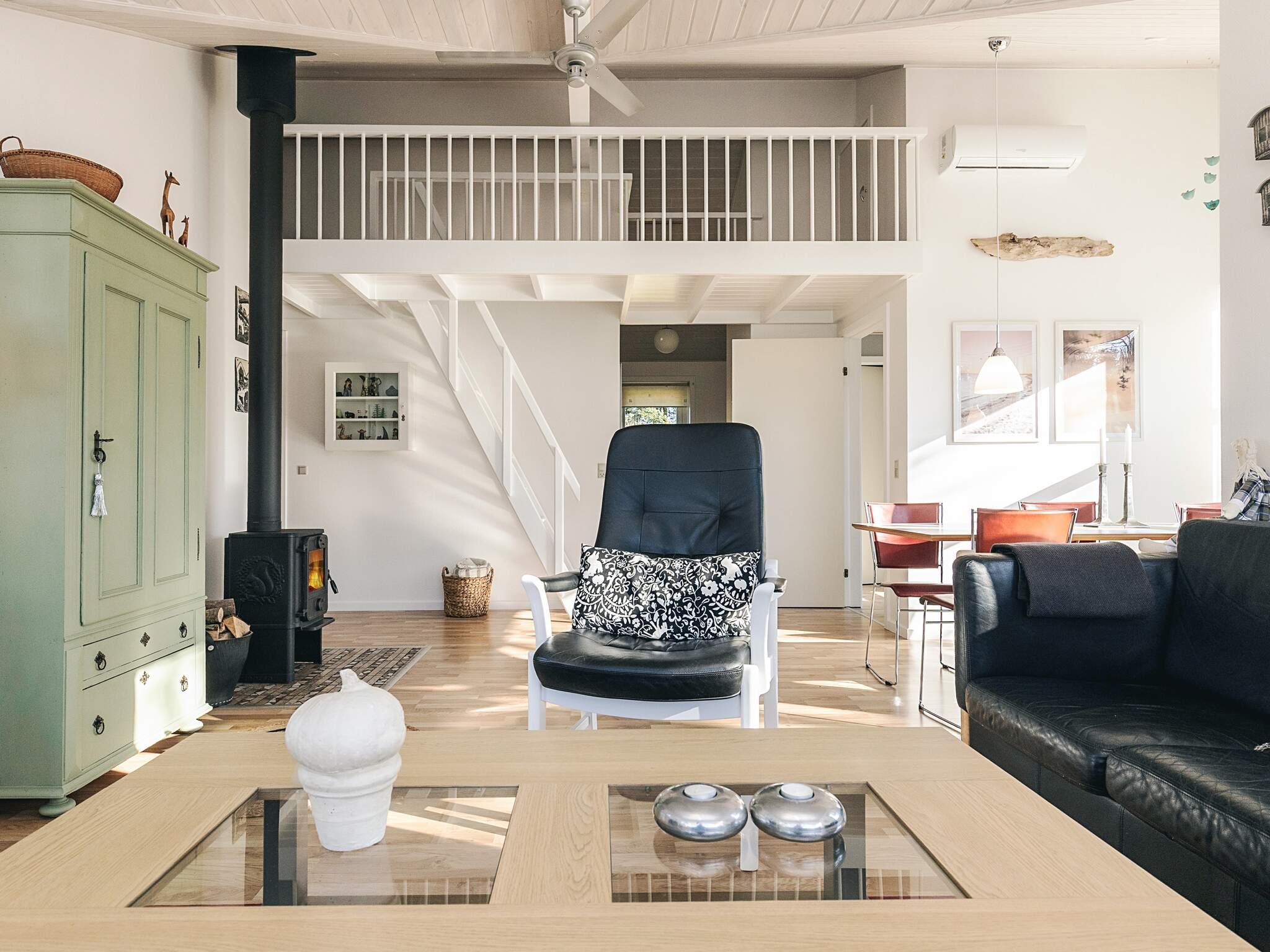 Utraditionelt sommerhus som fremtræder som en flot, arkitektonisk helhed, da det er bygget af gedigne materialer. Der er spabad til afslapning. De store vinduer sikrer et flot lysindfald. Huset er smagfuldt møbleret med et stort opholdsrum. I den åbne kombineret stue og spisestue kan de slappe af i sofagruppen med husets tv pakke, der både inkluderer dansk, tysk, norsk og svensk tv. De store soveværelser har god skabsplads og er alle udstyret og mørklægningsgardiner. Den ene seng er en ¾ seng. Ingen dørtrin i selve huset. Pusleplads på det ene af de to badeværelser. En stor hems med vindue, som kan benyttes af børn til leg og spil. Huset er beliggende på en stor lukket grund med masse af gode kroge. Der er både terrasse mod øst for morgensolen og mod vest til aftensolen, ydermere 2 solvogne til rådighed. Huset ligger lige udenfor byskiltet til Hou by og derfor i gåafstand til indkøbsmuligheder og nogle af områdets bedste, mest børnevenlige sandbadestrande. Udlejes kun til familier.