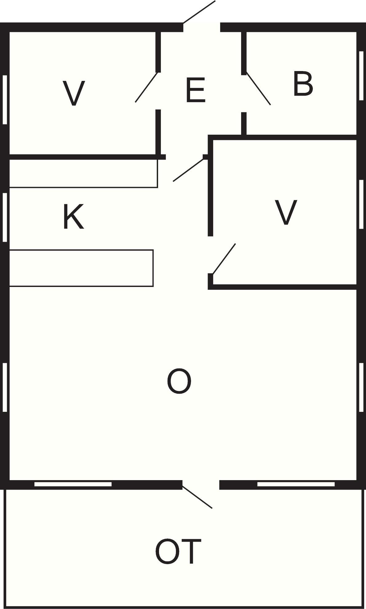 Sommerhus med praktisk indretning. Fra stuen udgang til sydvendt, overdækket terrasse. Ligger på vandsiden ved en vej.