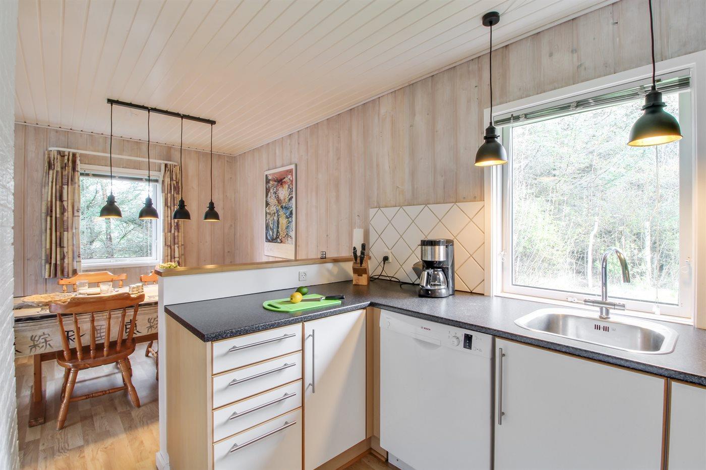 Køkkenet er udstyret med 1 køleskab. Der er 4 keramiske kogeplader, varmluftovn, mikrobølgeovn samt opvaskemaskine.