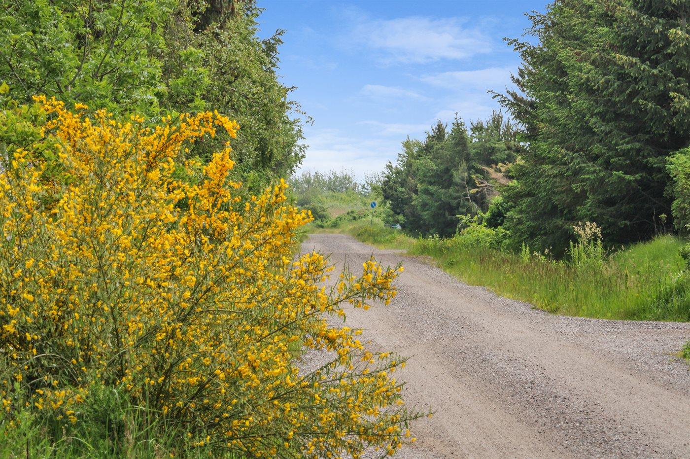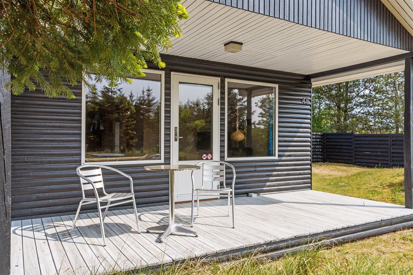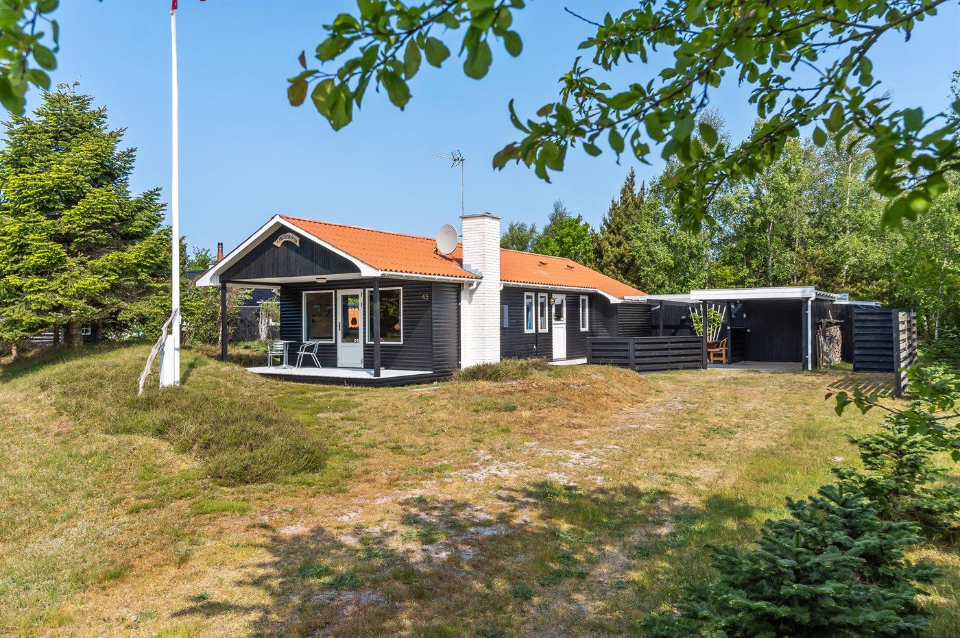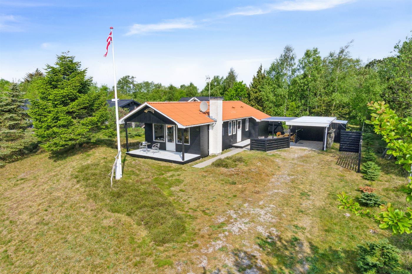 Ferieboligen er beliggende på en 1050 m² stor naturgrund. Der er 300 m til havet. Nærmeste forretning er beliggende i en afstand af 300 m. Til ferieboligen hører 45 m² terrasseareal. Desuden er der 25 m² overdækket terrasse. Der er redskabsrum. Grill til rådighed. Der er carport til rådighed. Parkering ved ferieboligen.