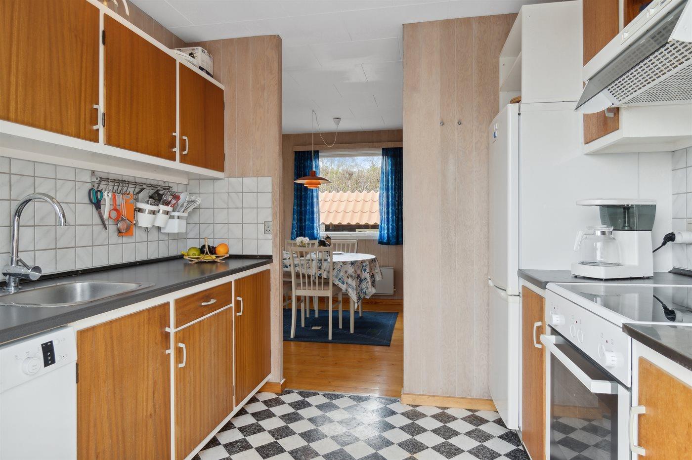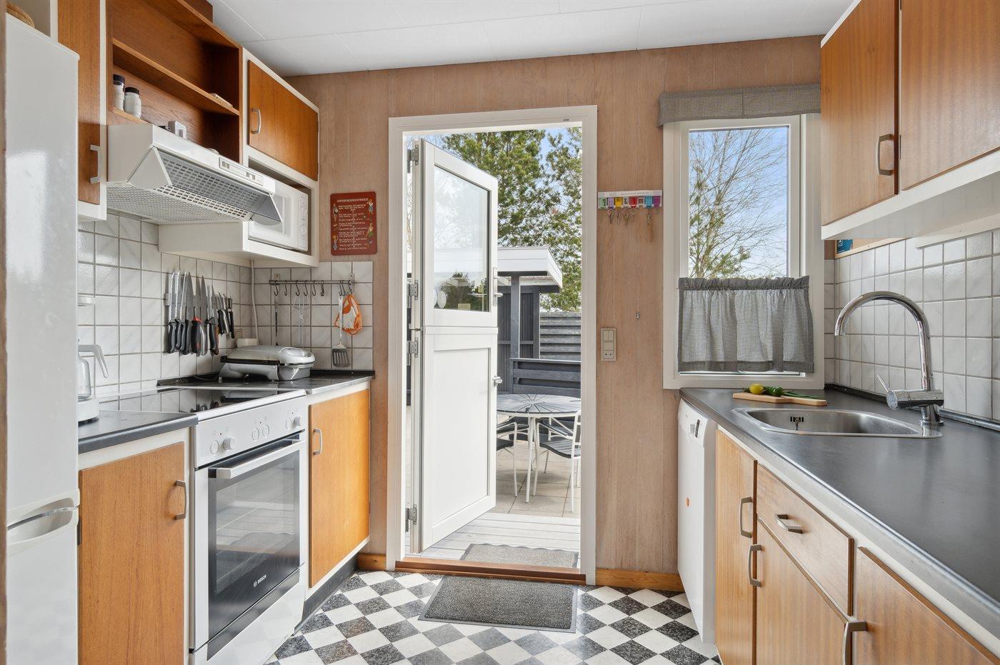 Køkkenet er udstyret med 1 køleskab. Der er 4 keramiske kogeplader, varmluftovn, mikrobølgeovn samt opvaskemaskine.