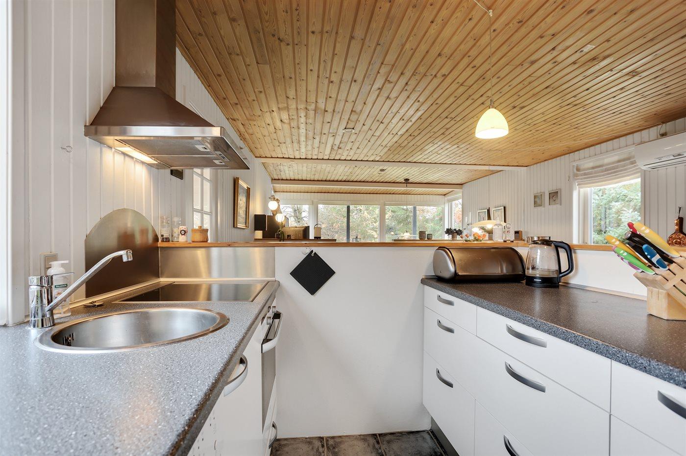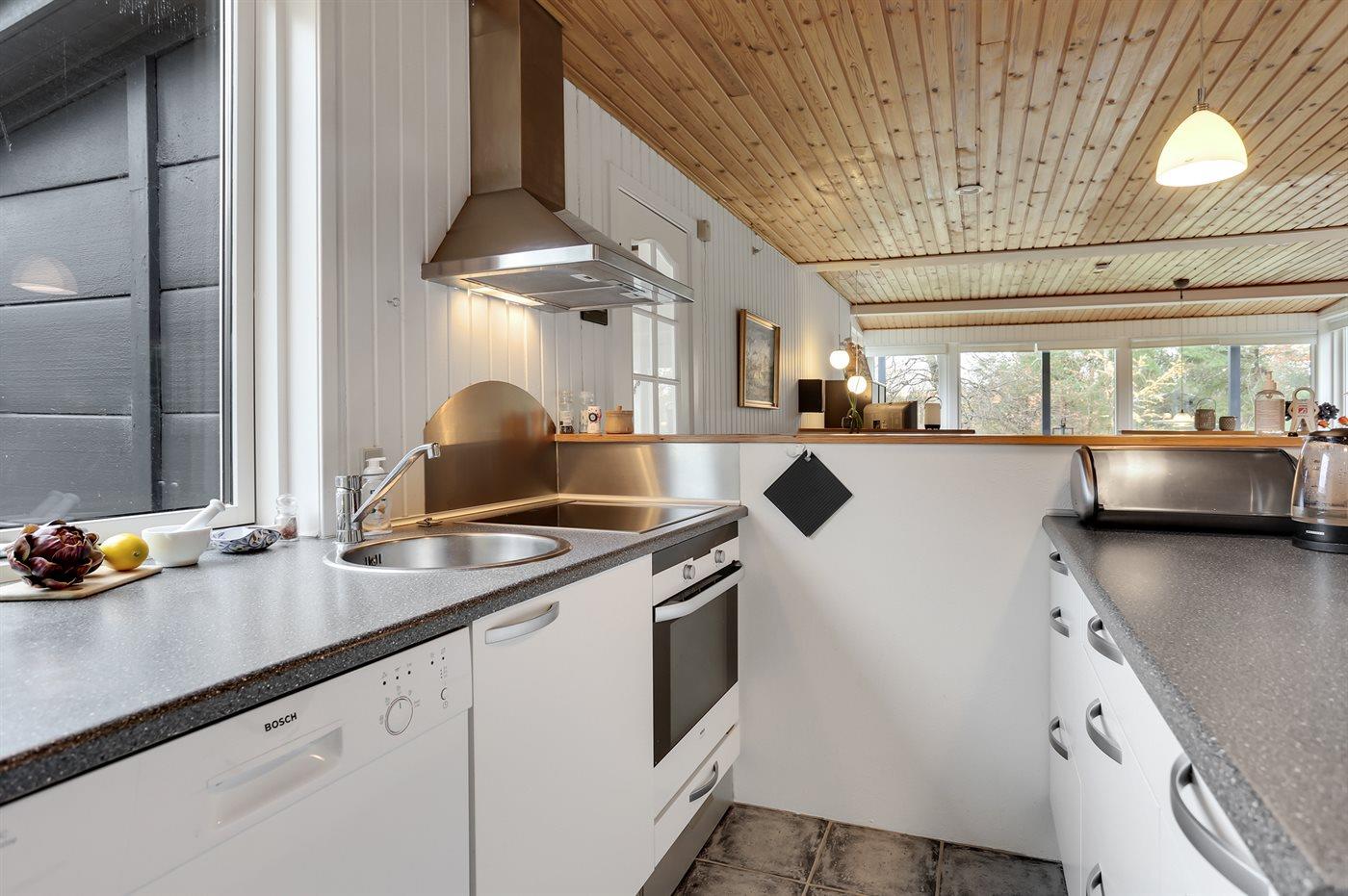 Køkkenet er udstyret med 1 køleskab. Der er 4 keramiske kogeplader, bageovn, mikrobølgeovn samt opvaskemaskine.