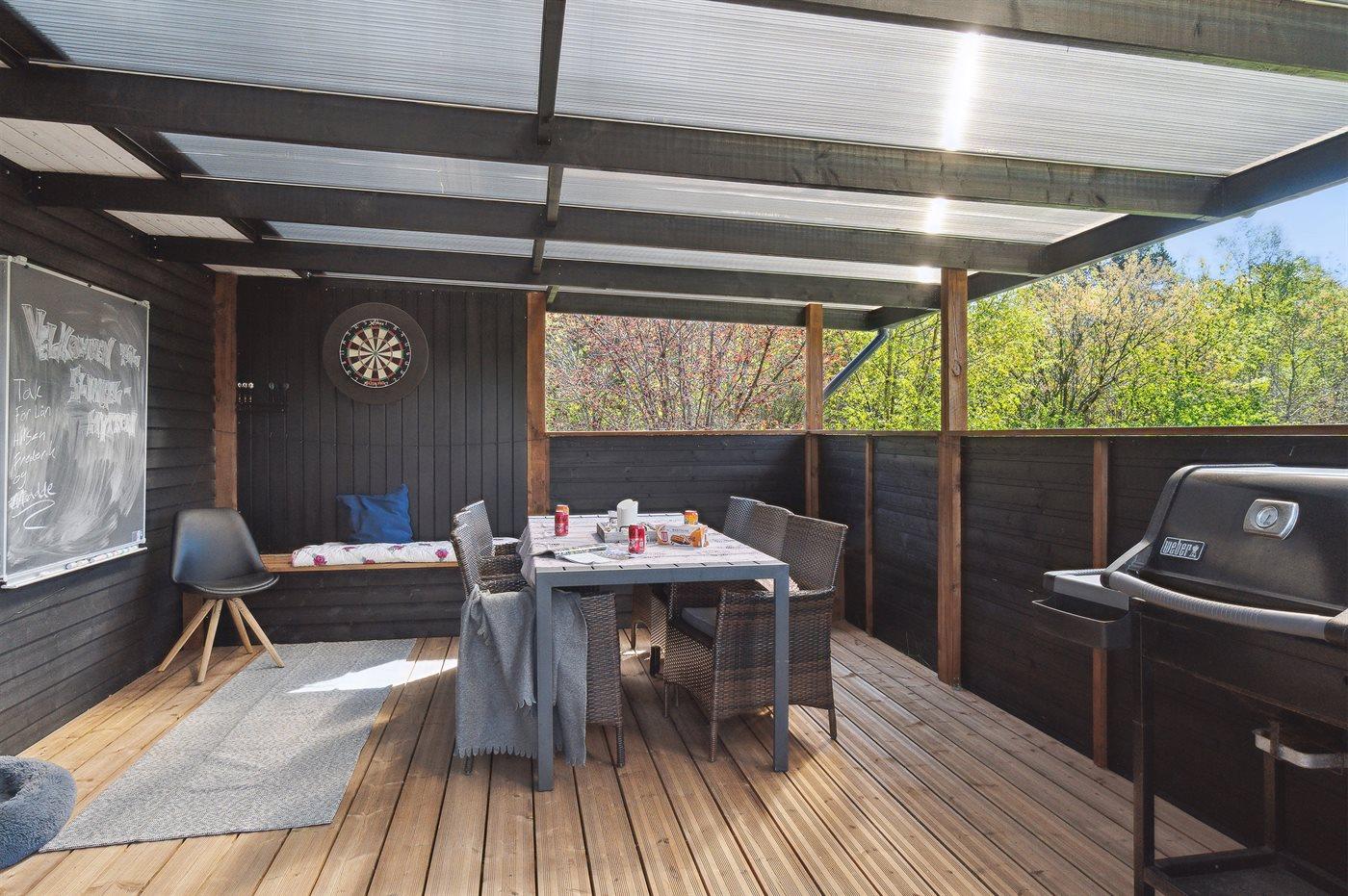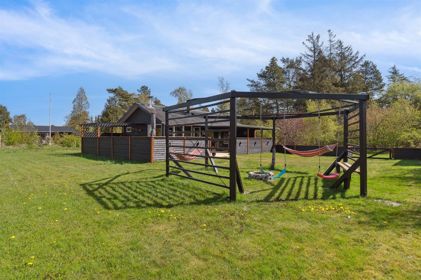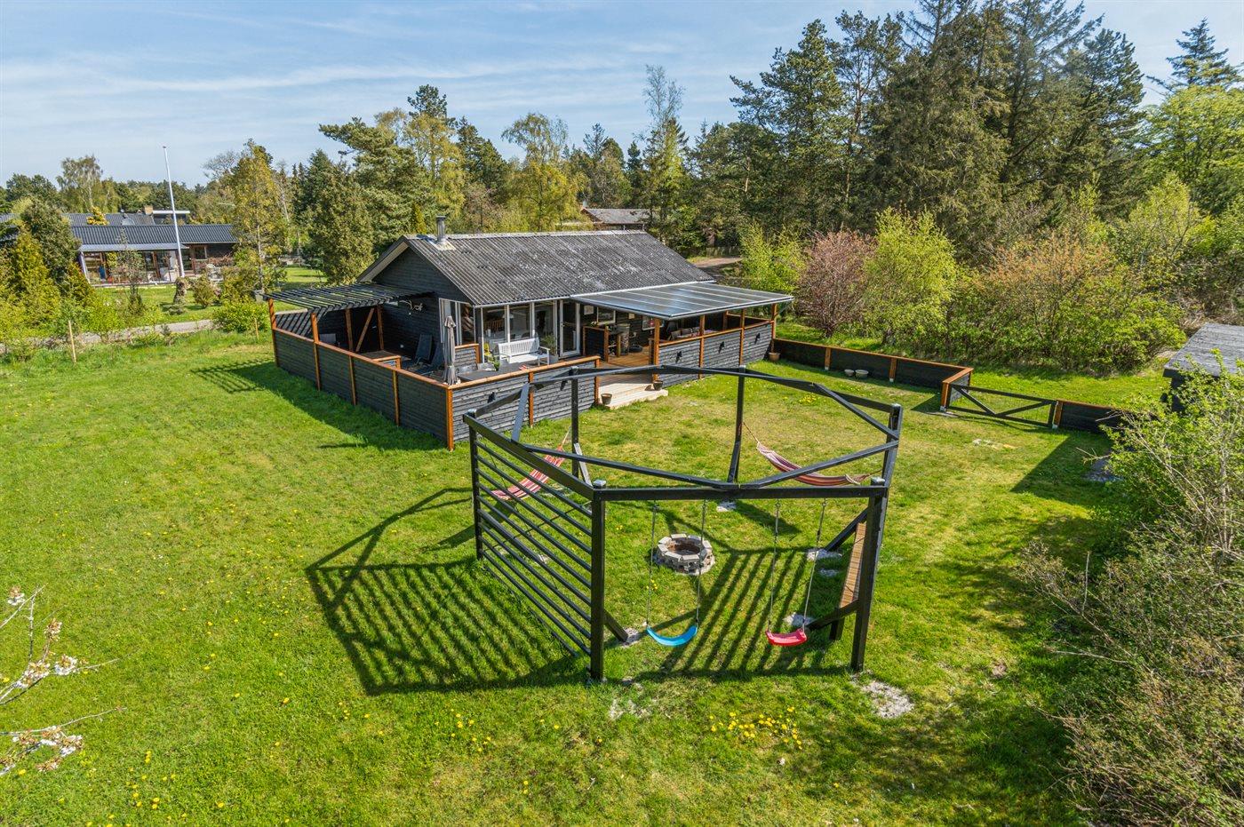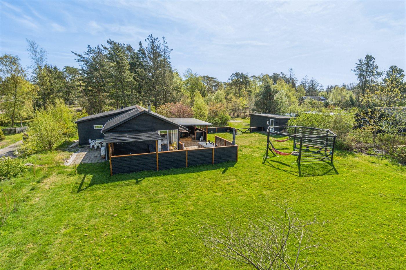 Ferieboligen er beliggende på en 1200 m² stor naturgrund. Grunden er indhegnet. Der er 350 m til havet. Nærmeste forretning er beliggende i en afstand af 1200 m. Til ferieboligen hører åbent terrasseareal. Desuden er der overdækket terrasse. Gynge. Bålsted. Grill til rådighed. Parkering ved ferieboligen.