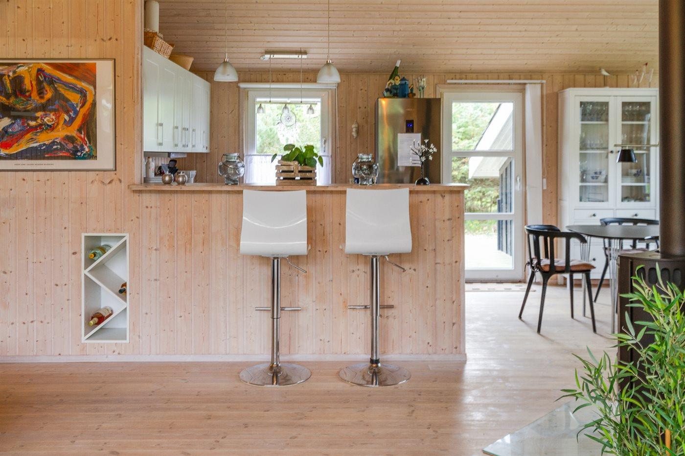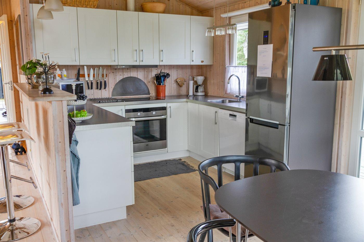 Køkkenet er udstyret med 1 køleskab. Der er 4 keramiske kogeplader, varmluftovn, mikrobølgeovn samt opvaskemaskine.