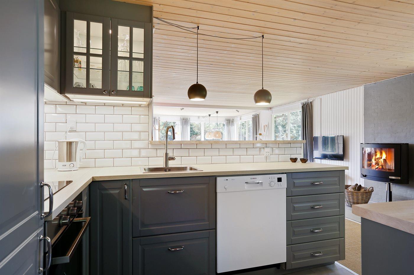 Køkkenet er udstyret med 1 køleskab. Der er 4 keramiske kogeplader, varmluftovn, mikrobølgeovn samt opvaskemaskine.