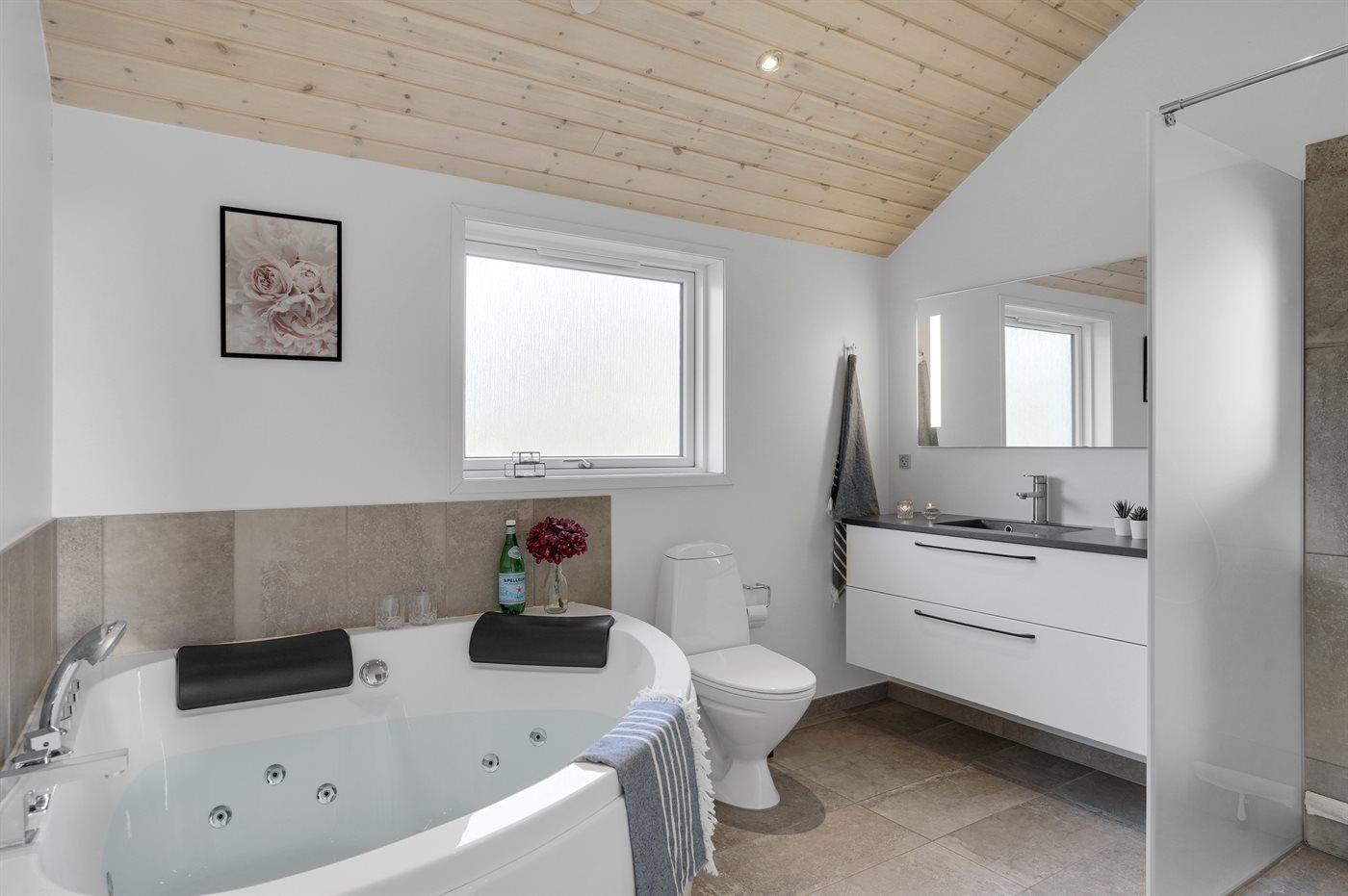 Der er 2 badeværelser med bruseniche og 2 toiletter. Der er gulvvarme på 2 badeværelser. I saunaen er der mulighed for afslapning.