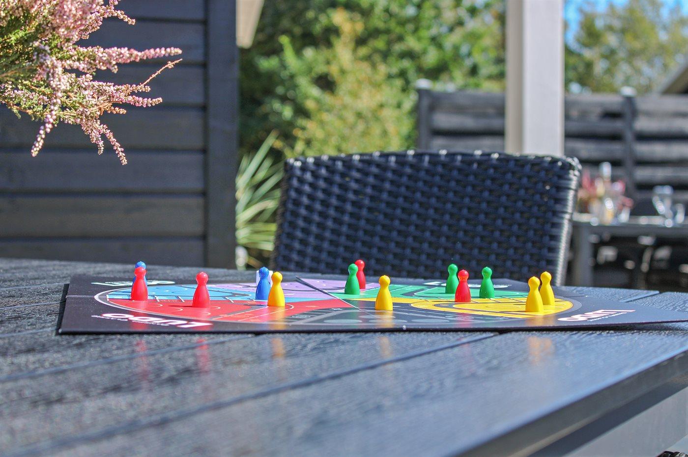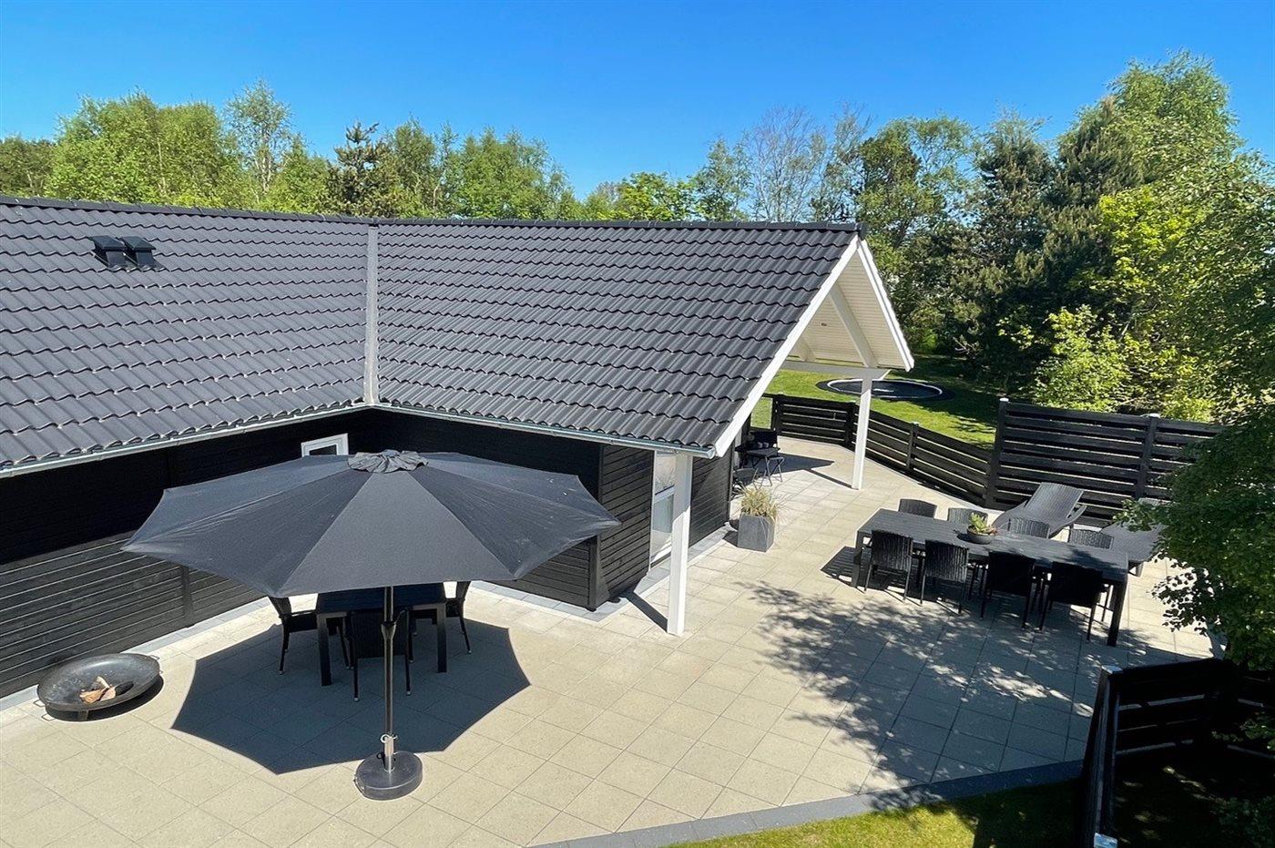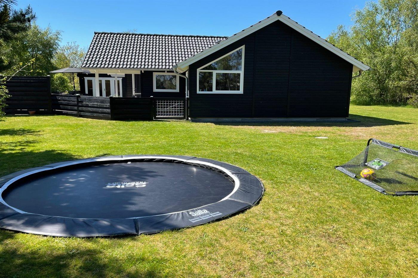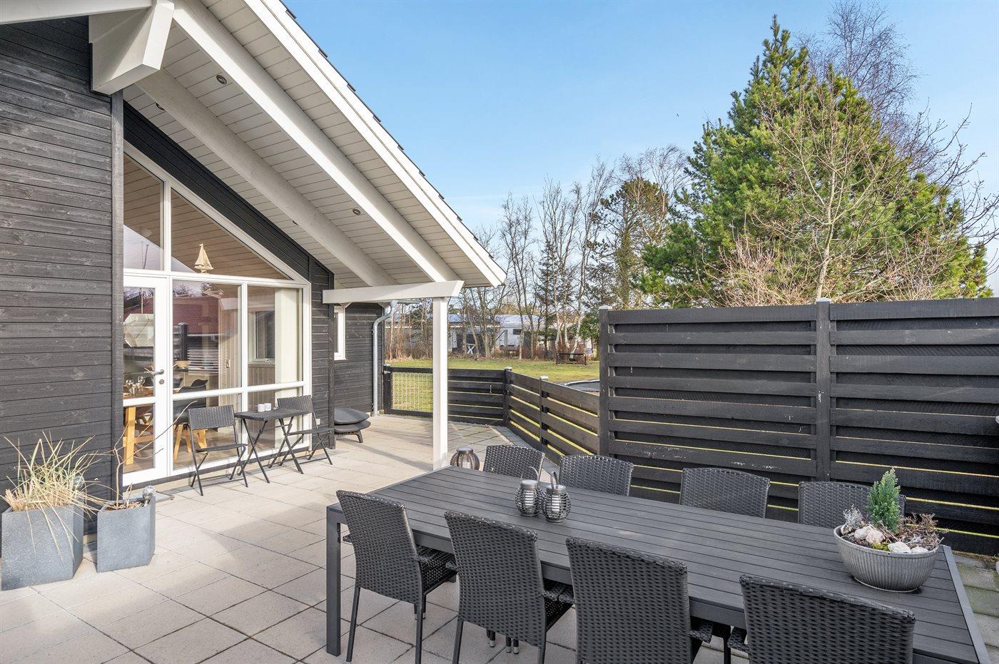 Ferieboligen er beliggende på en 1008 m² stor havegrund. Der er 400 m til havet. Der er 6000 m til fjorden. Der er en sø i en afstand af 500 m. (Lagunen Fiskepark). Nærmeste forretning er beliggende i en afstand af 3000 m. Der er en golfbane i en afstand af 6000 m. Til ferieboligen hører 78 m² terrasseareal. Desuden er der 9 m² overdækket terrasse. Heraf i alt 87 m² lukket terrasse. 2 liggestole med hynder. Trampolin. Petanque. Stigegolf, Kongespil og kroketspil til rådighed. Fodboldmål. Grill til rådighed. Parkering ved ferieboligen.