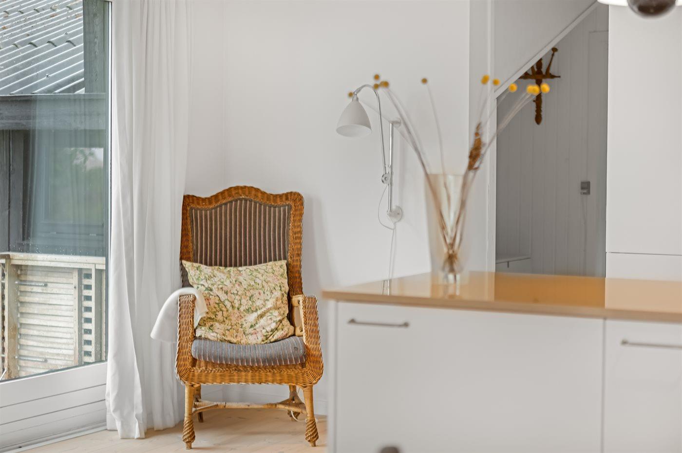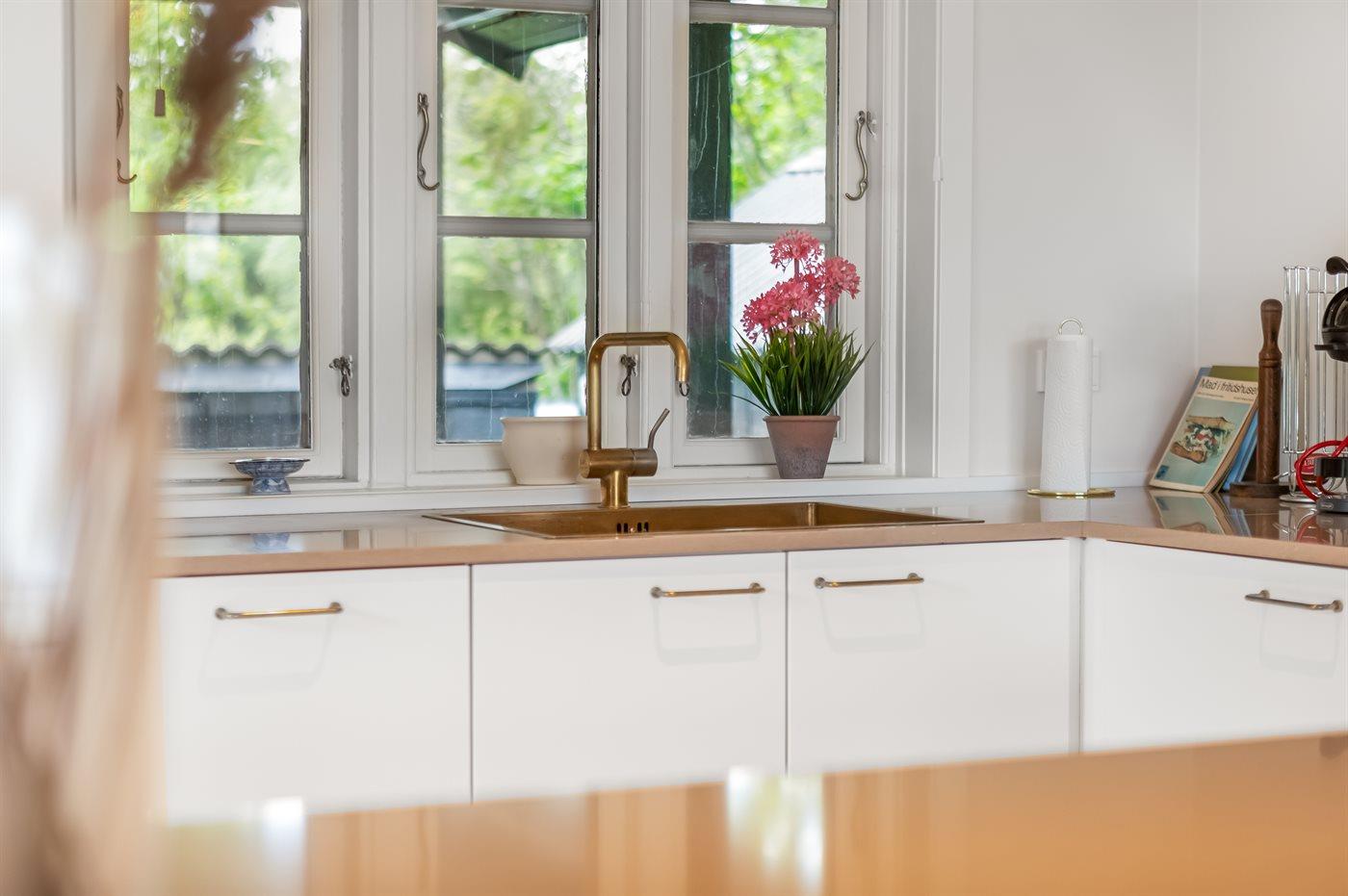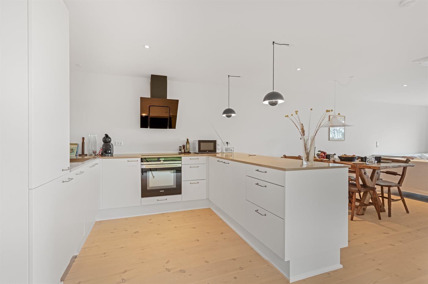 Køkkenet er udstyret med 1 køleskab. Der er 4 keramiske kogeplader, varmluftovn, mikrobølgeovn samt opvaskemaskine.