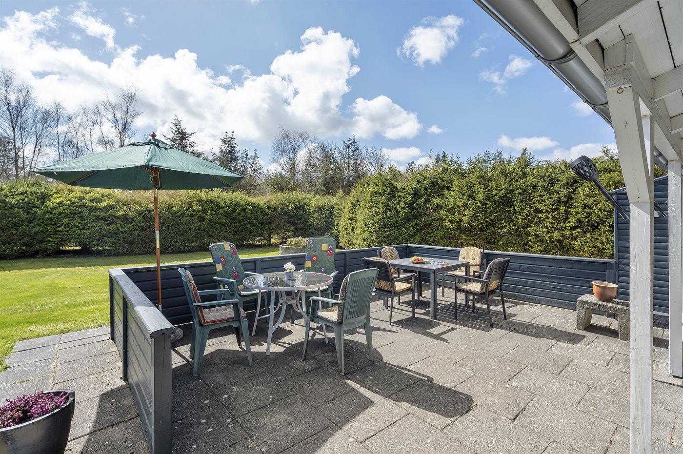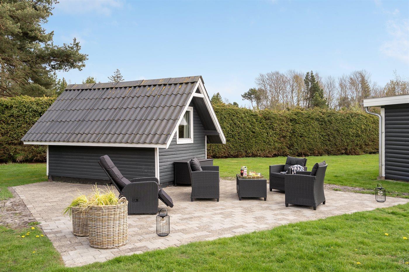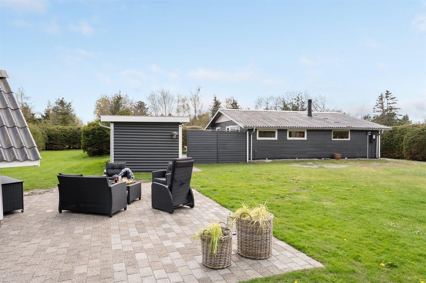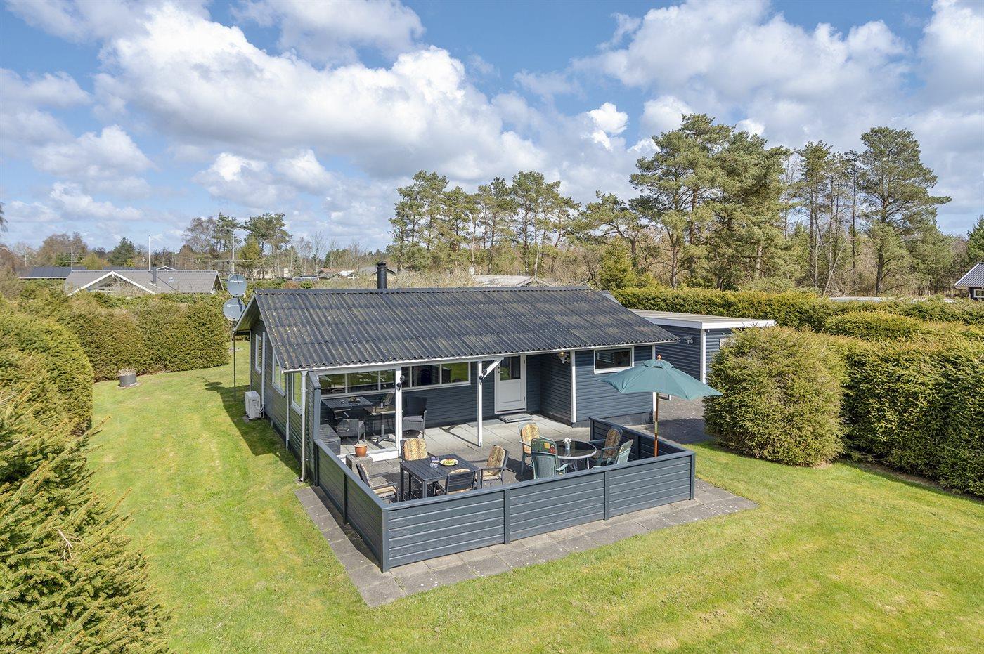 Ferieboligen er beliggende på en 1200 m² stor Grunden er indhegnet. Der er 1500 m til havet. Nærmeste forretning er beliggende i en afstand af 1500 m.Til ferieboligen hører 60 m² åbent og 10 m² overdækket terrasseareal - heraf i alt 30 m² lukket terrasse. Der er redskabsrum. Der ligger en legeplads i en afstand af 500 m. Grill til rådighed. Der er installeret stik til opladning af elbil. Parkering ved ferieboligen.