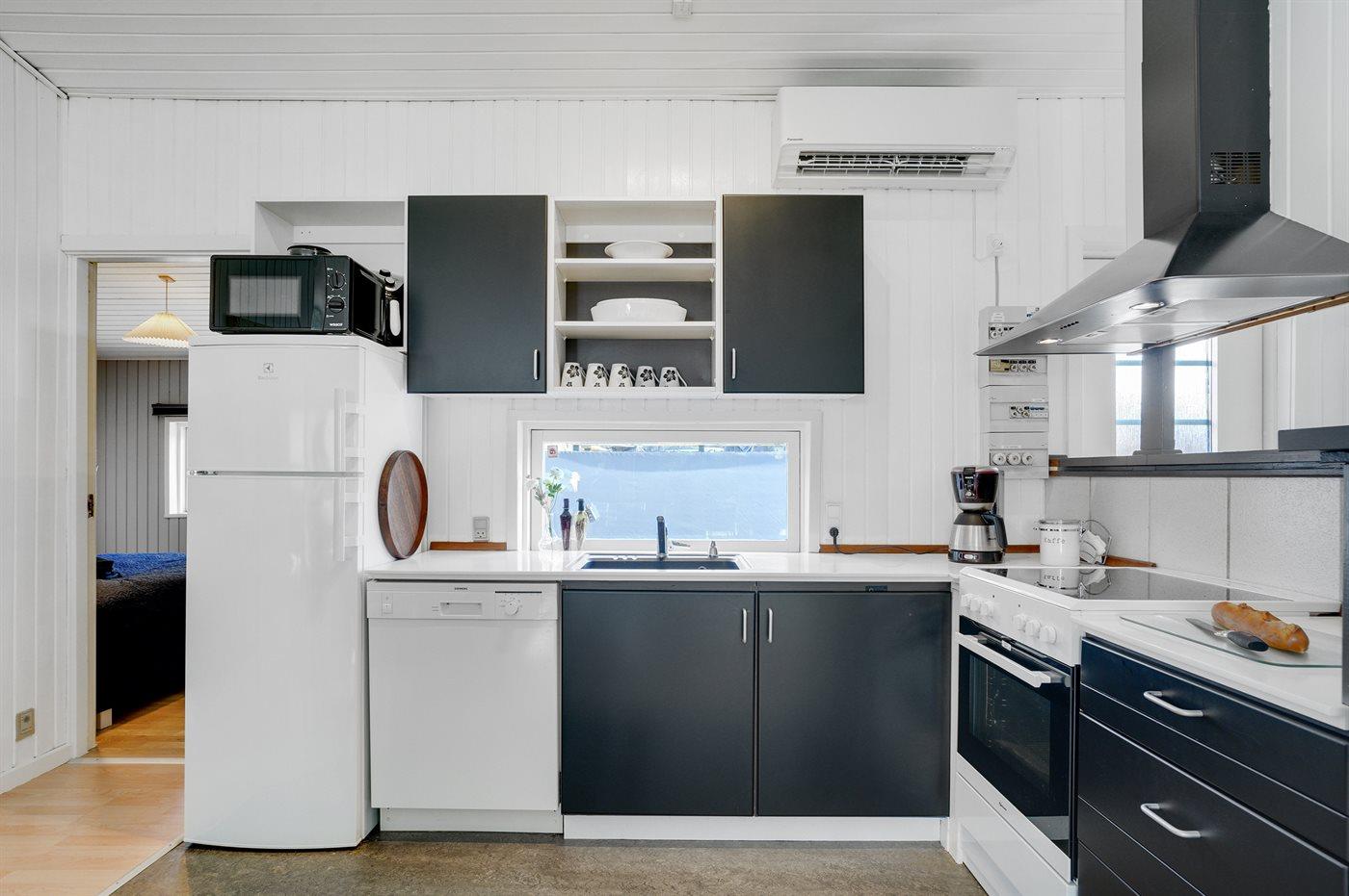Køkkenet er udstyret med 1 køleskab. Der er 4 keramiske kogeplader, varmluftovn, mikrobølgeovn samt opvaskemaskine.