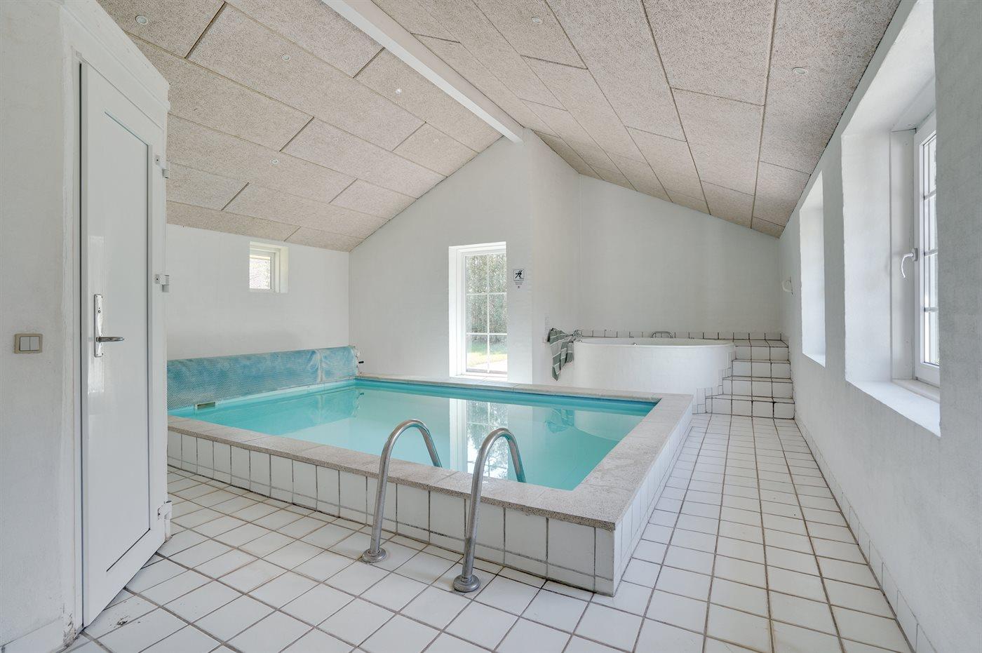 Husets pool er på 4,2 m x 2,8 m og er op til 1,1 m dyb. Vandet i poolen er mellem 24 og 28° C varmt.