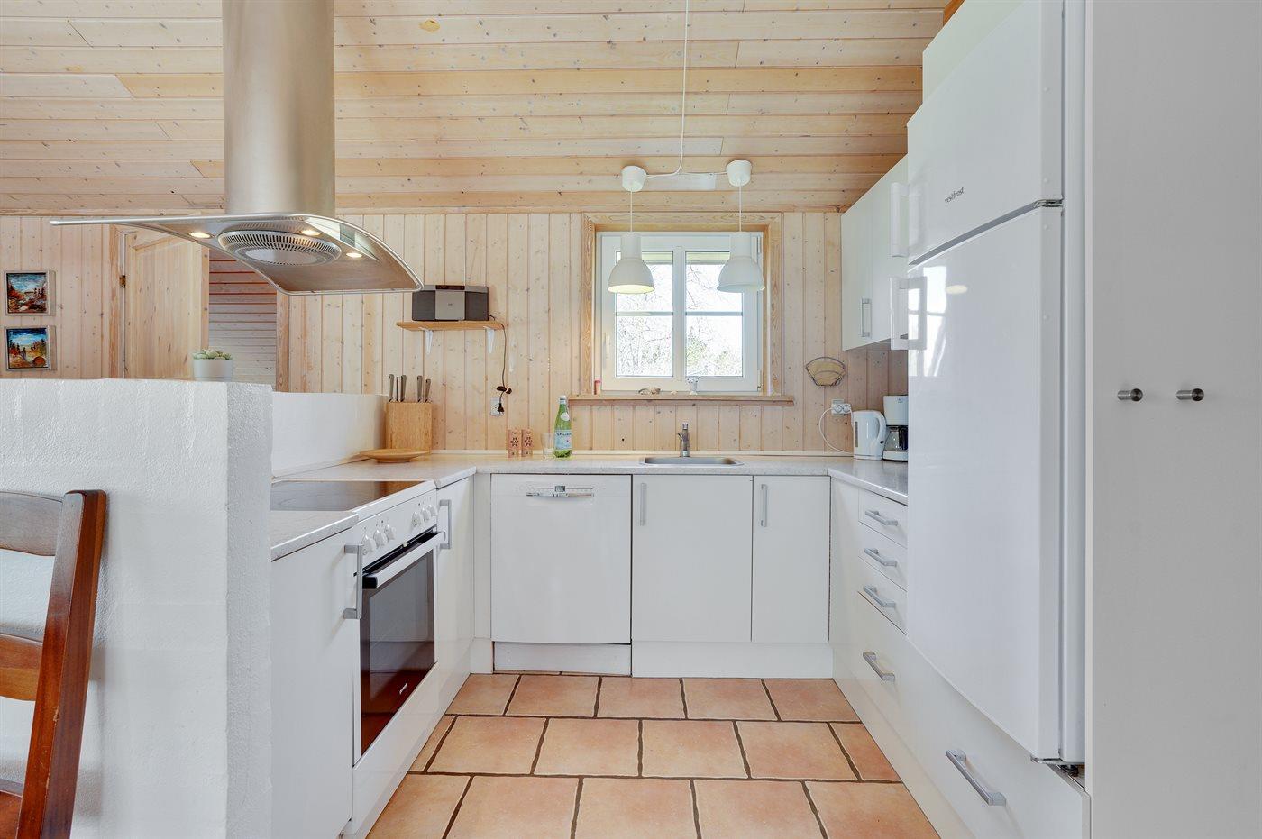 Køkkenet er udstyret med 1 køleskab med frysekapacitet på 40 liter, 4 keramiske kogeplader, varmluftovn, mikrobølgeovn samt opvaskemaskine.