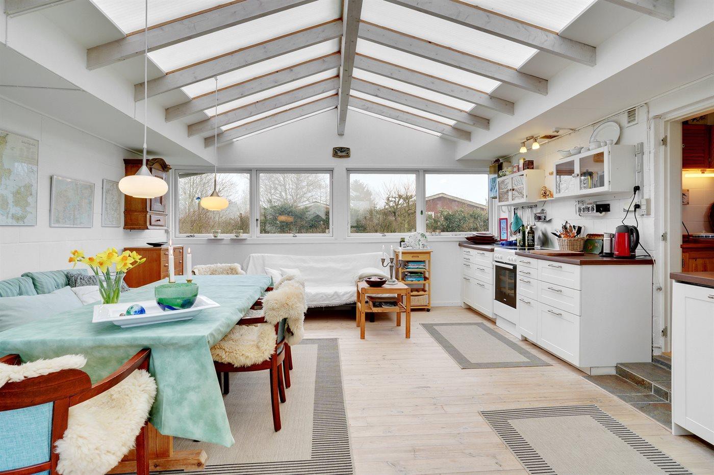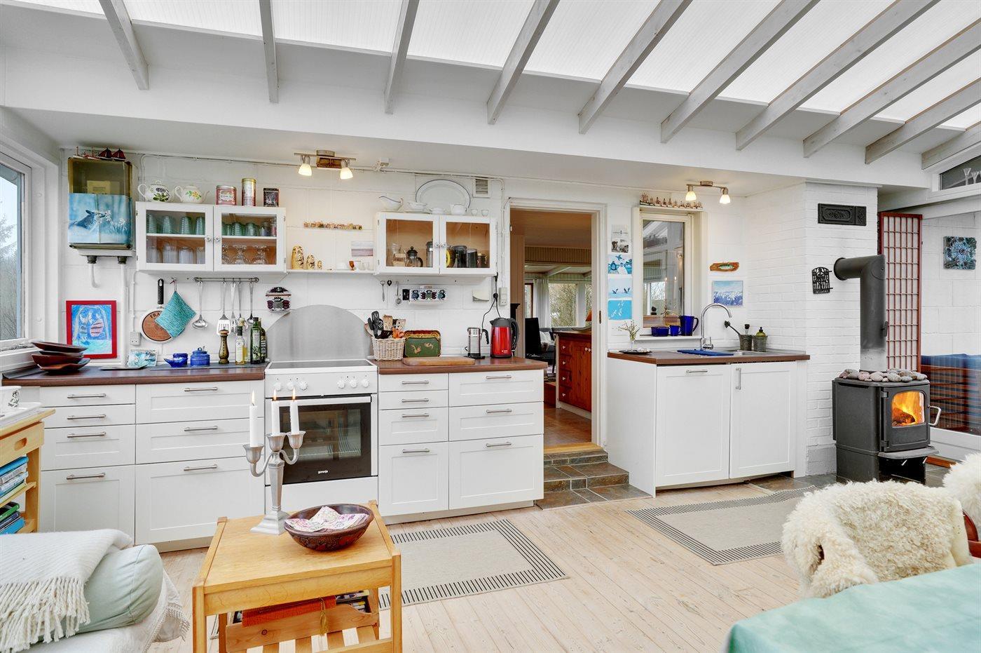 Køkkenet er udstyret med 1 køleskab. Der er 4 keramiske kogeplader, varmluftovn samt opvaskemaskine.